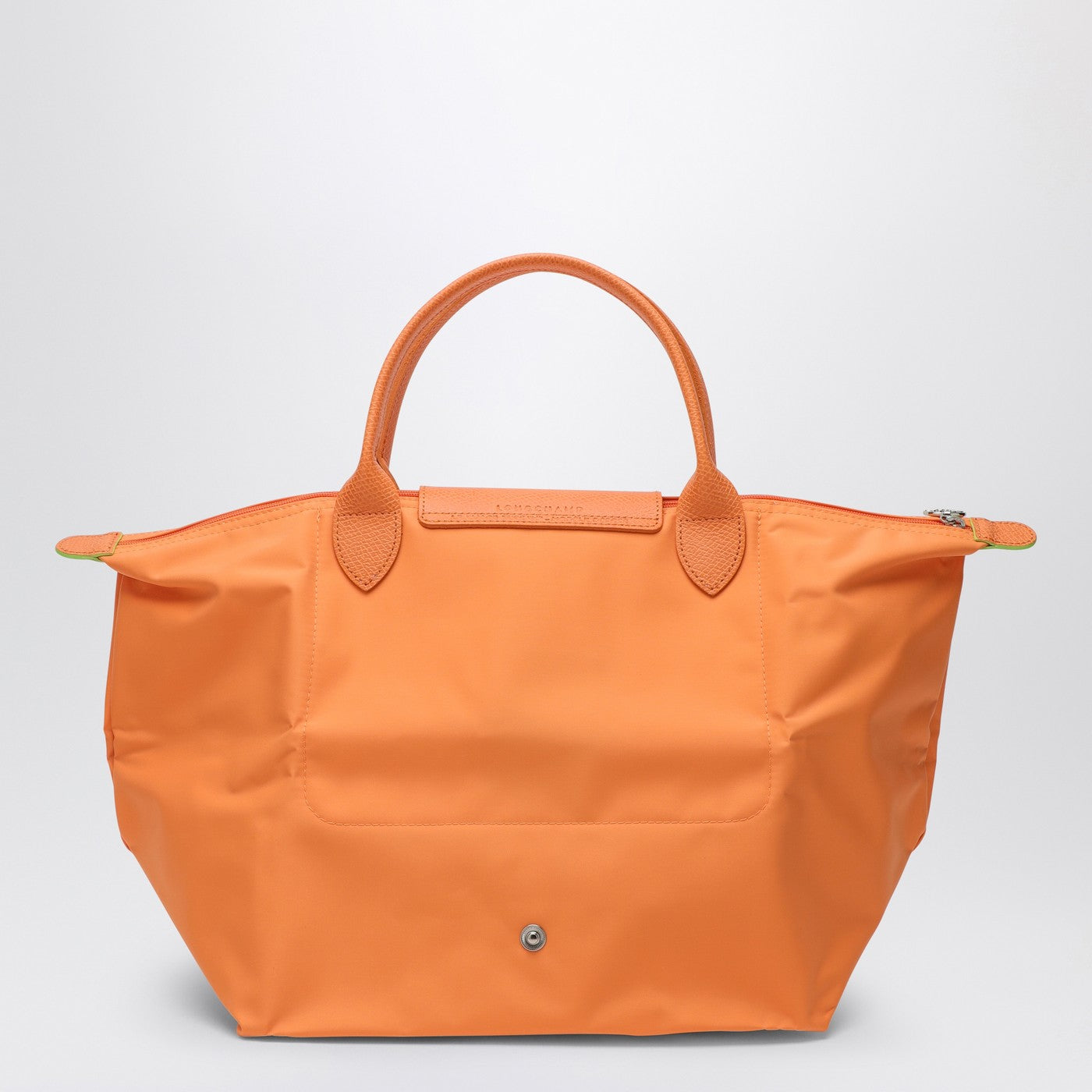 Bolso mediano de Longchamp en tela reciclada naranja, con dos manijas superior de tono en tono, cierre de cremallera y detalles de cuero. Modelo plegable.