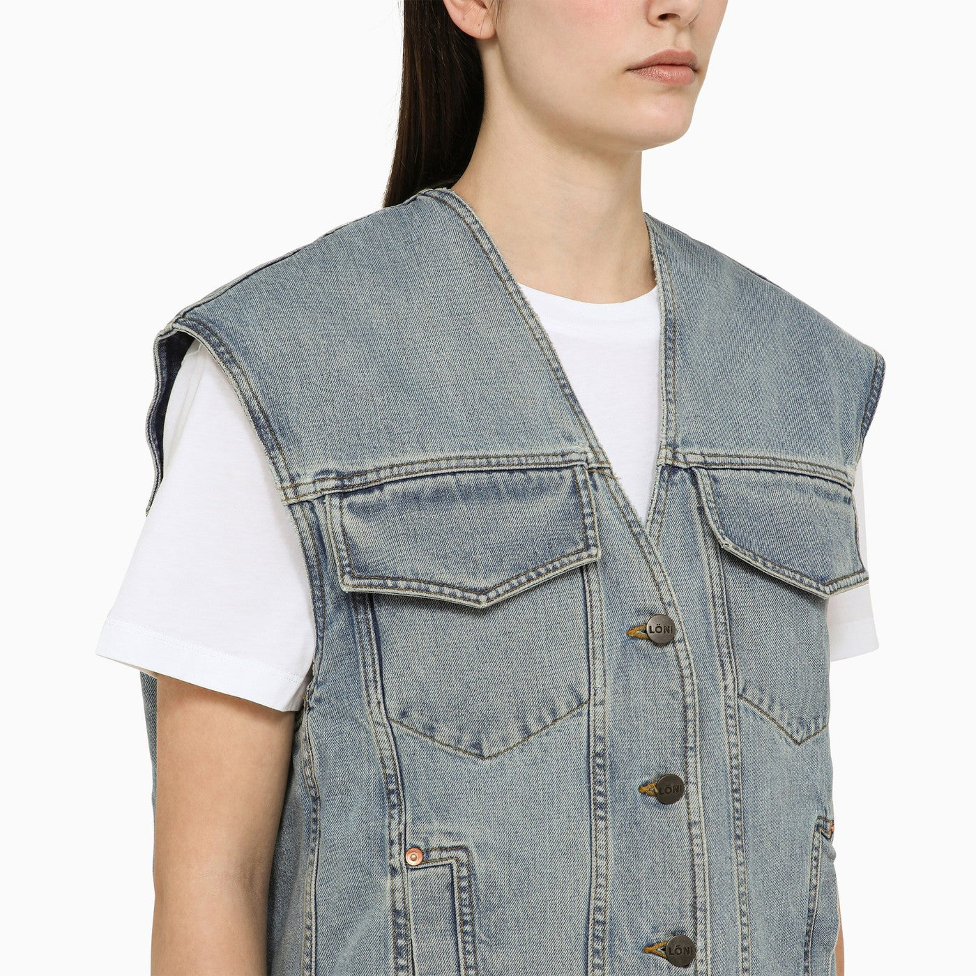 Chaleco de mezclilla de algodón azul vintage de Margaux Lonnberg con un cuello en V, un botón delantero que abrochan, dos bolsillos de ribete y dos bolsillos de colgajo en la parte delantera, un parche de logotipo en la parte posterior y un diseño asimétrico.