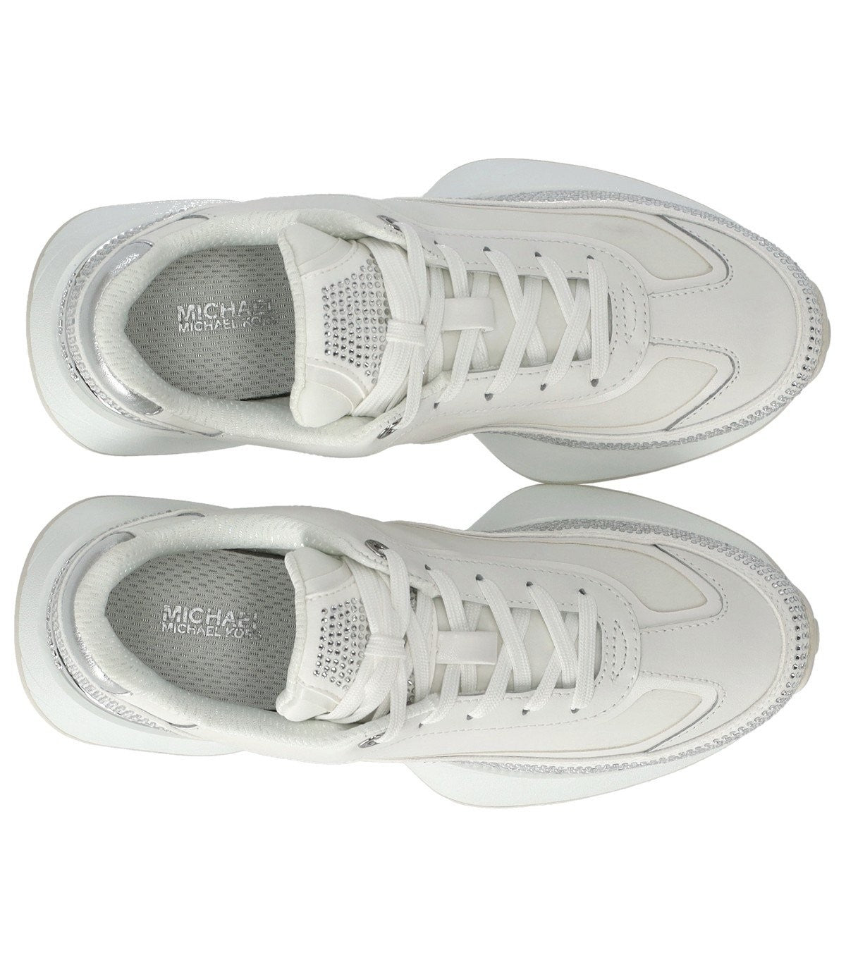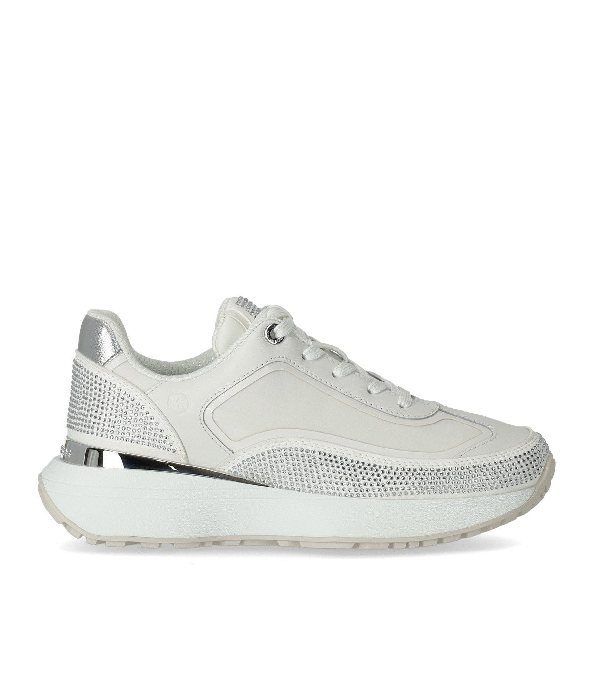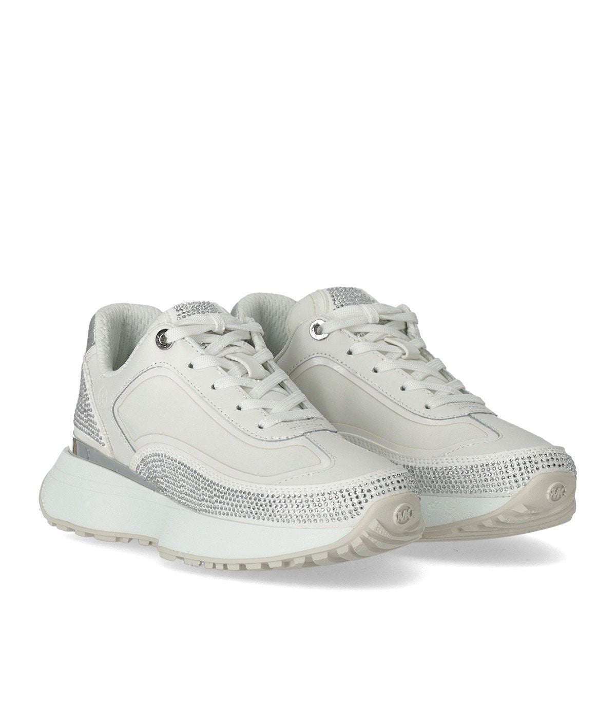 Michael Kors Ari Sneaker hecha de nylon de crema ligera y cuero falso, adornado con aplicación plateada de diamantes de imitación y talón laminado. Reinicio de malla con plantilla extraíble, suela de goma. Altura del talón 4.5 cm.