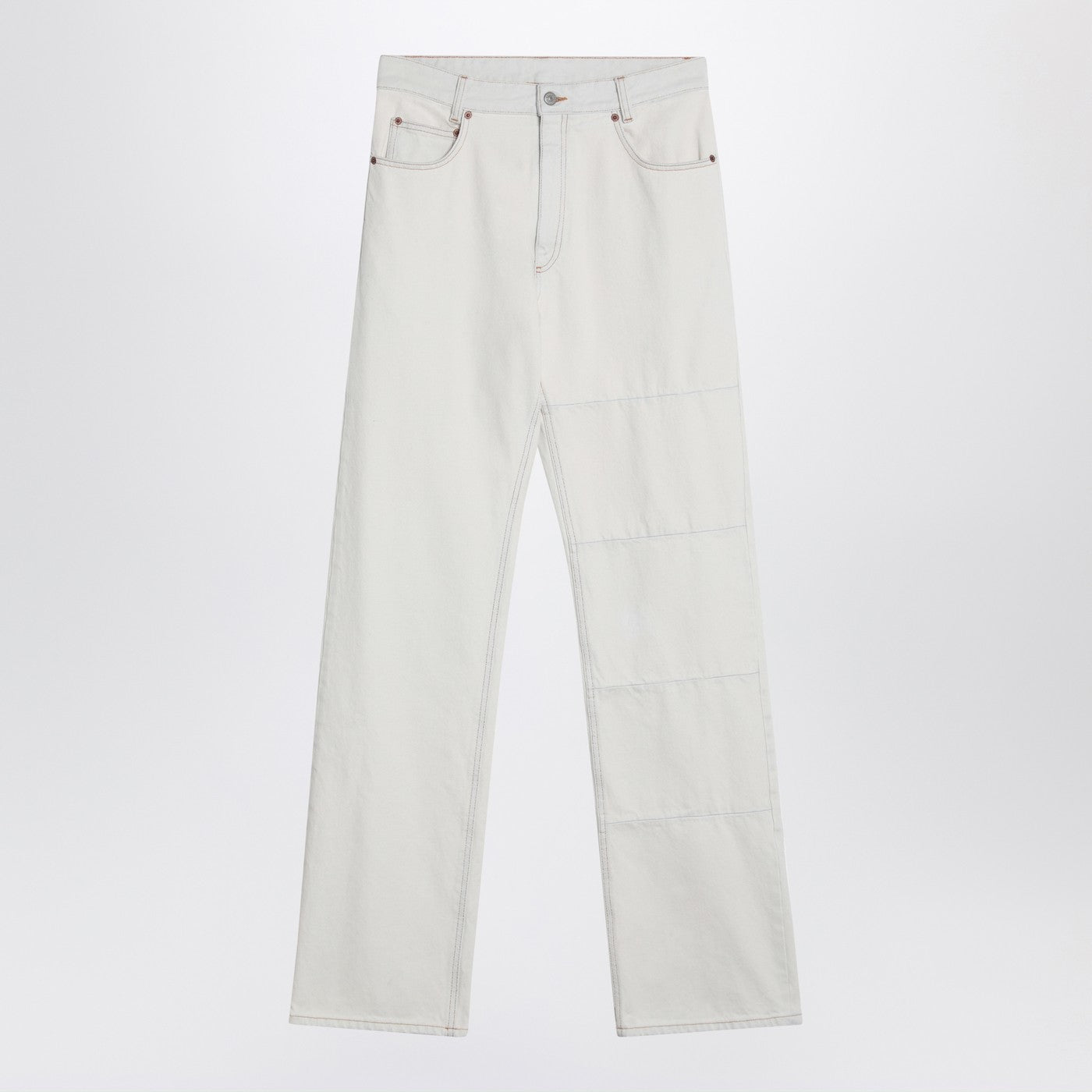 Jeans MM6 Maison Margiela en mezclilla de algodón blanco, con un cierre delantero y cierre de botones, bucles de cinturón, cinco bolsillos clásicos, costuras contrastantes, dos parches de tono en la pierna, una etiqueta numérica en el bolsillo trasero y una línea de costuras blancas en la parte posterior.