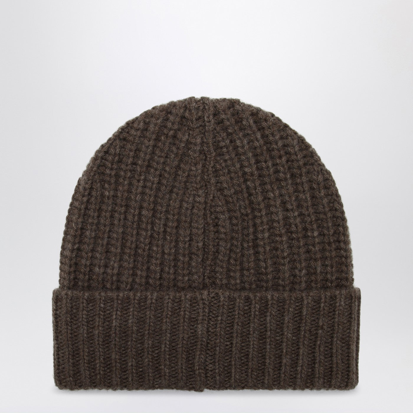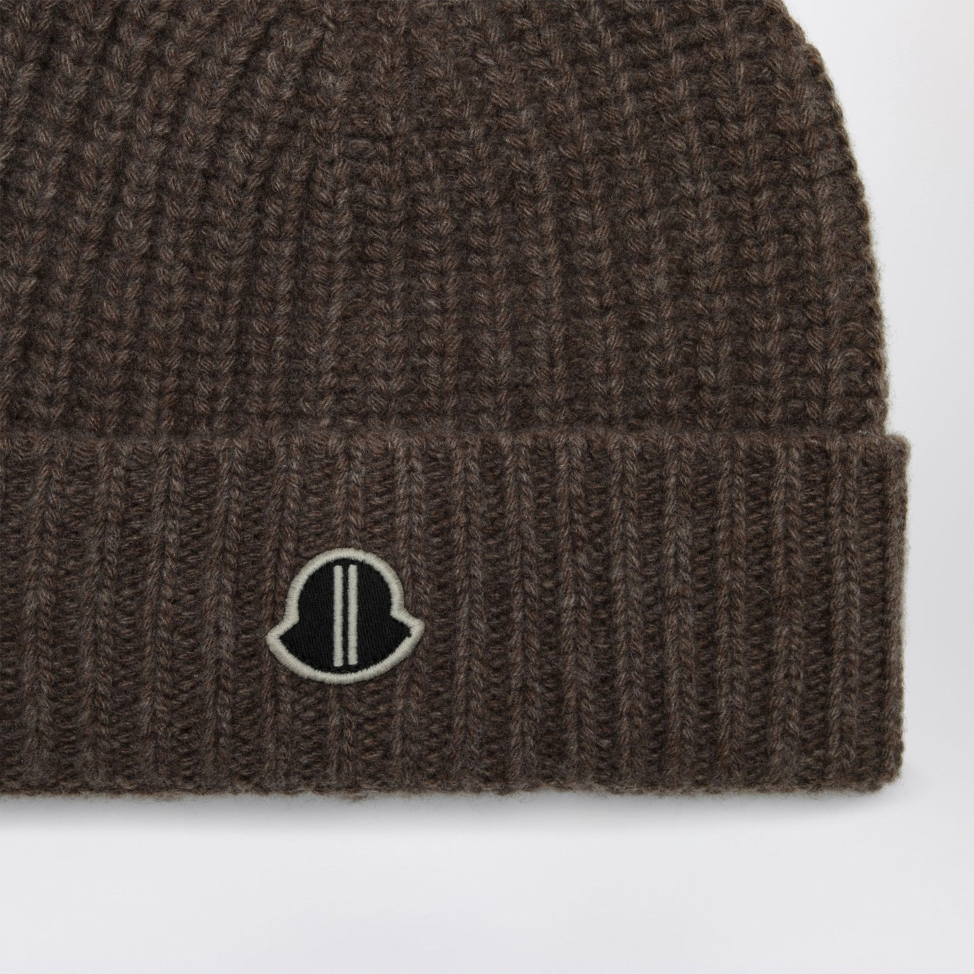Beanie de Moncler en colaboración con Rick Owens en Brown Virgin Wool and Cashmere con un tejido acanalado, con un parche de logotipo delantero y solapa.