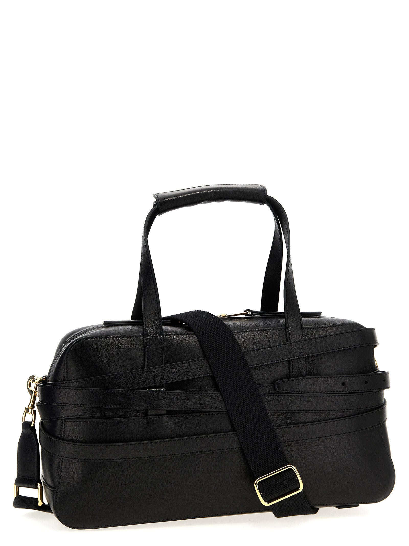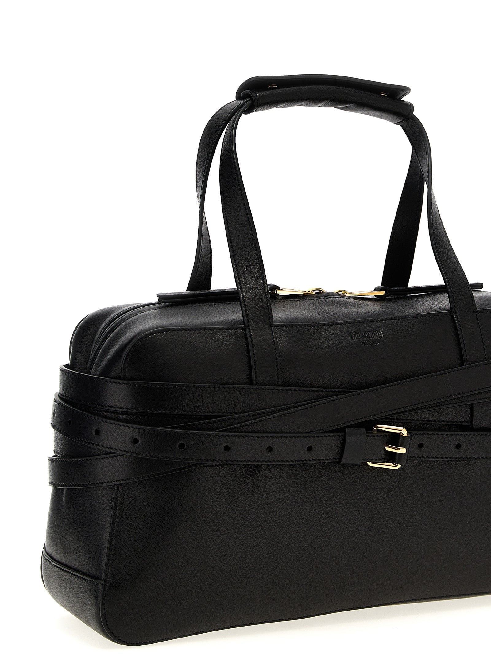 Bolso de cuero 'Moschino Tie Me Bag' con detalle del cinturón delantero, logotipo en relieve delantero, mango doble fijo, cierre de cremallera, correa de hombro de cuero y tela ajustable y extraíble.