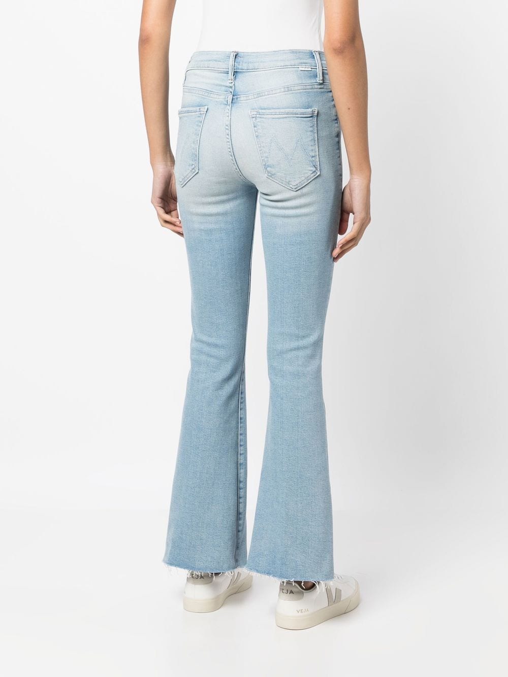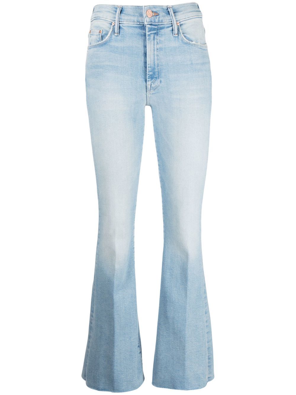 Jeans de mezclilla con patas rectas de la madre con botón frontal y cierre de cremallera, cinco bolsillos clásicos, azul claro, mezcla de algodón, bucles acampanados y de cinturón.