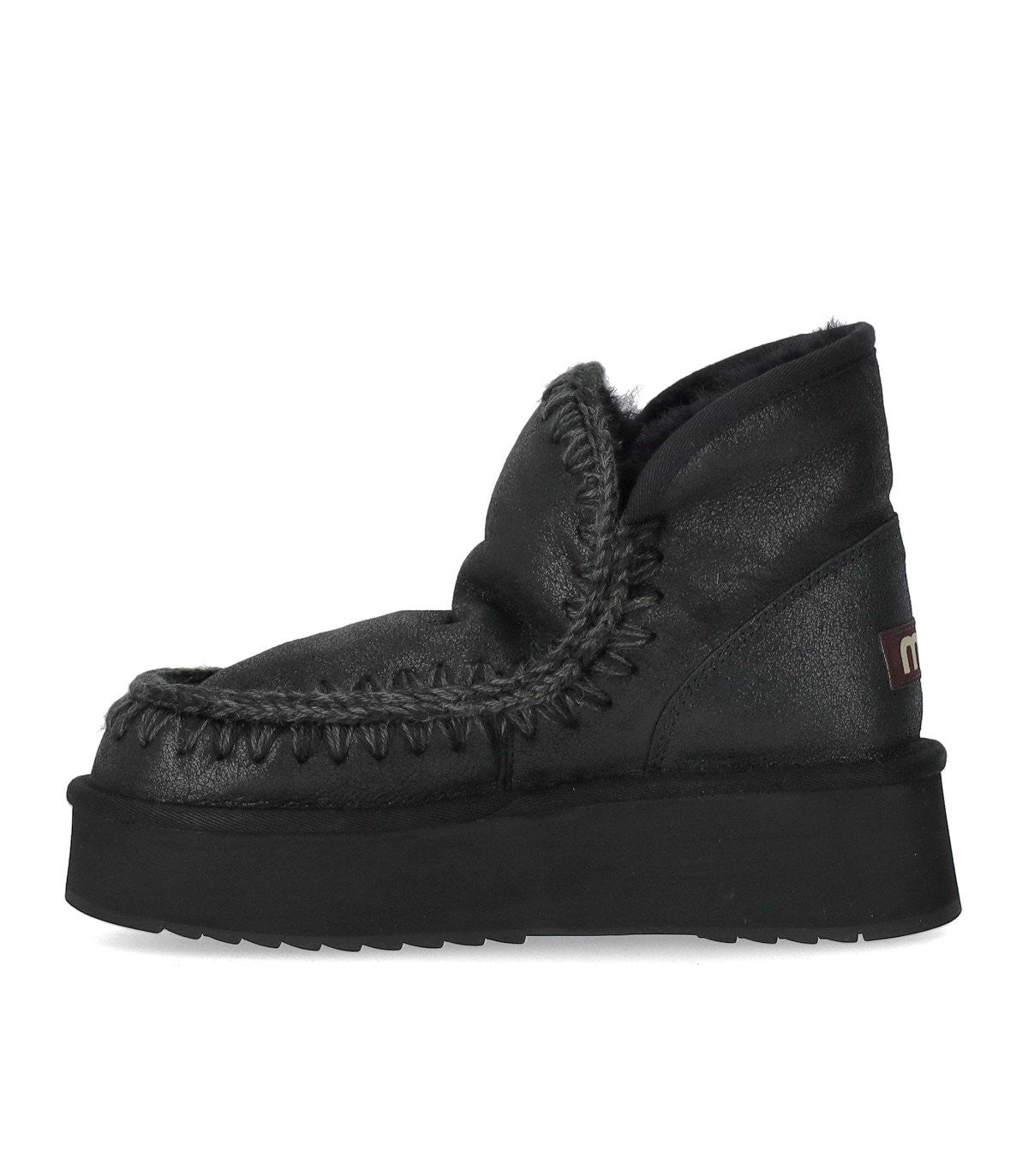 Mou Eskimo Platform Toble Boot, hecho de gamuza de alta calidad, en negro terminado con perfiles metálicos. Caracterizado por costuras de lana de crochet, presenta una suela de goma EVA. Interior forrado con piel de oveja cálida. Altura única, 4 cm.