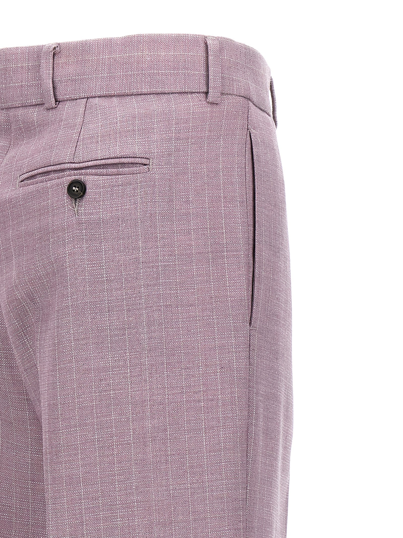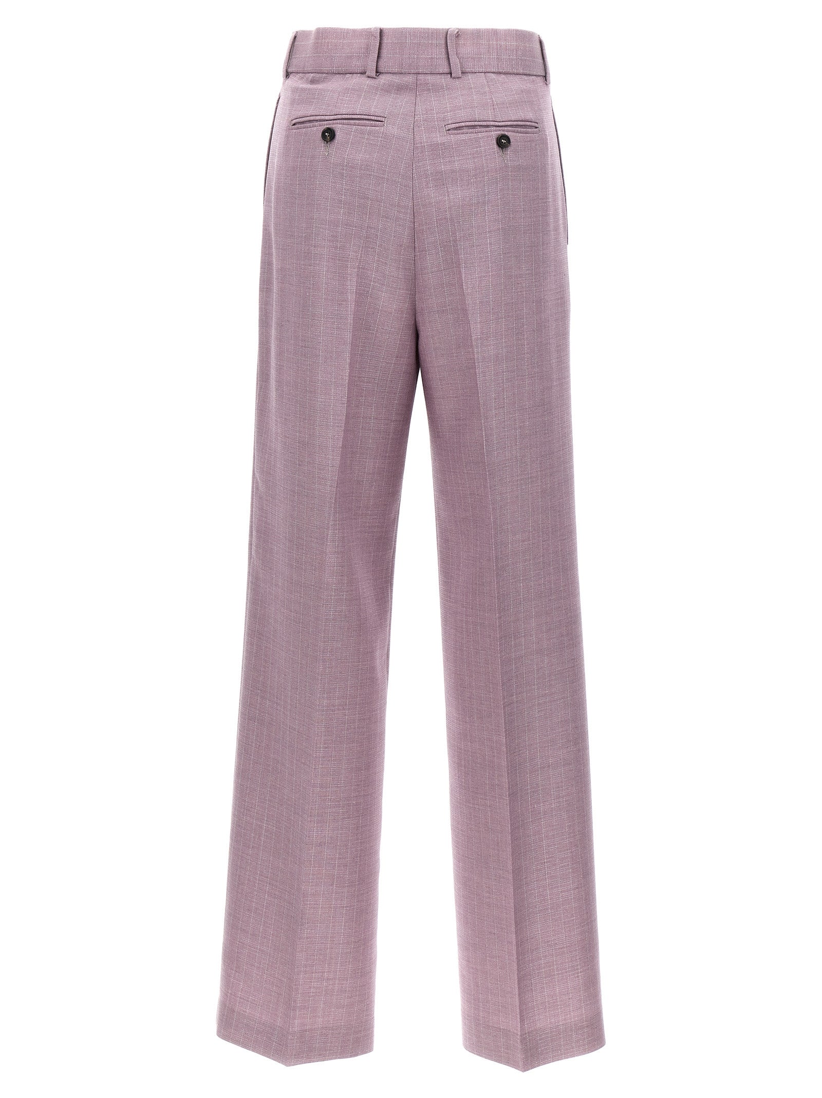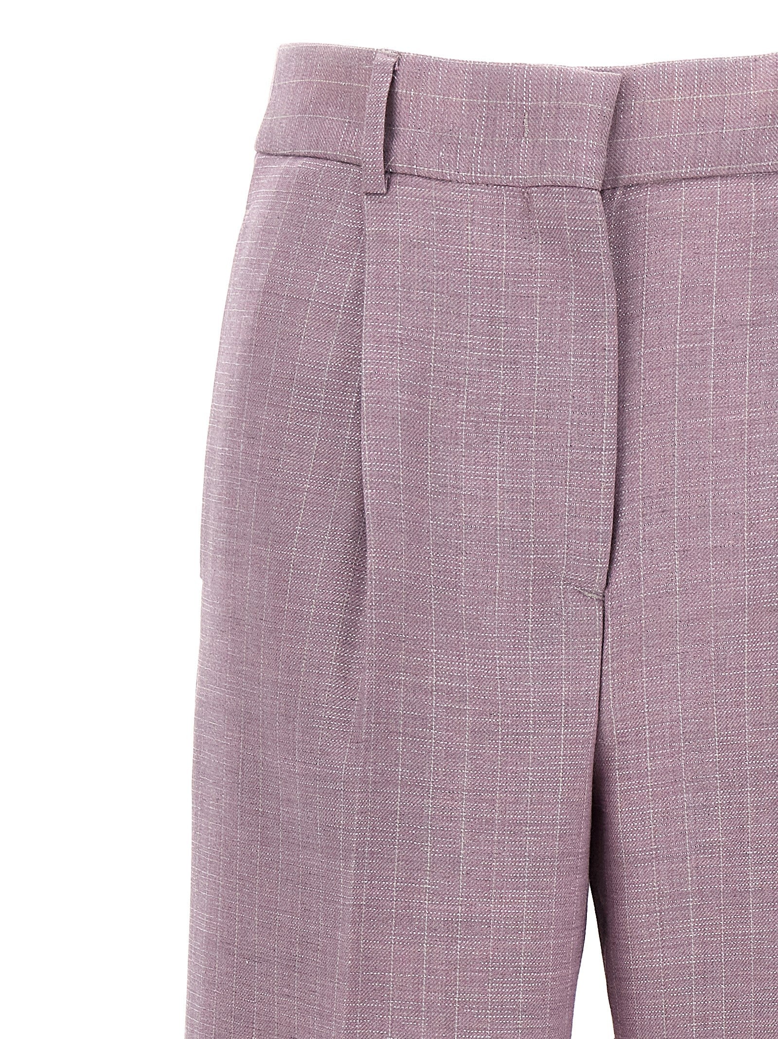 Los pantalones de rayas en lana se mezclan con hilo de Lurex, peniques y pliegues centrales, bolsillos, gancho y cierre de cremallera.