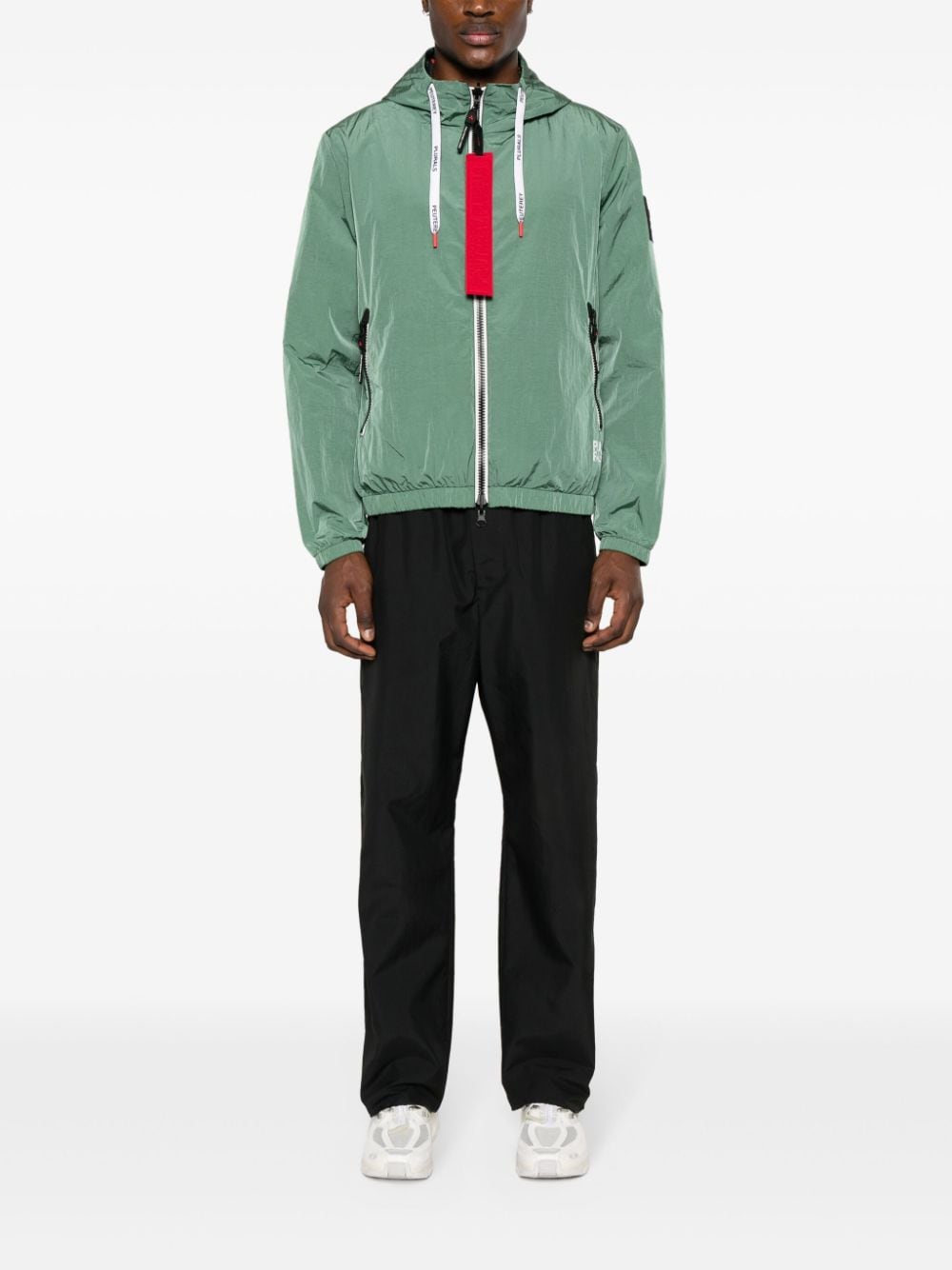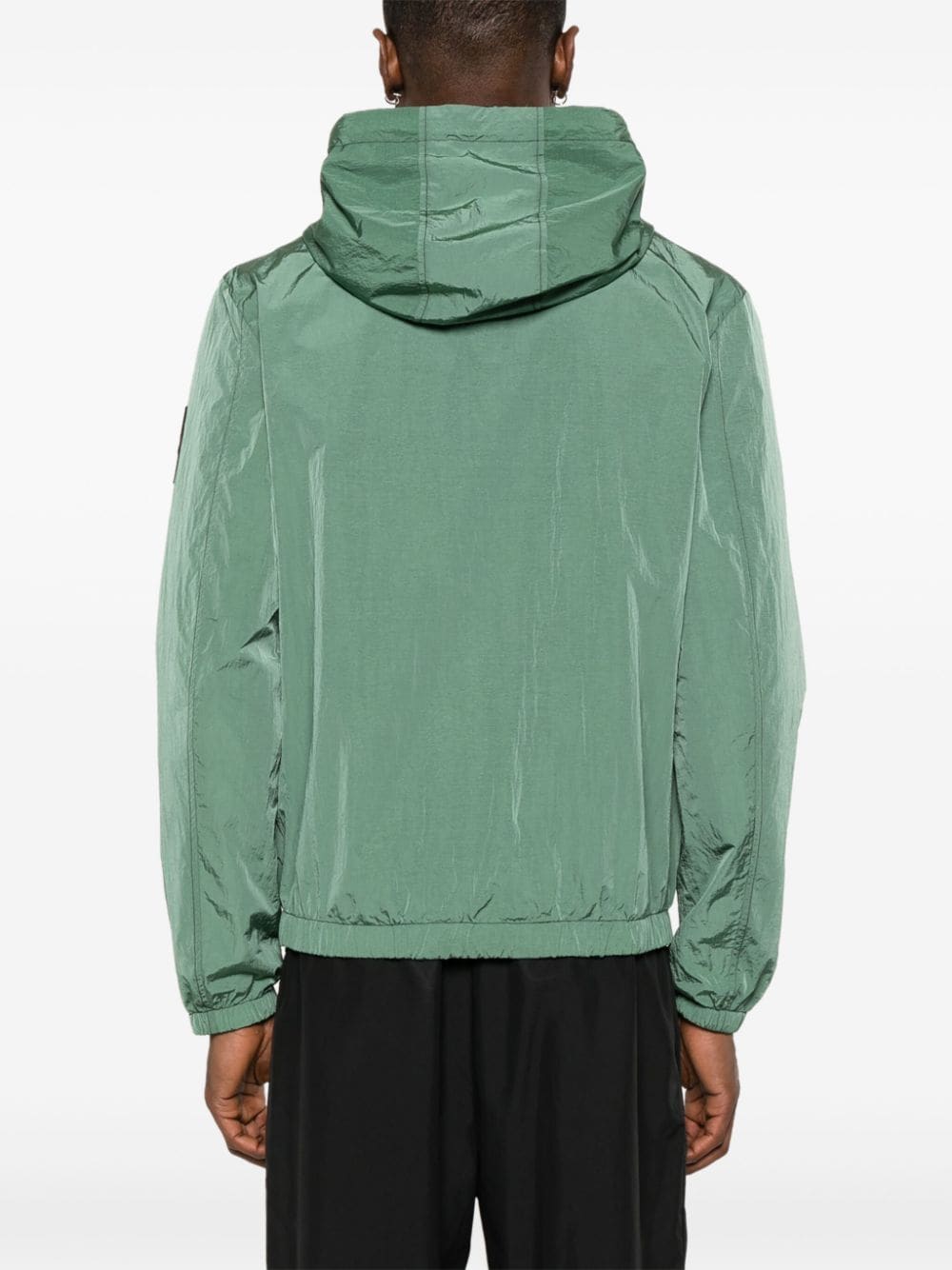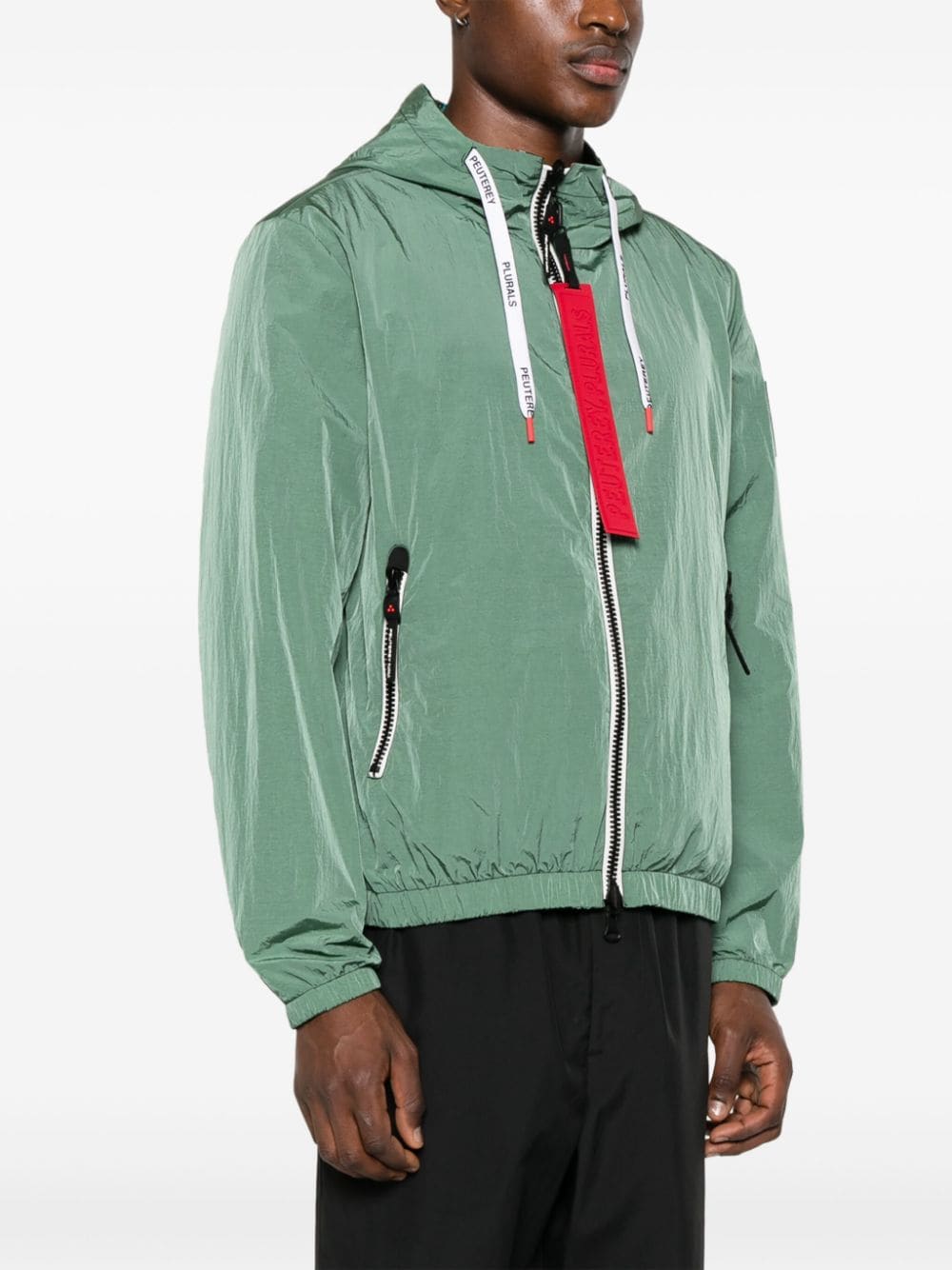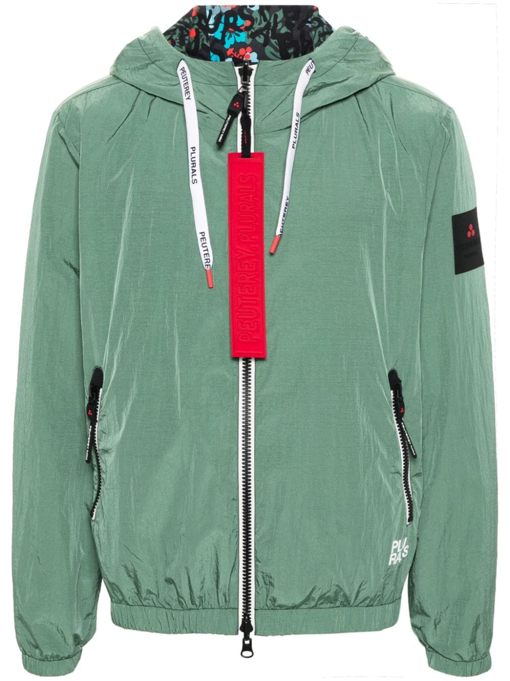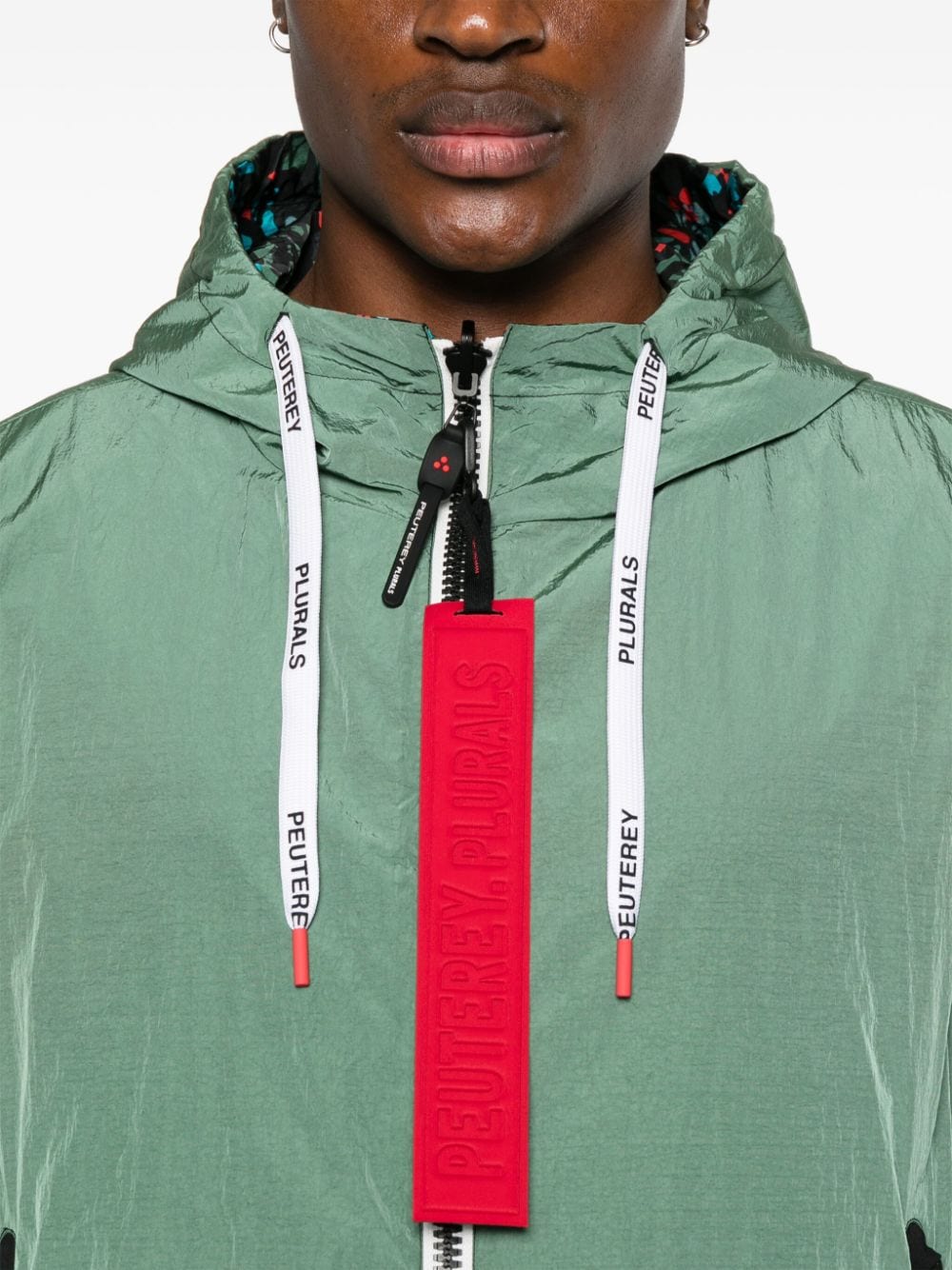 Acabado arrugado de concha verde oscuro Munas largas del embudo de capucha reversible con el logotipo de puños elásticos en la manga Dos bolsillos con cremallera laterales Impresión del logotipo de la impresión floral de la impresión floral del extractor de la marca elasticada del dobladillo