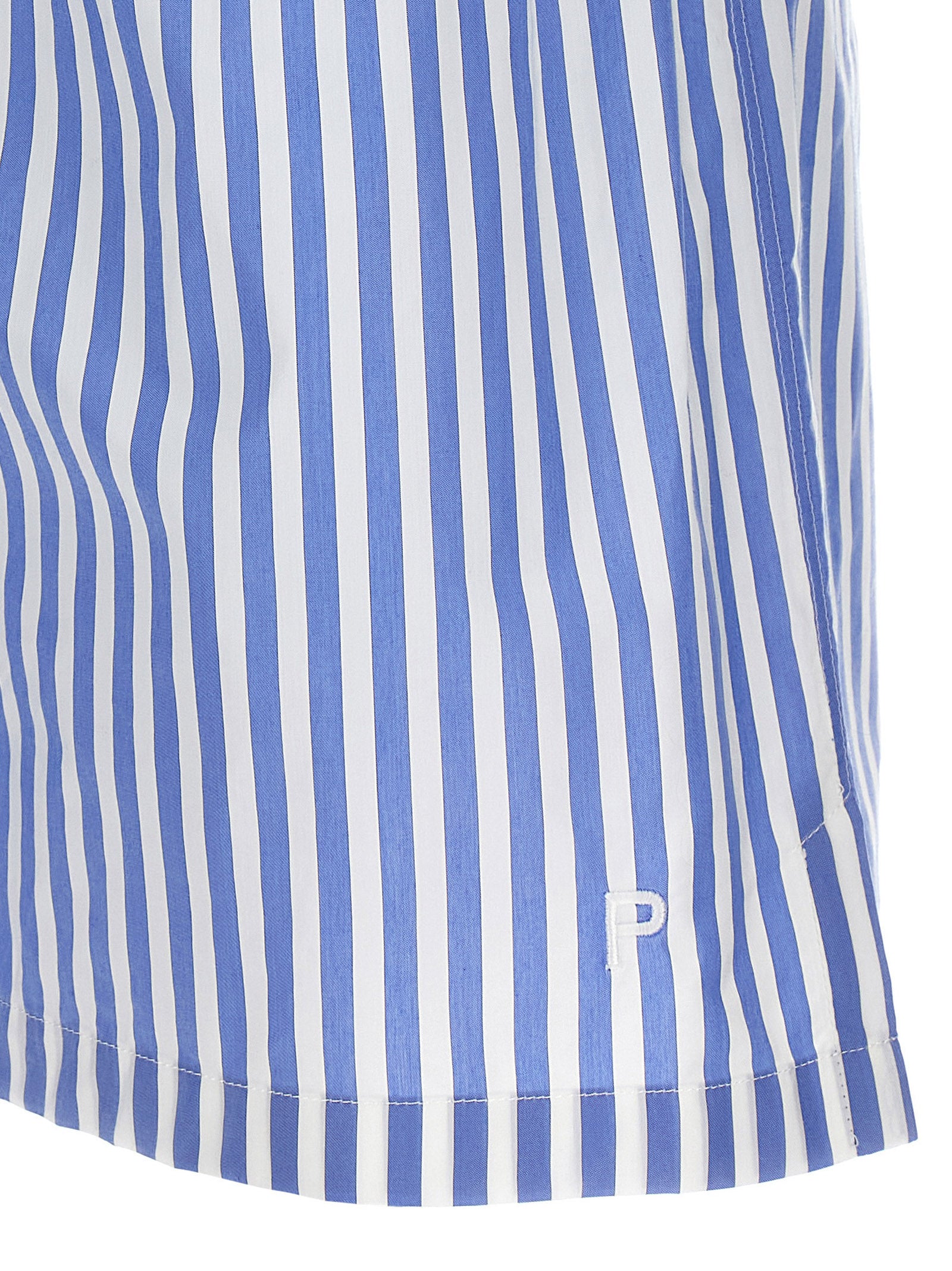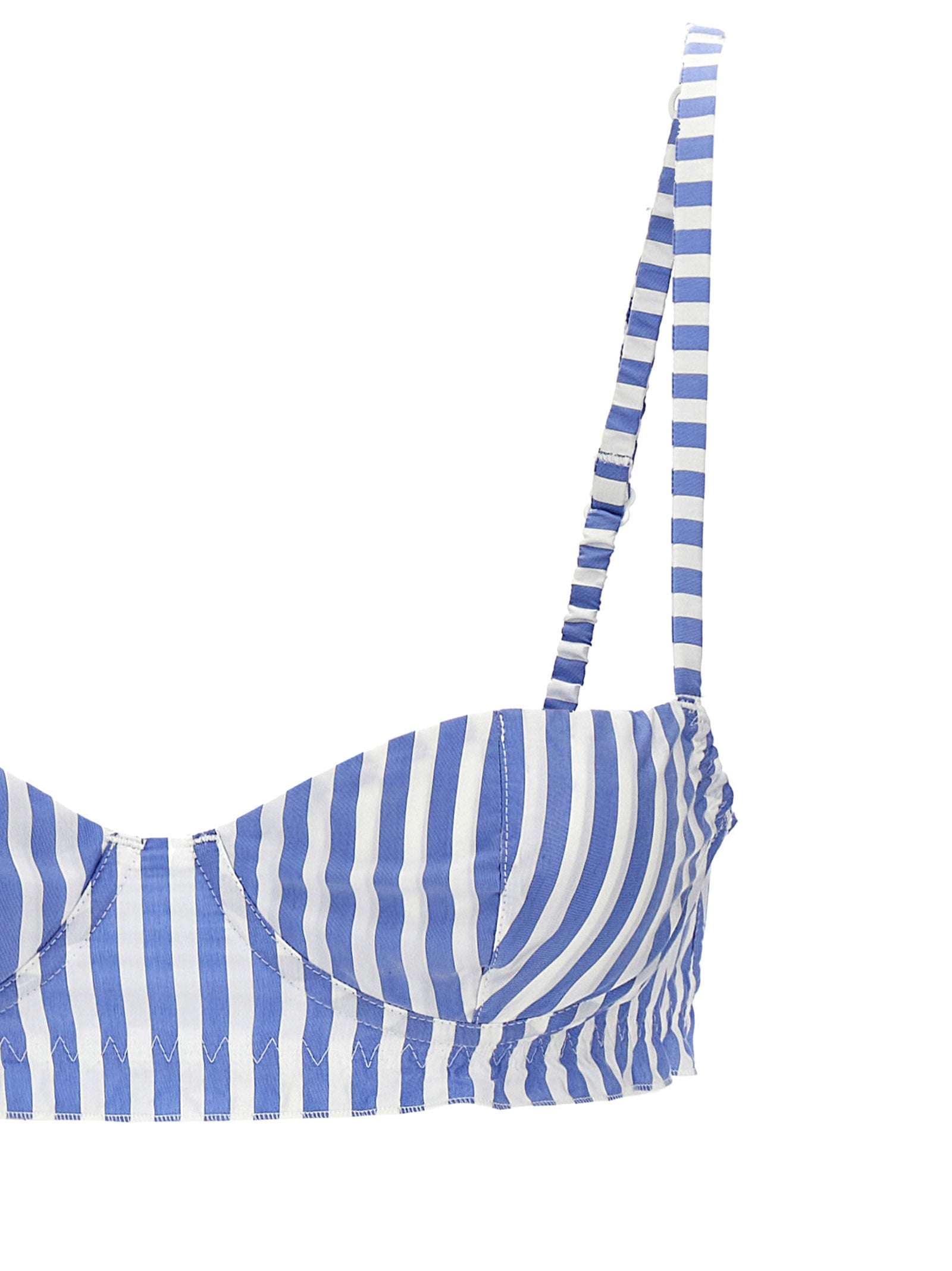 El traje de mezcla de poliamida a rayas y algodón que consiste en sujetador de balcón con volantes, correas ajustables, cierre de gancho, taza de altura y pantalones cortos con cintura elástica y colgajo con botón, bordado del logotipo delantero, ranuras laterales.