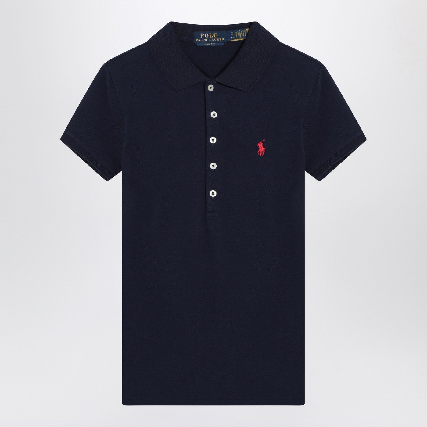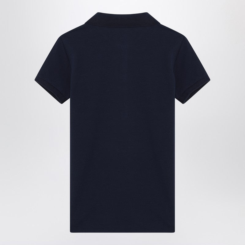 Navy blue cotton Polo Ralph Lauren polo shirt, featuring an embroidered logo on the chest, front buttons, side vents and short sleeves.