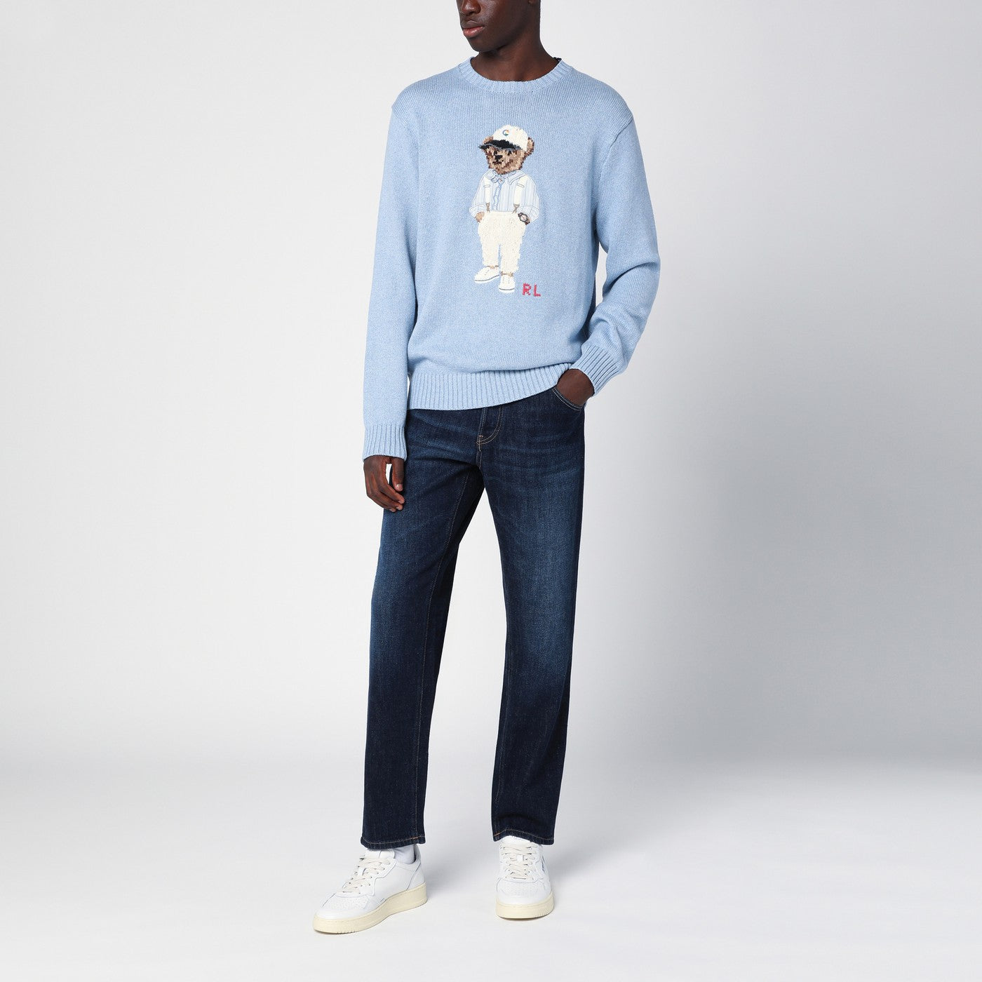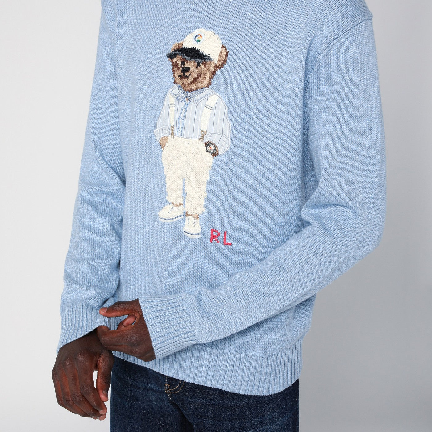 Jumper de cuello de tripulación de Polo Ralph Lauren en algodón azul claro, con incrustaciones de oso de polo y bordado RL en la parte delantera, collar acanalado, puños y dobladillo.