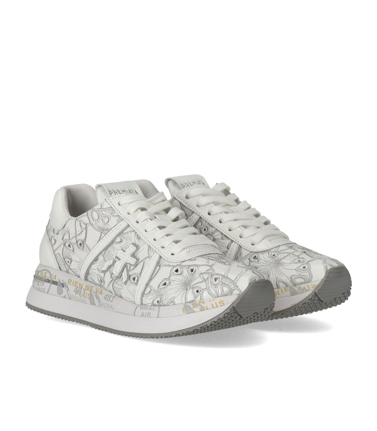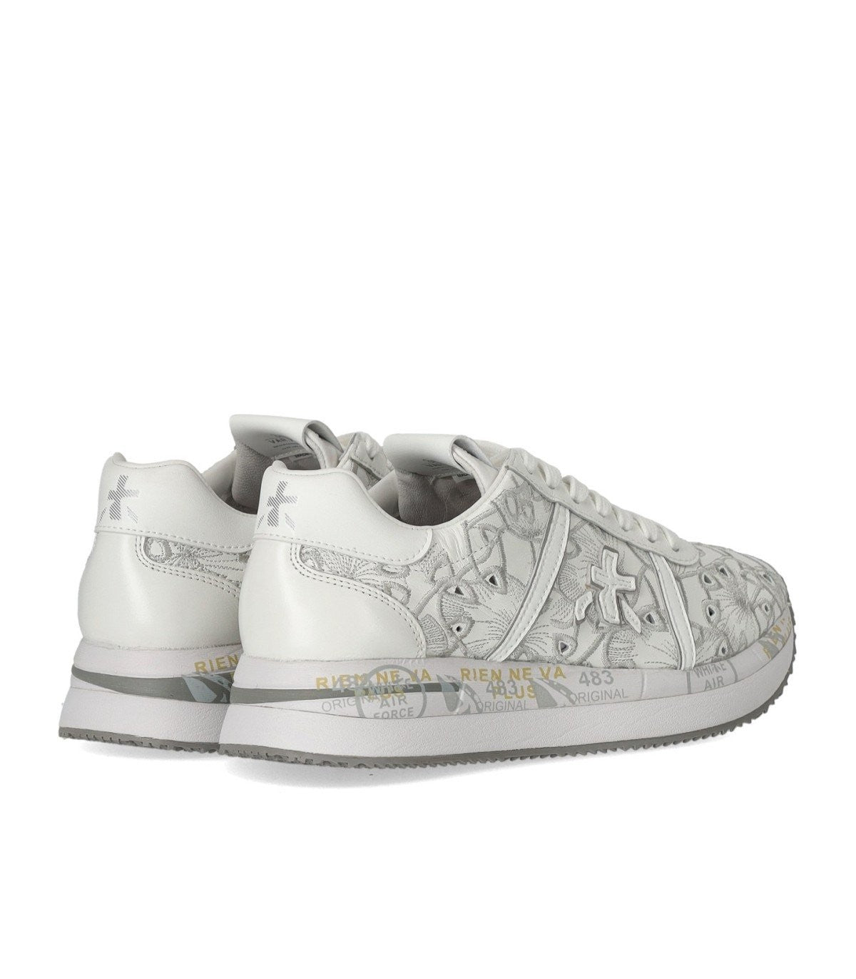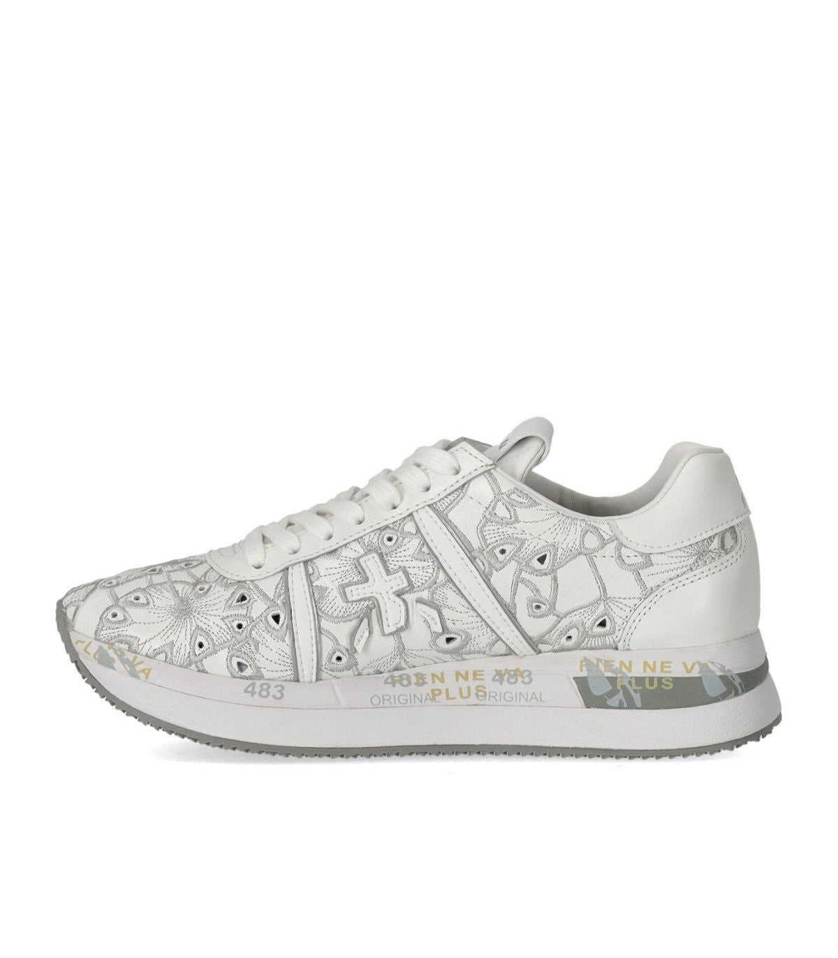 Conny 7364 Sneaker por premiata hecho de cuero con inserciones de nylon en tonos de detalles blancos y grises. Caracterizado por una decoración de bordado floral en la parte superior, presenta un logotipo bordado en el costado y los cordones de algodón. Logóguardia en cuero blanco. Lingo de cuero, plantilla de cuero logo extraíbles. Tacón logo en cuero blanco. Suela de goma adornada con impresiones de marca típicas. Altura 3.5 cm.