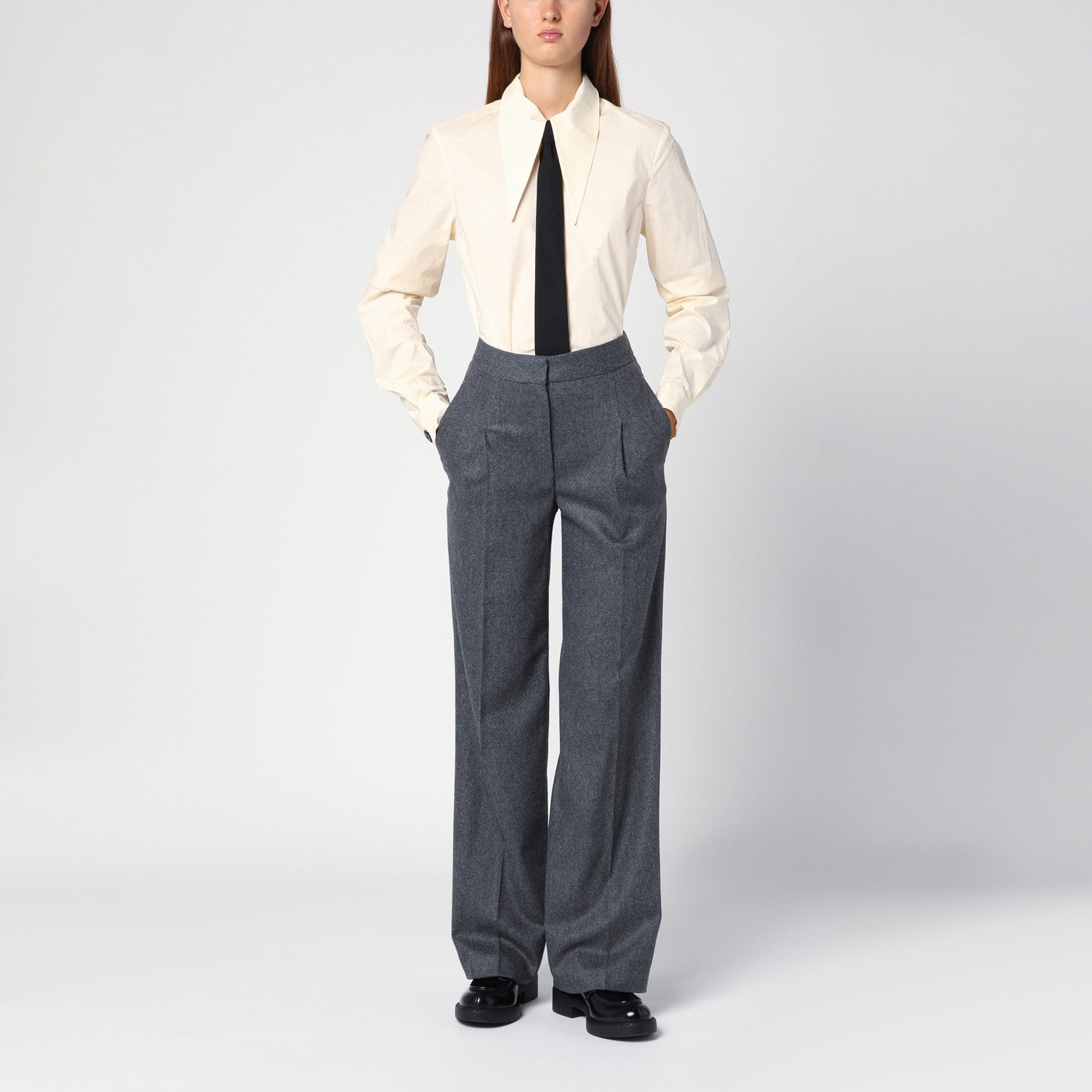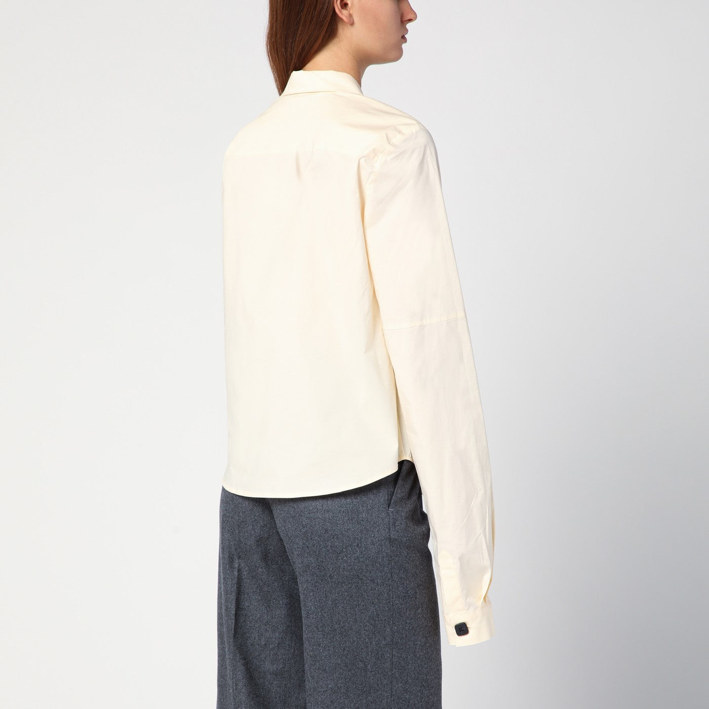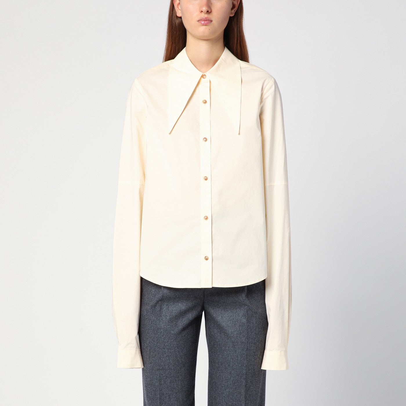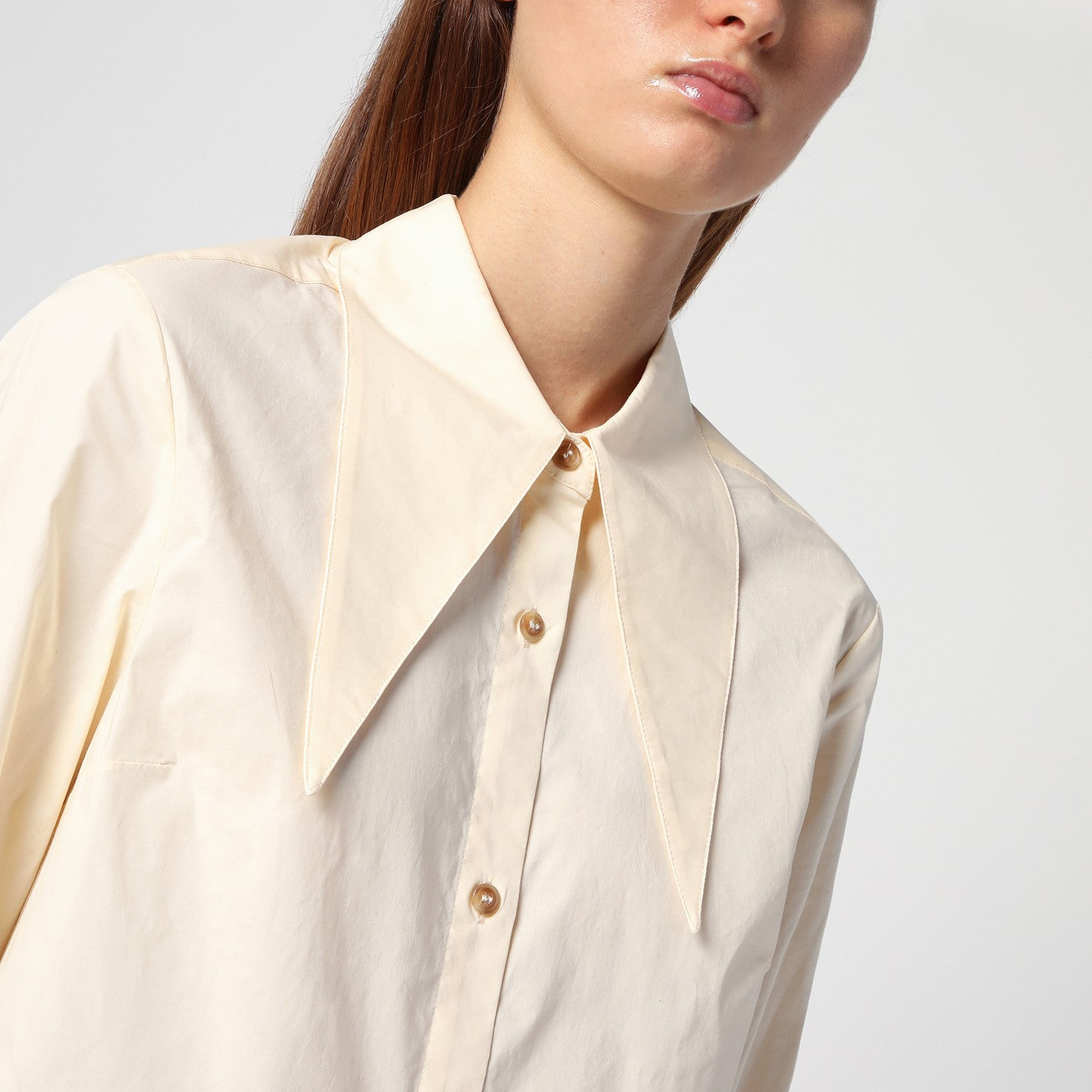 Vanilla coloured cotton shirt from The Garment featuring long sleeves with buttoned cuffs, maxi pointed collar, front button placket and curved hem.