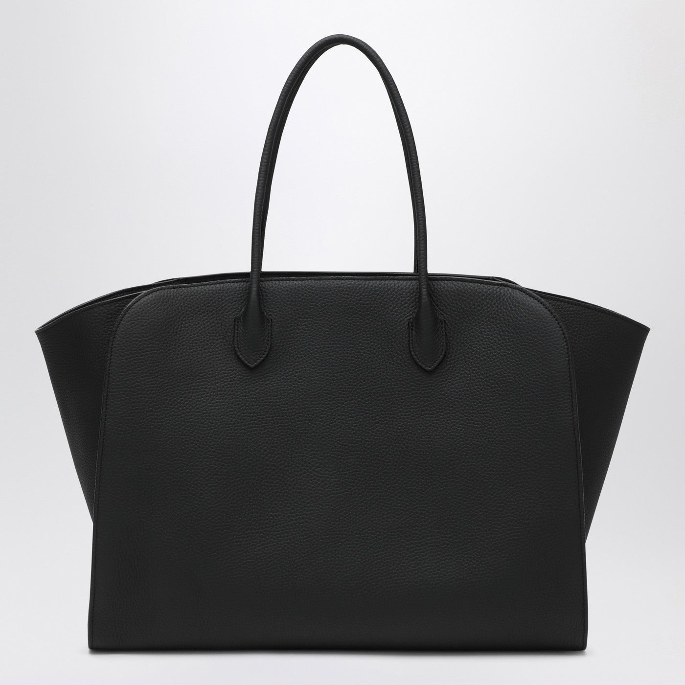 La bolsa de bolsas de cuero negro de fila, con dos manijas tubulares, paneles de pliegues laterales, forro de tela y un bolsillo interno.