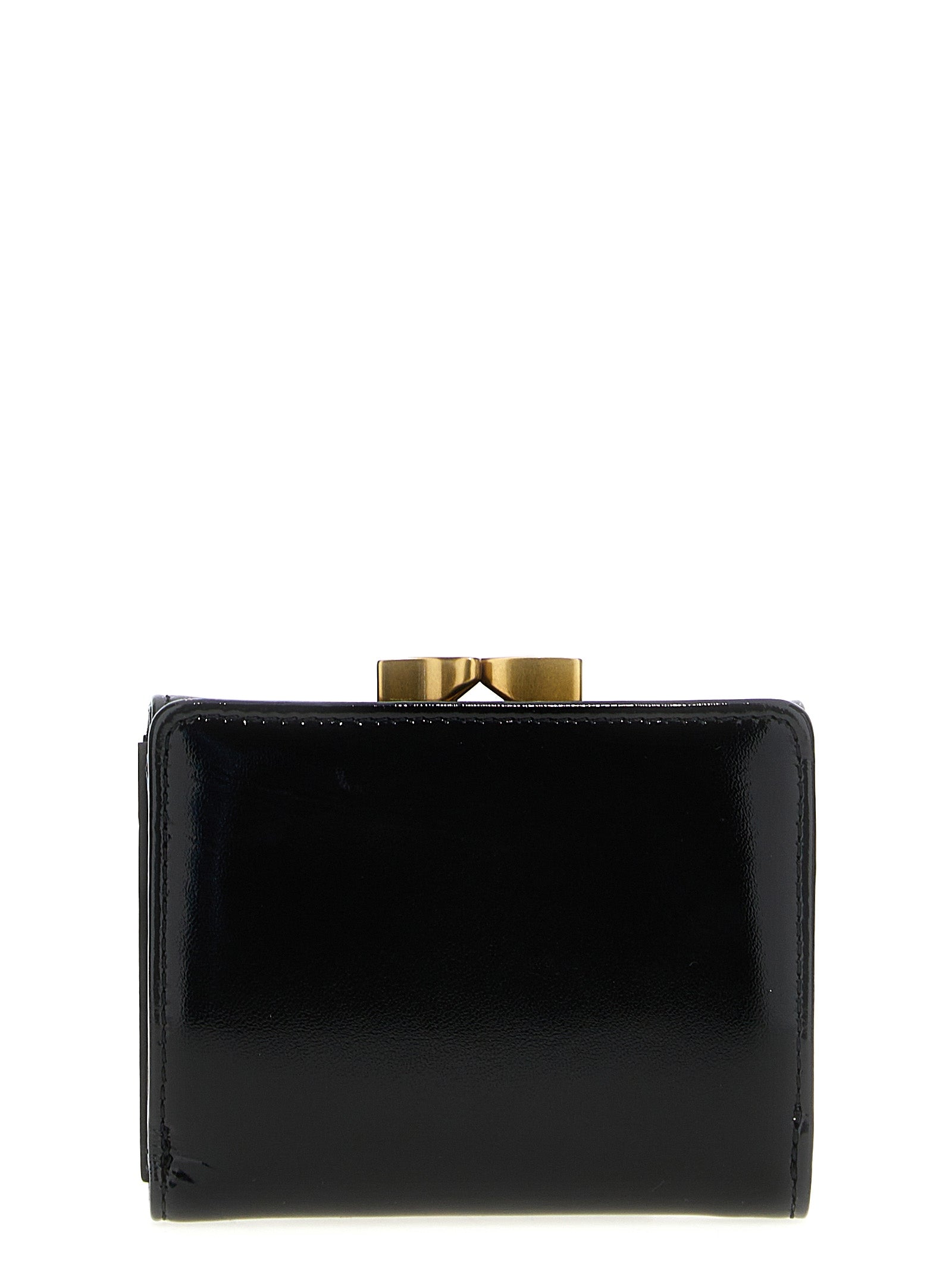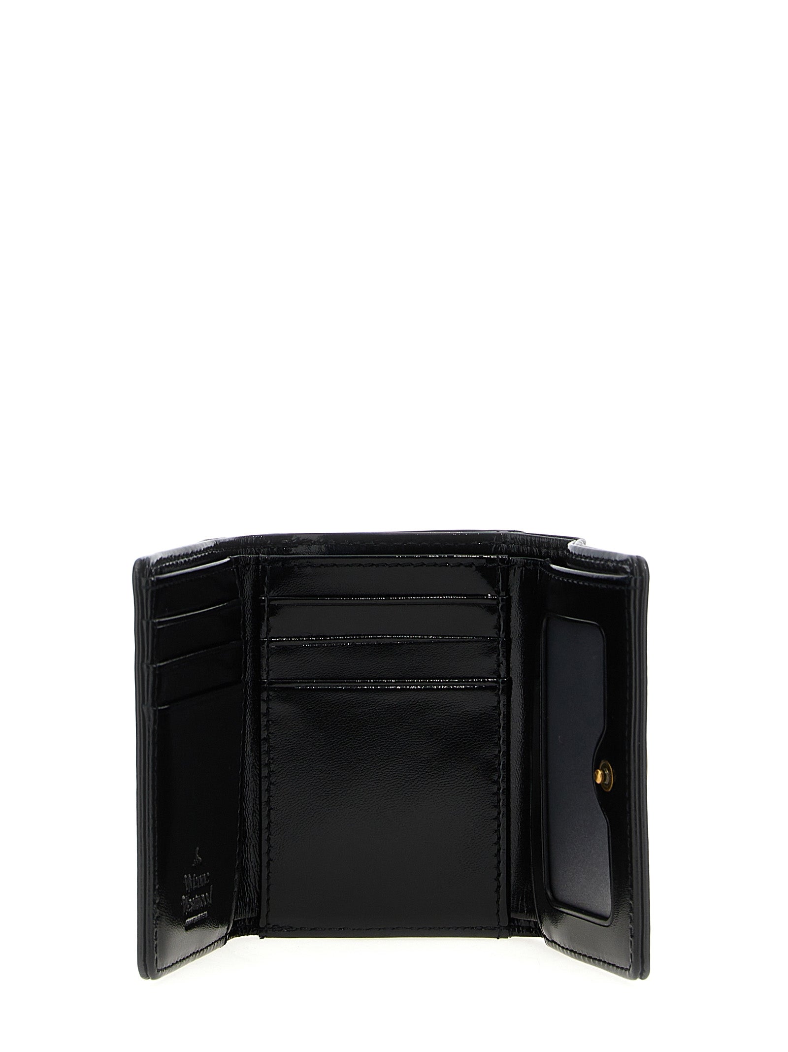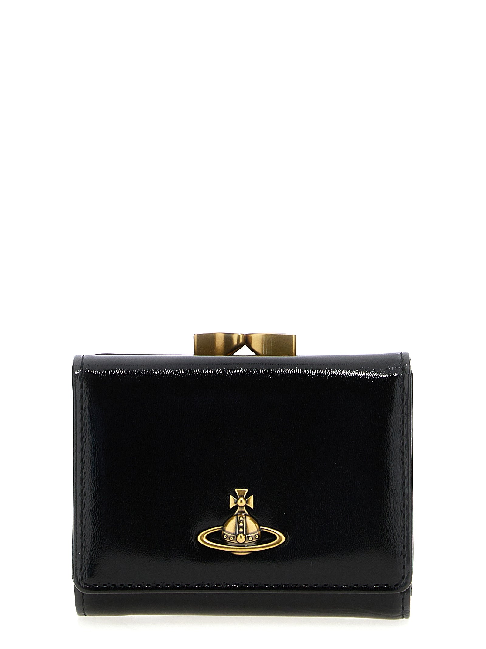 Leather wallet, metal Orb logo on the front, flap closure with snap button, snap closure.