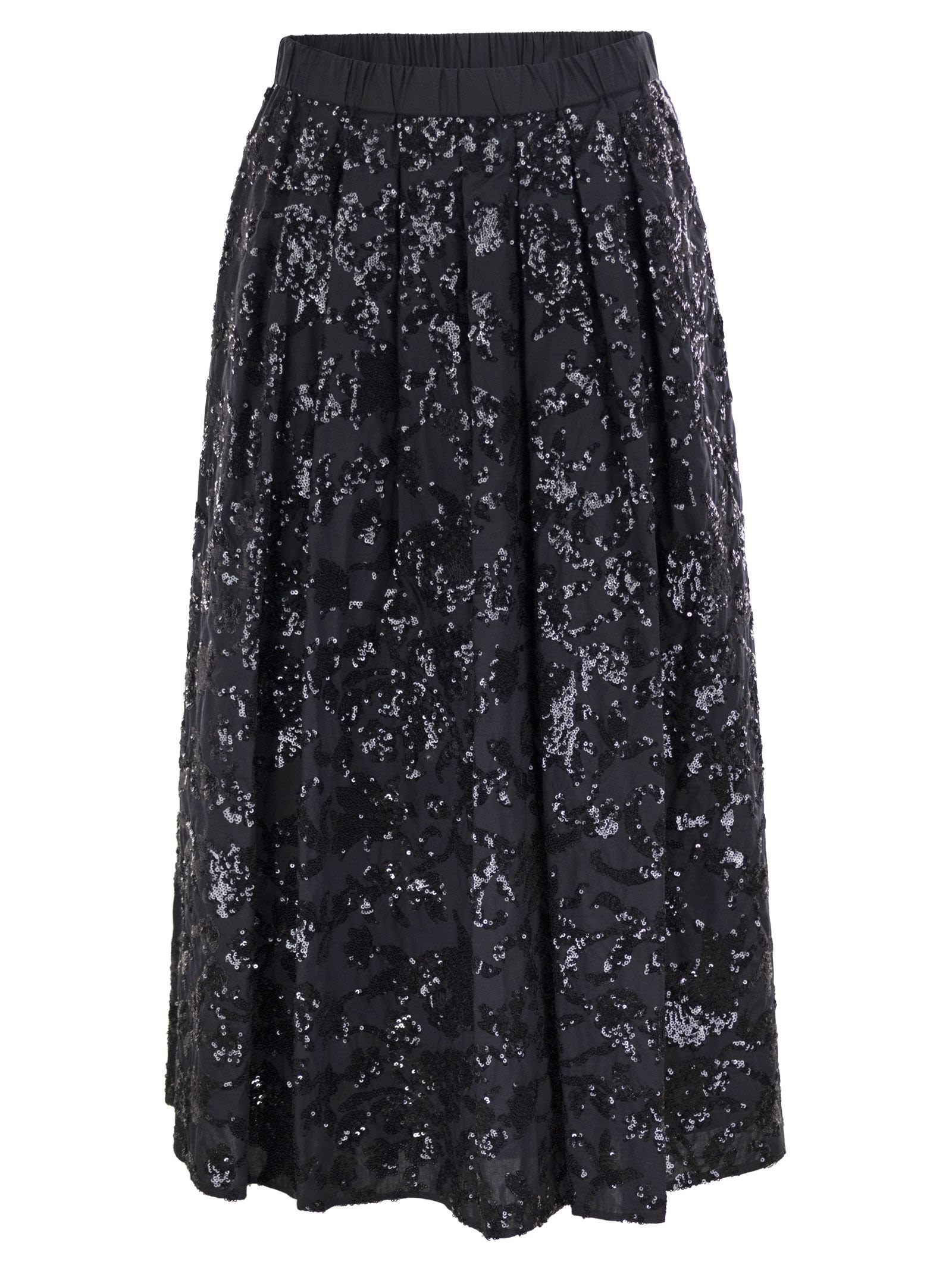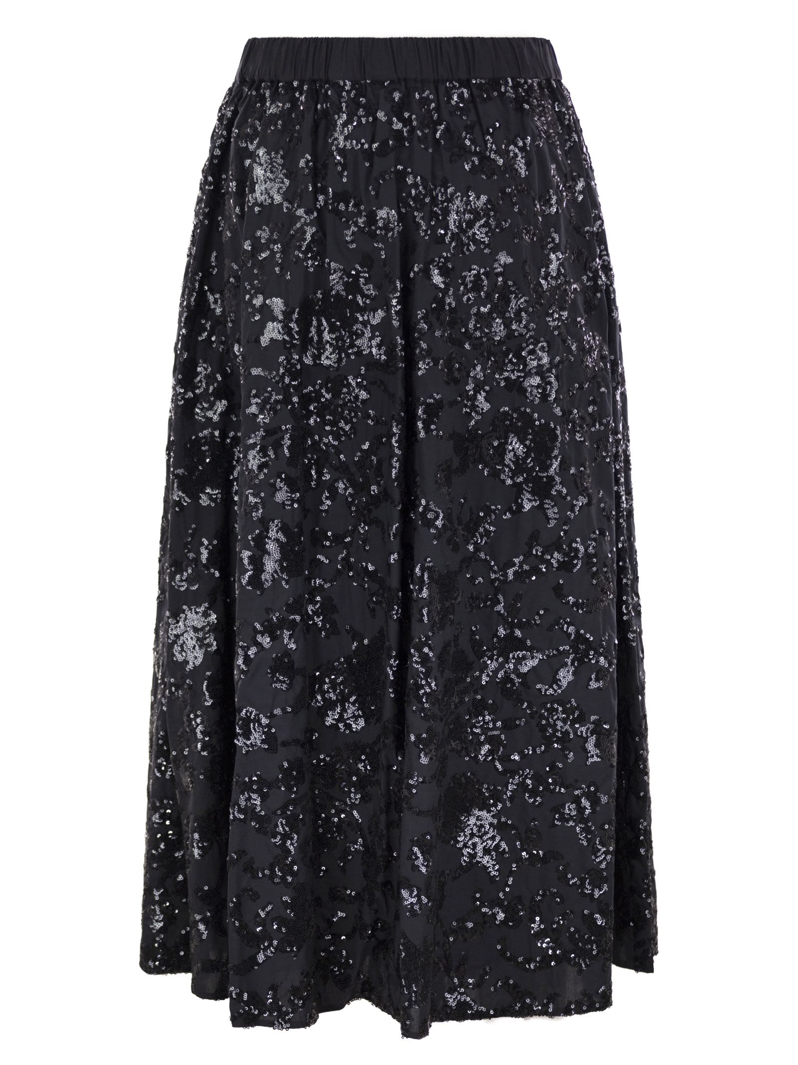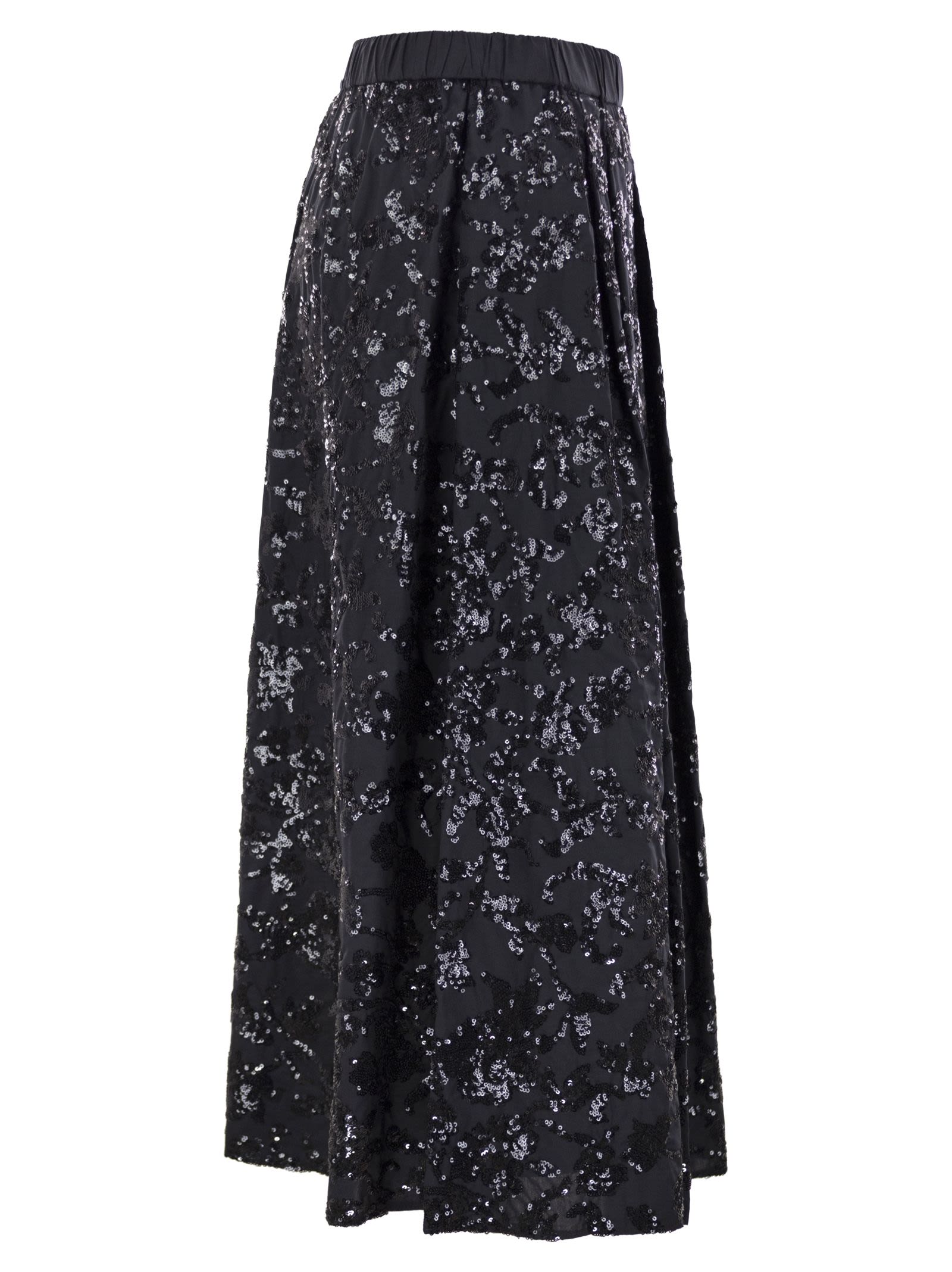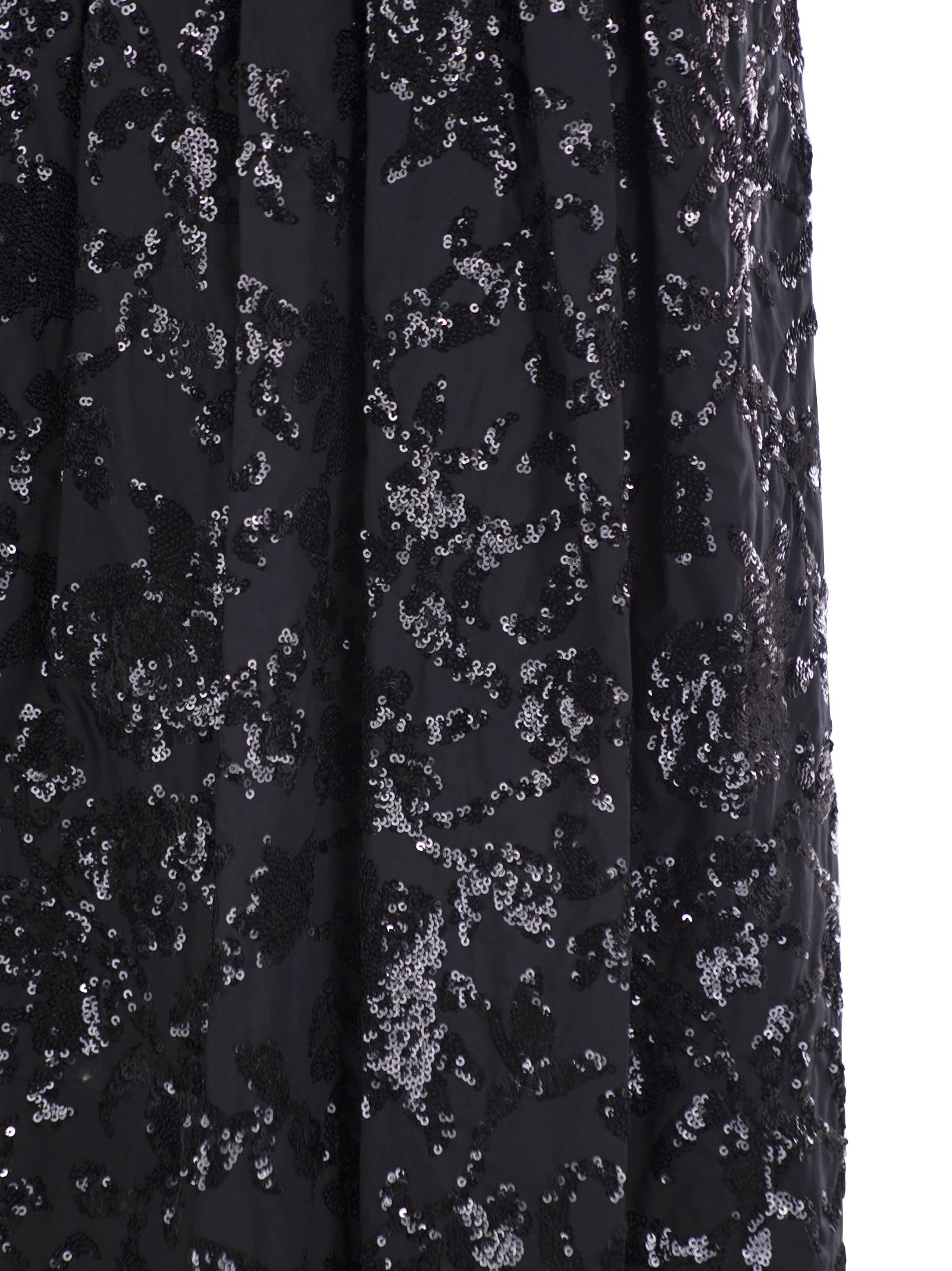 Falda de gran volumen hecha de tela de algodón, adornada con un motivo de micro lentejuelas de todo el bordado. Modelo forrado, terminado con cintura elástica y bolsillos insertados en las caderas. Ajunte de cremallera lateral. - cintura elástica - bolsillos laterales - bordado de lentejuelas - forro en la identificación del diseñador interior: 2425106101600 001