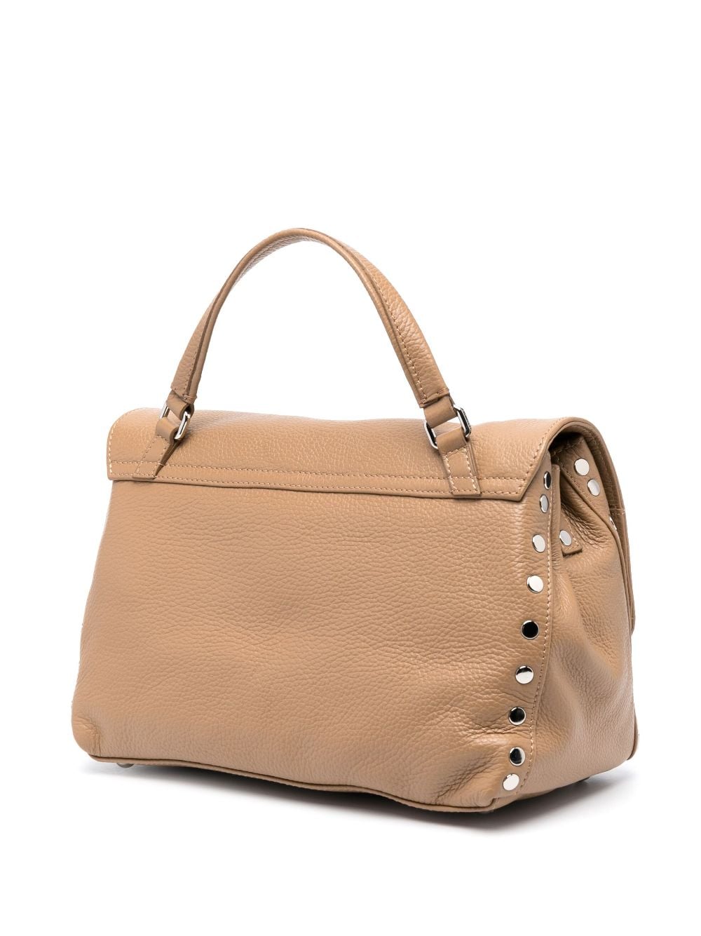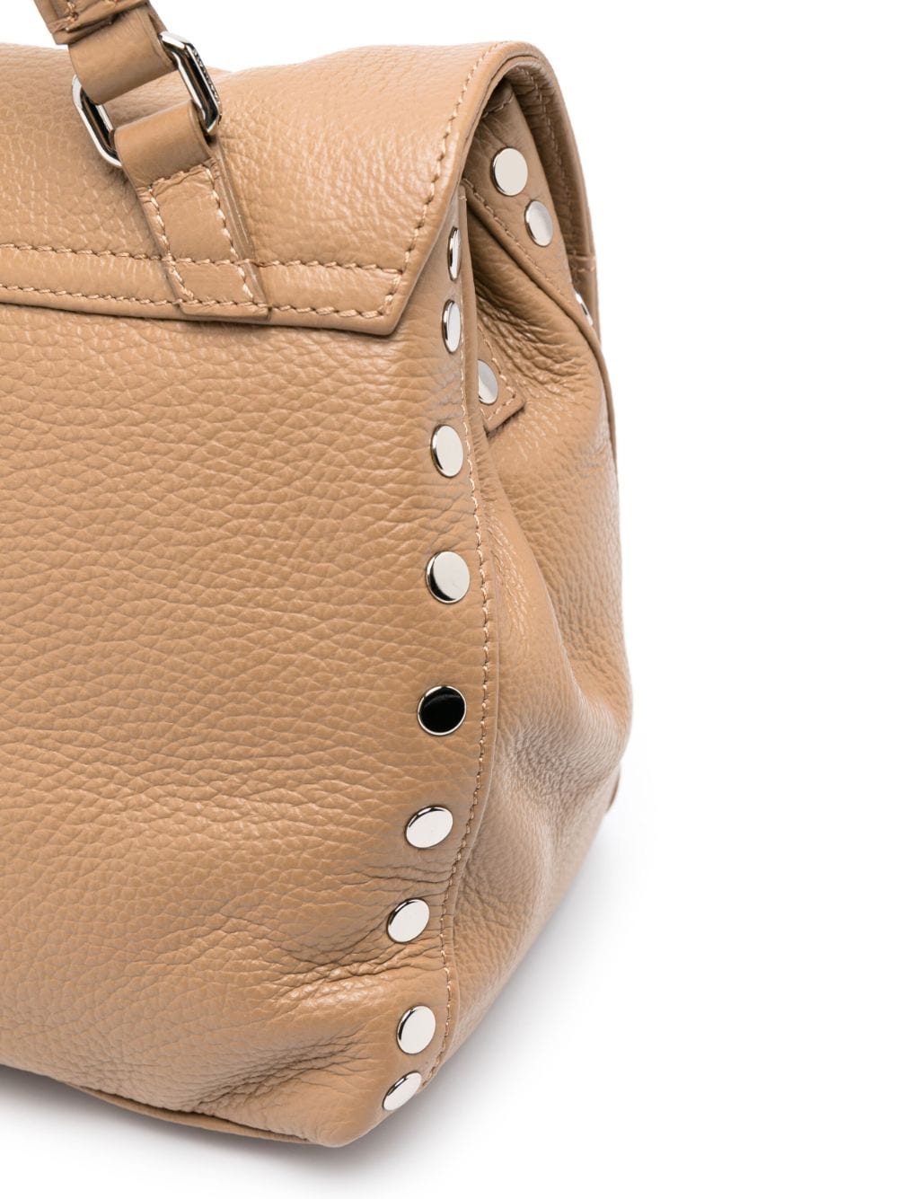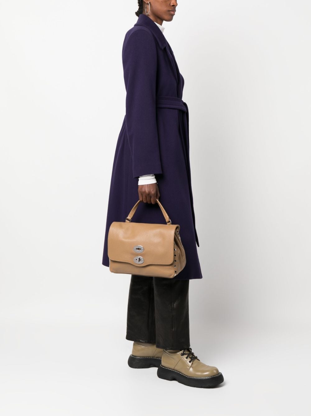 Bolsa de cuero de postina mediana de Zanellato con marrón de arena, cuero, textura de guijarros, hardware de tonos plateados, manija de la parte superior plana única, correa de hombro desmontable ajustable, parte superior plegable, cierre de bloqueo de giro, compartimento particionado y bolsillo interno de cierre de cierre interno.