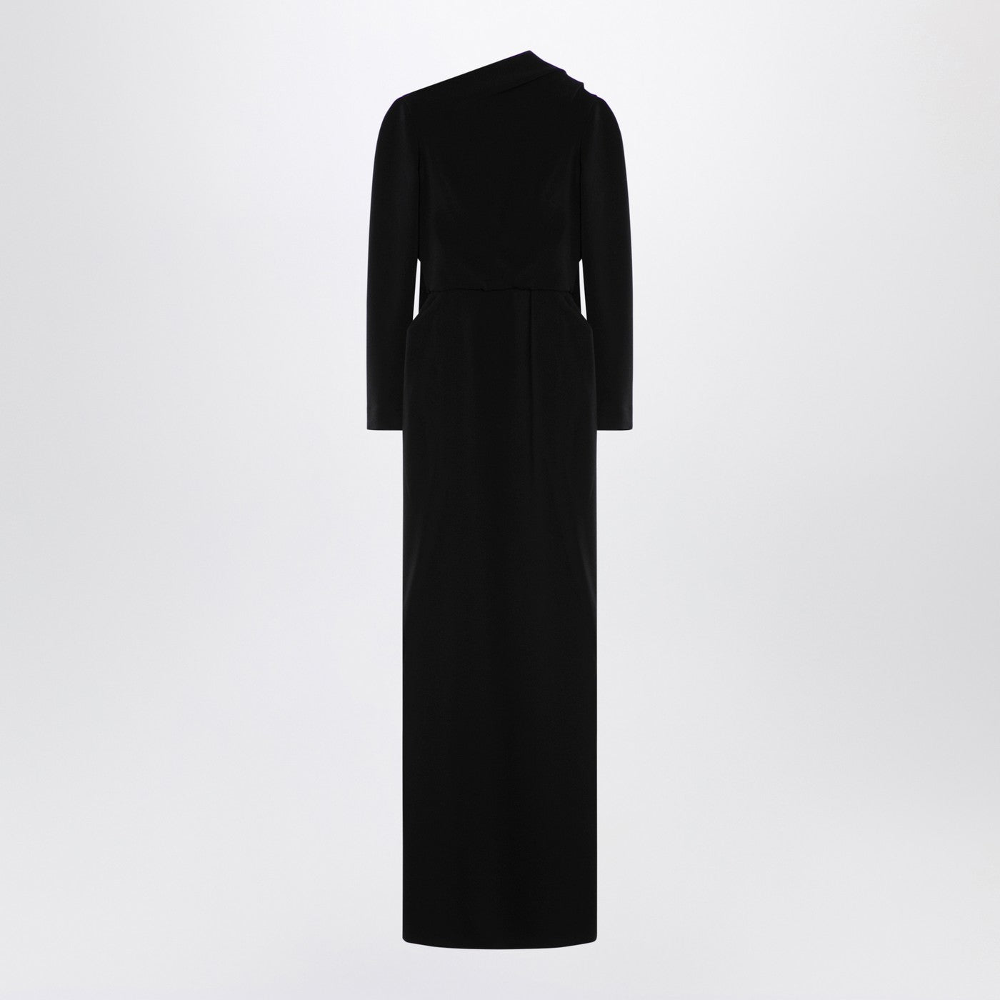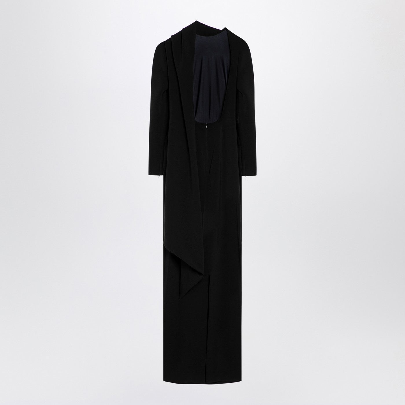 Black Stretch Crepe Long Robe de Balenciaga avec un dos ouvert, un long panneau arrière, une fixation de zip, une fente arrière et des manches longues.