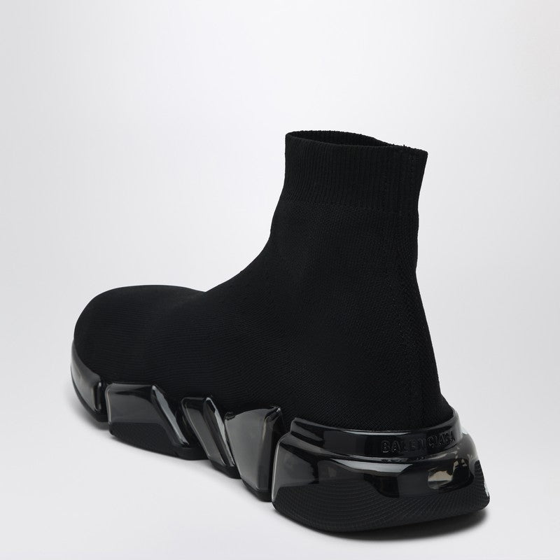Baleniens Balenciaga en tricot technique noir léger, caractérisé par une semelle articulée moulée transparente sans technologie de mémoire, design de lettrage de logo imprimé de graffiti sur la semelle et un logo en relief à l'arrière de la semelle.
