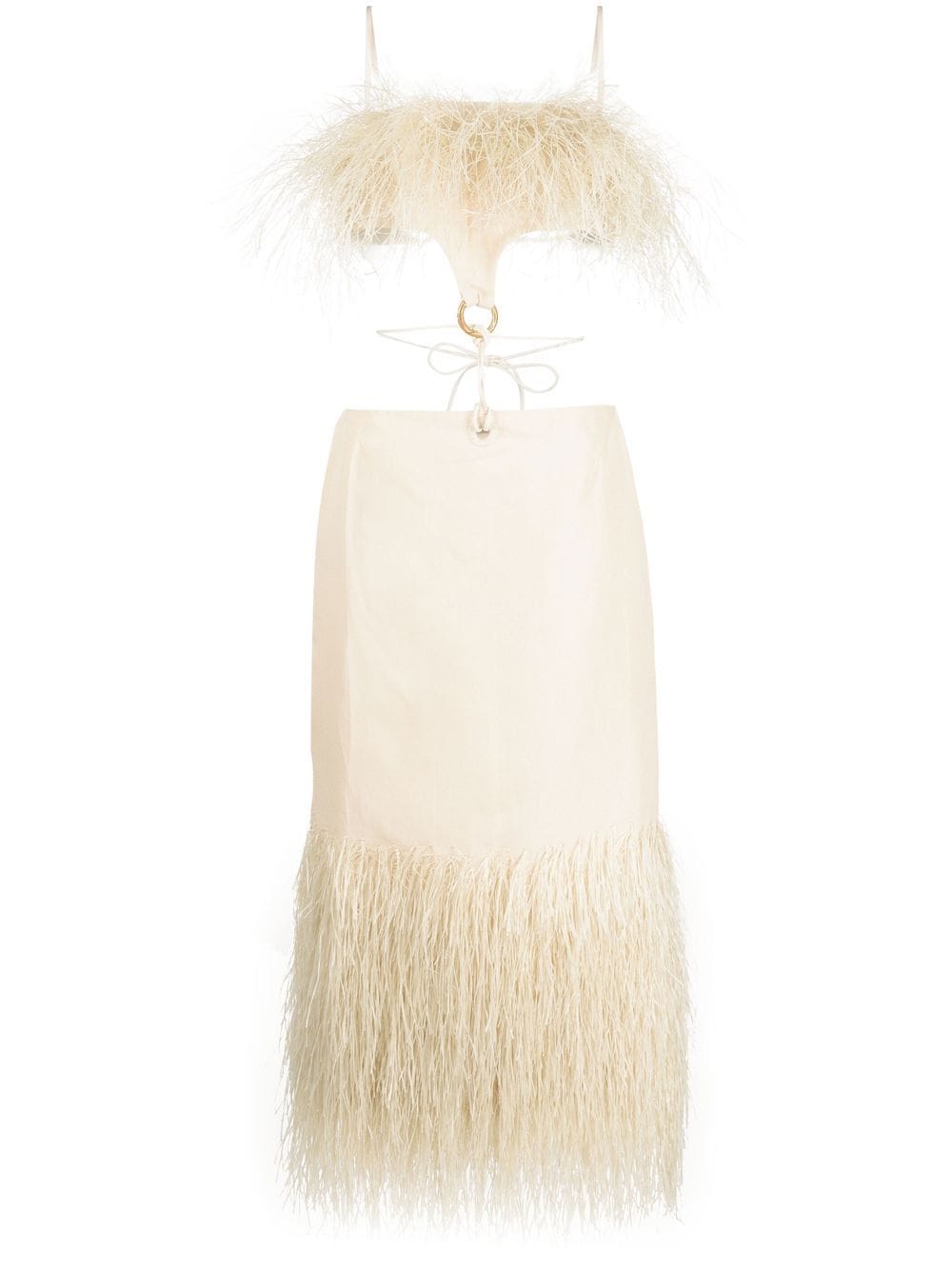 Raphia coupé Robe à franges de Jacquemus avec blanc ivoire, raffie, mélange de coton, détails marginaux, bretelles spaghettis réglables, cou carré, détails de la quincaillerie en anneau, ouvri et fixation de fermeture éclair latérale dissimulée.