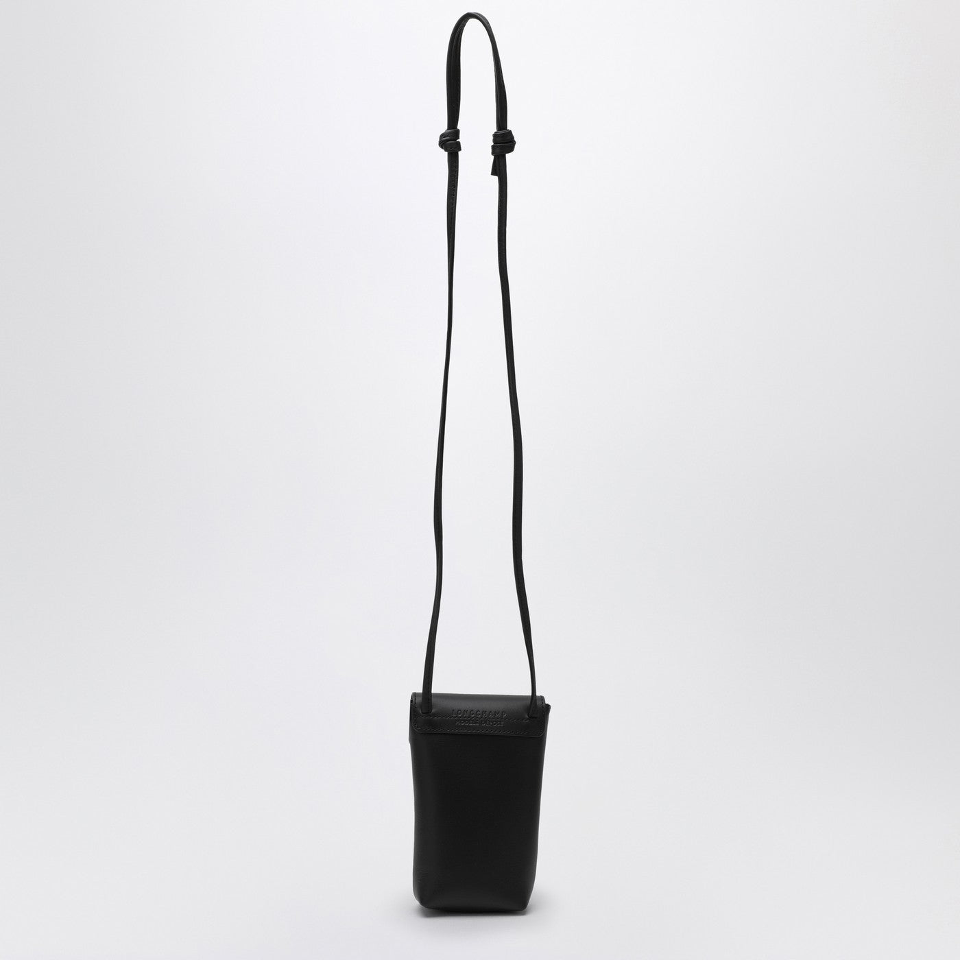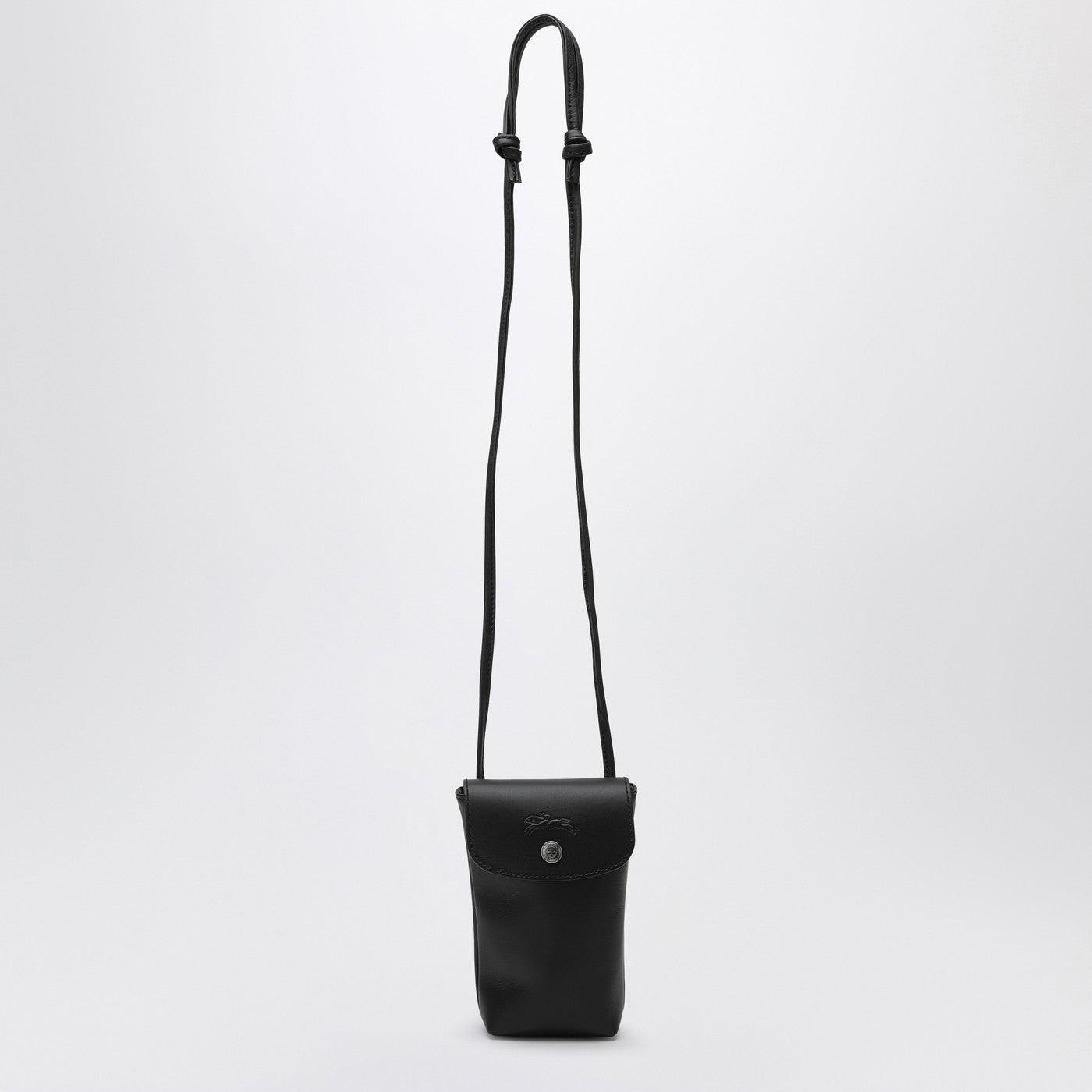 Support de téléphone mobile Longchamp en cuir noir, avec un bandoulière, un rabat et un logo en relief en relief sur le ton à l'avant.