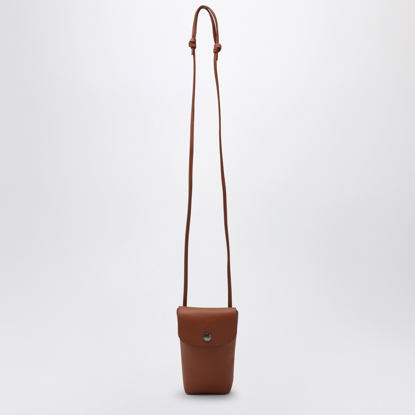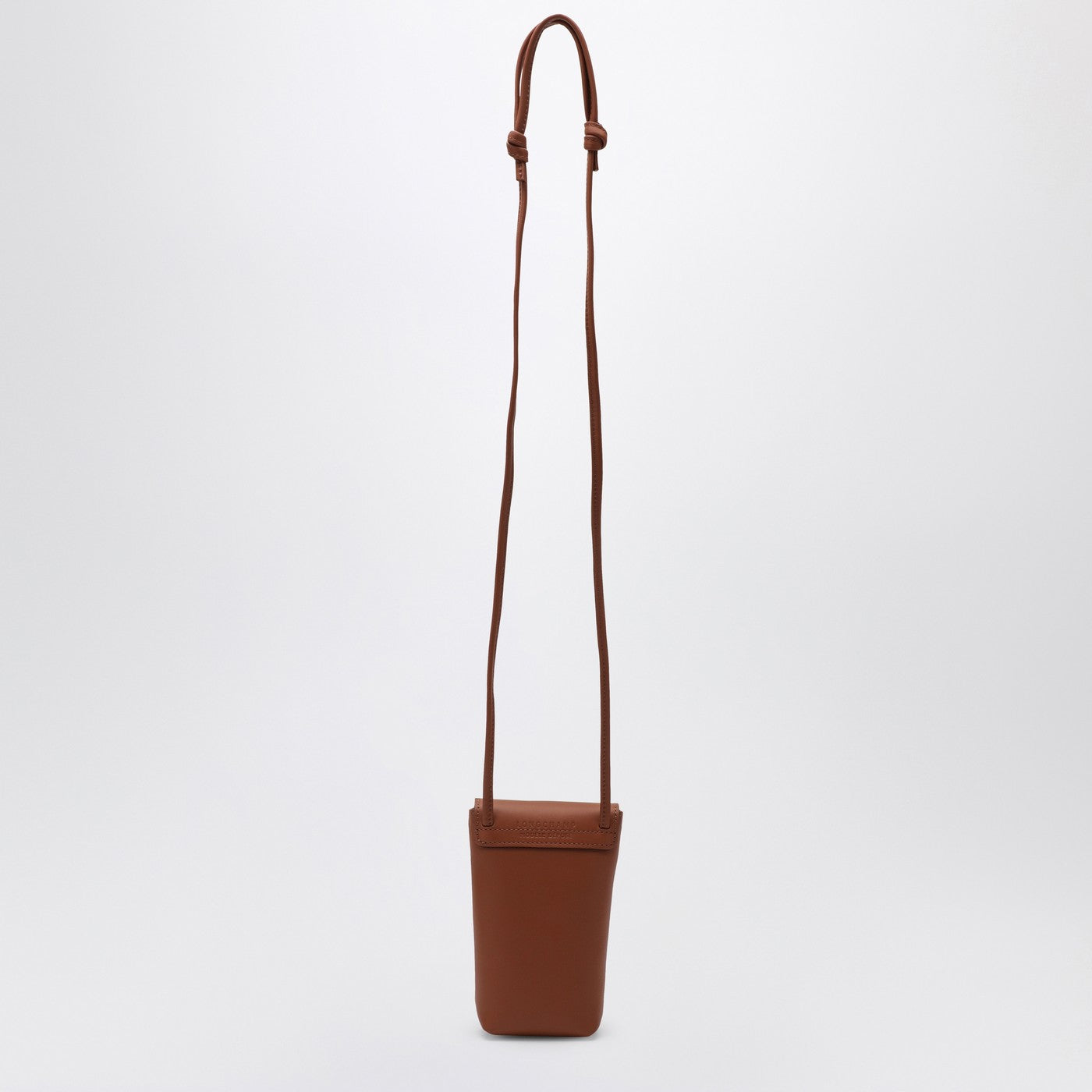 Support de téléphone mobile Longchamp en cuir marron, avec un bandoulière, un rabat et un logo en relief en relief et en snap à l'avant.