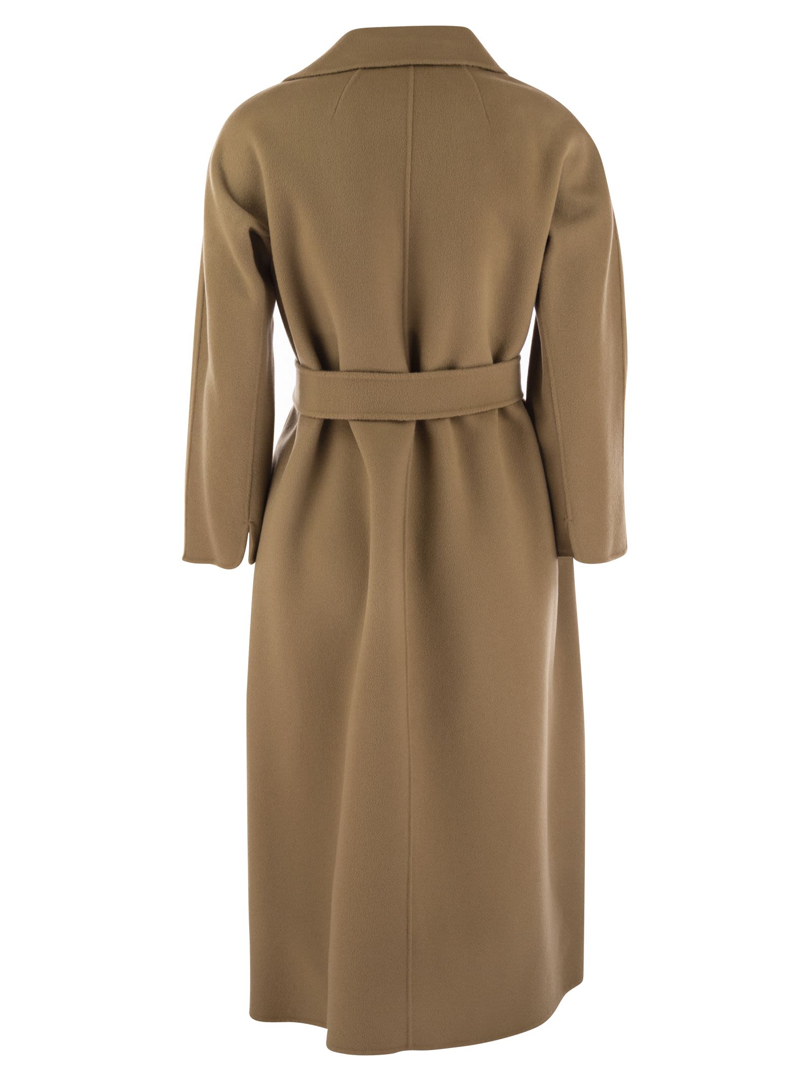 Longue manteau en tissu en laine double pur cousu à la main, avec col de revers, manches et poches de kimono insérées dans les hanches. Ligne sans doublure et légèrement évasée en bas. - Fixé avec la ceinture assortie. ID de concepteur: 2429016131600 045