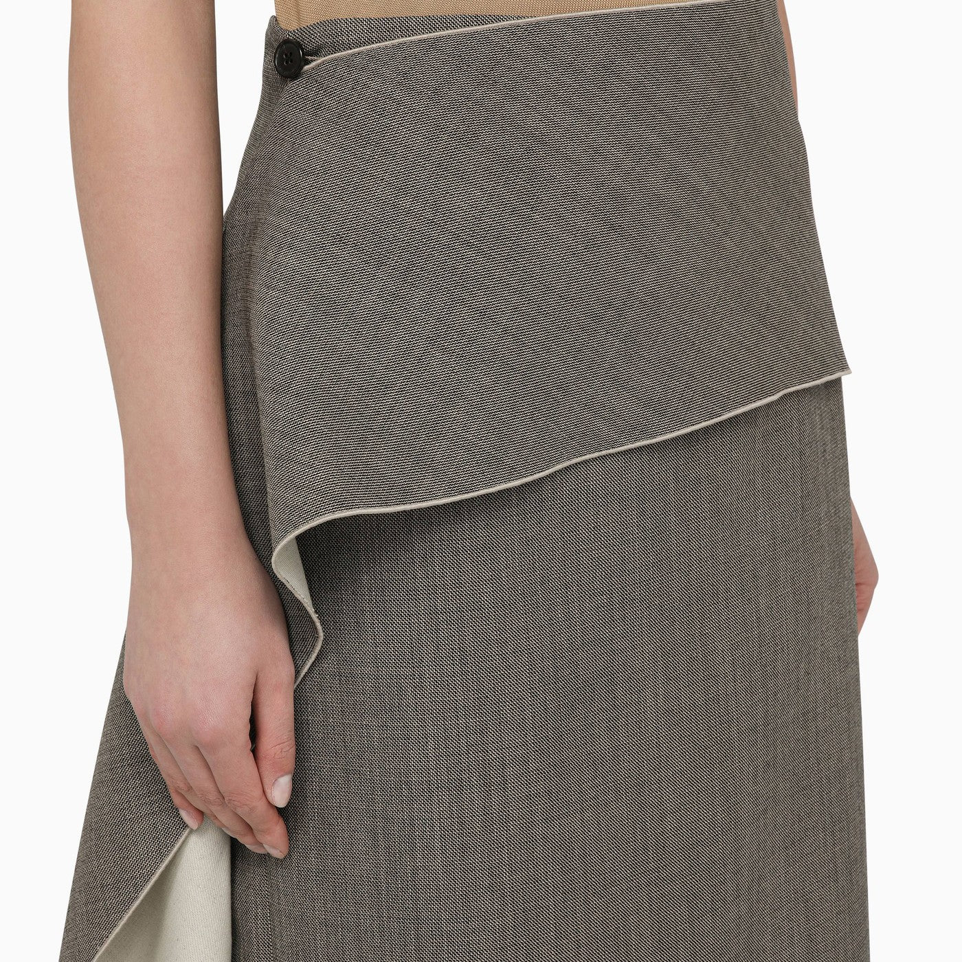 Jupe crayon en laine noire et blanche de la rangée avec une fixation à fermeture éclair et une attache de bouton latérale à l'avant.
