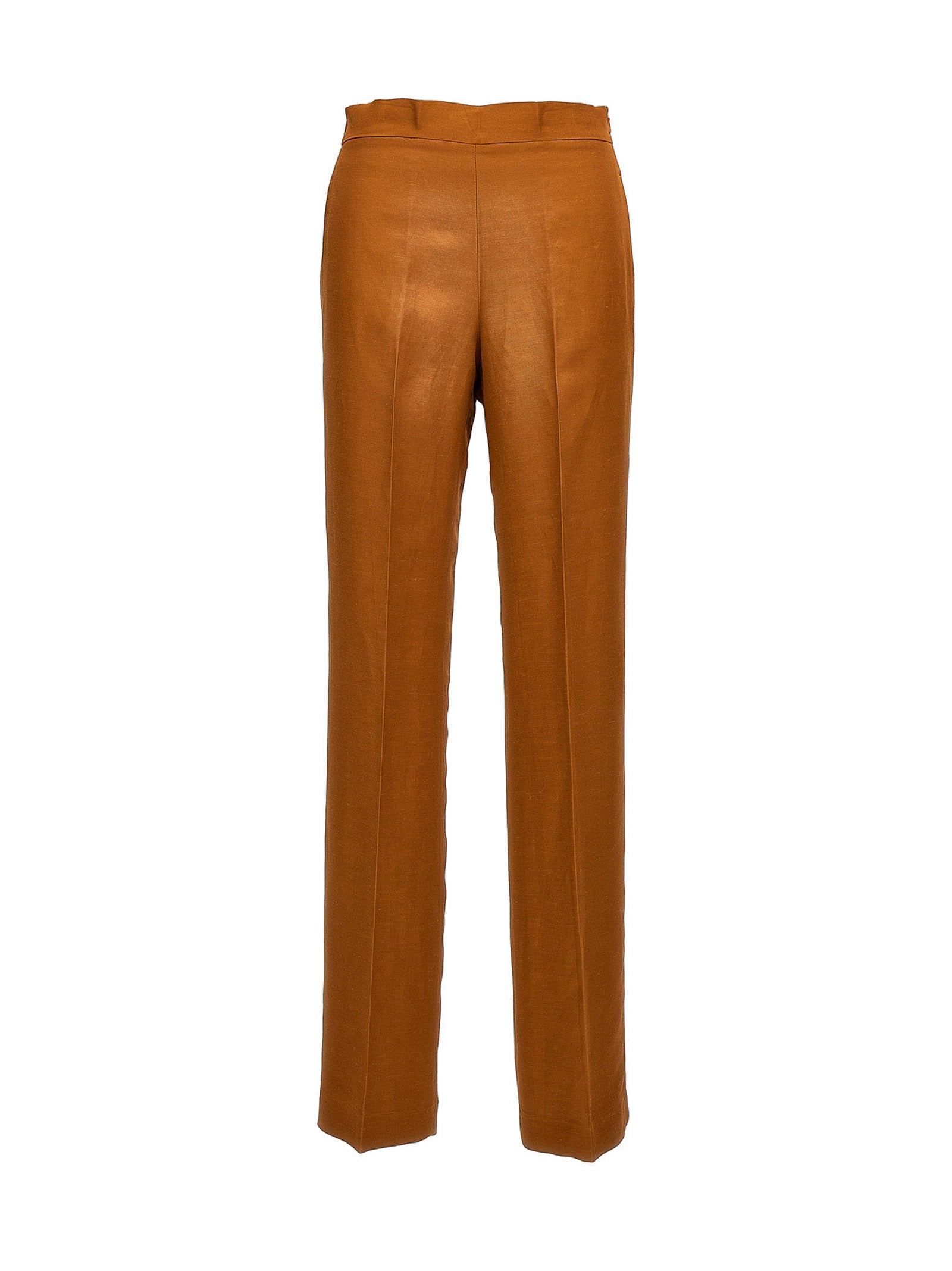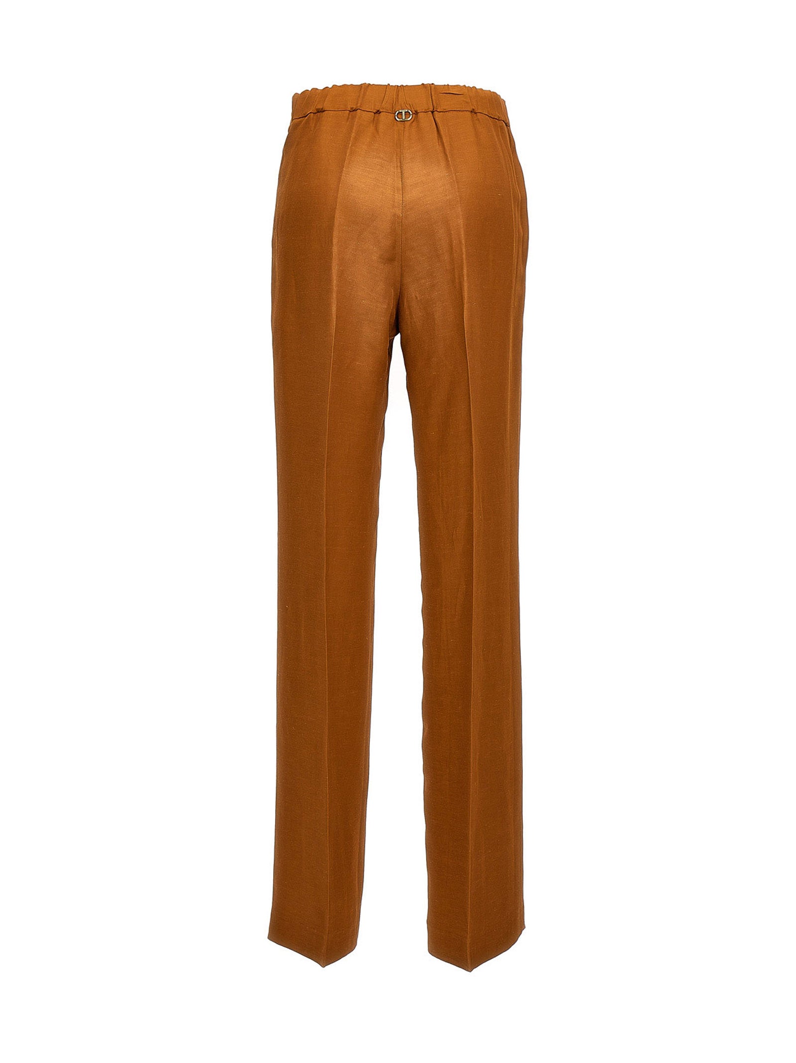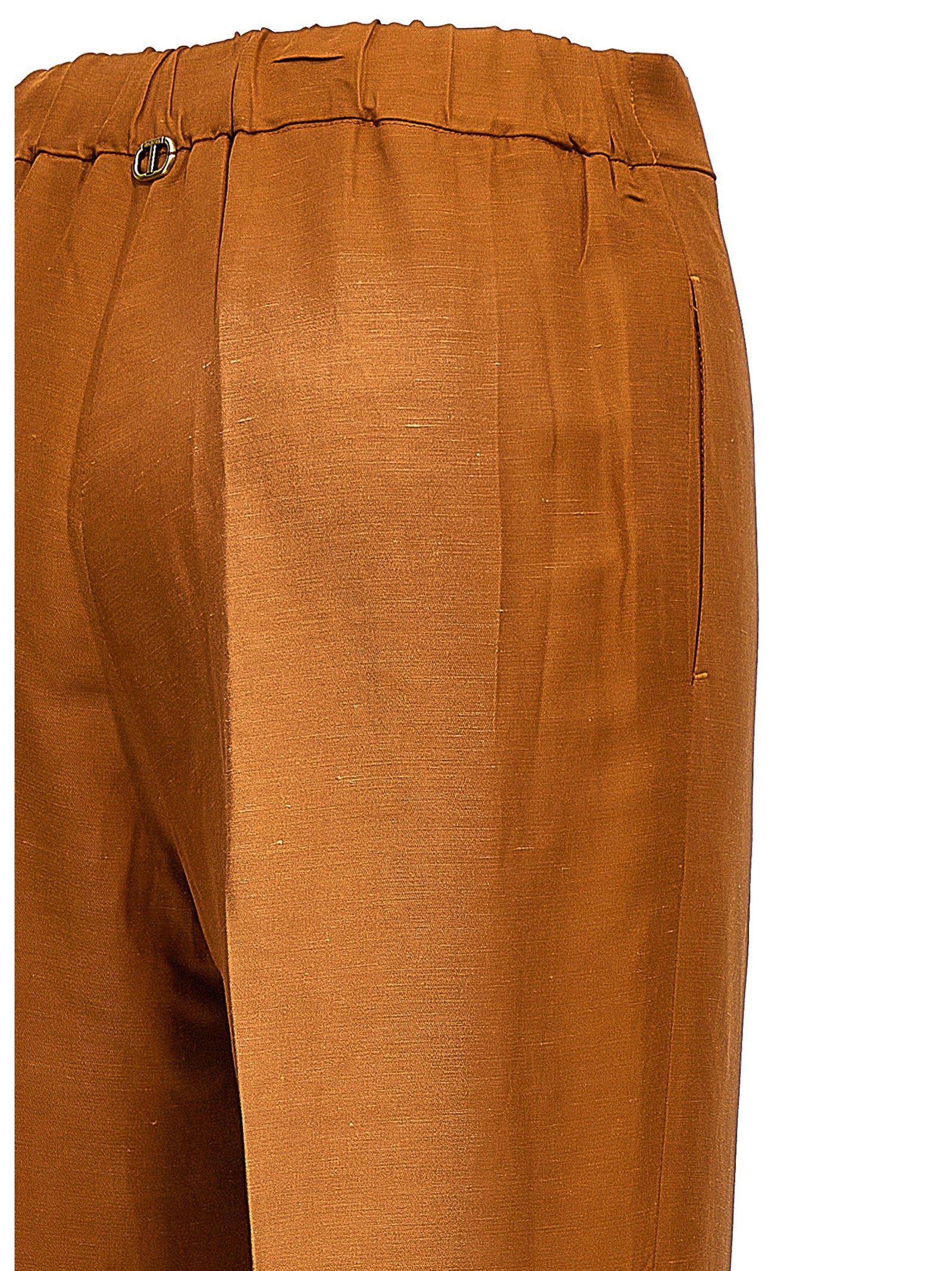 Viscose et lin mélangent un pantalon «noisette» avec fermeture de fermeture éclair latérale, une ceinture élastique à l'arrière, des poches et une jambe lâche.
