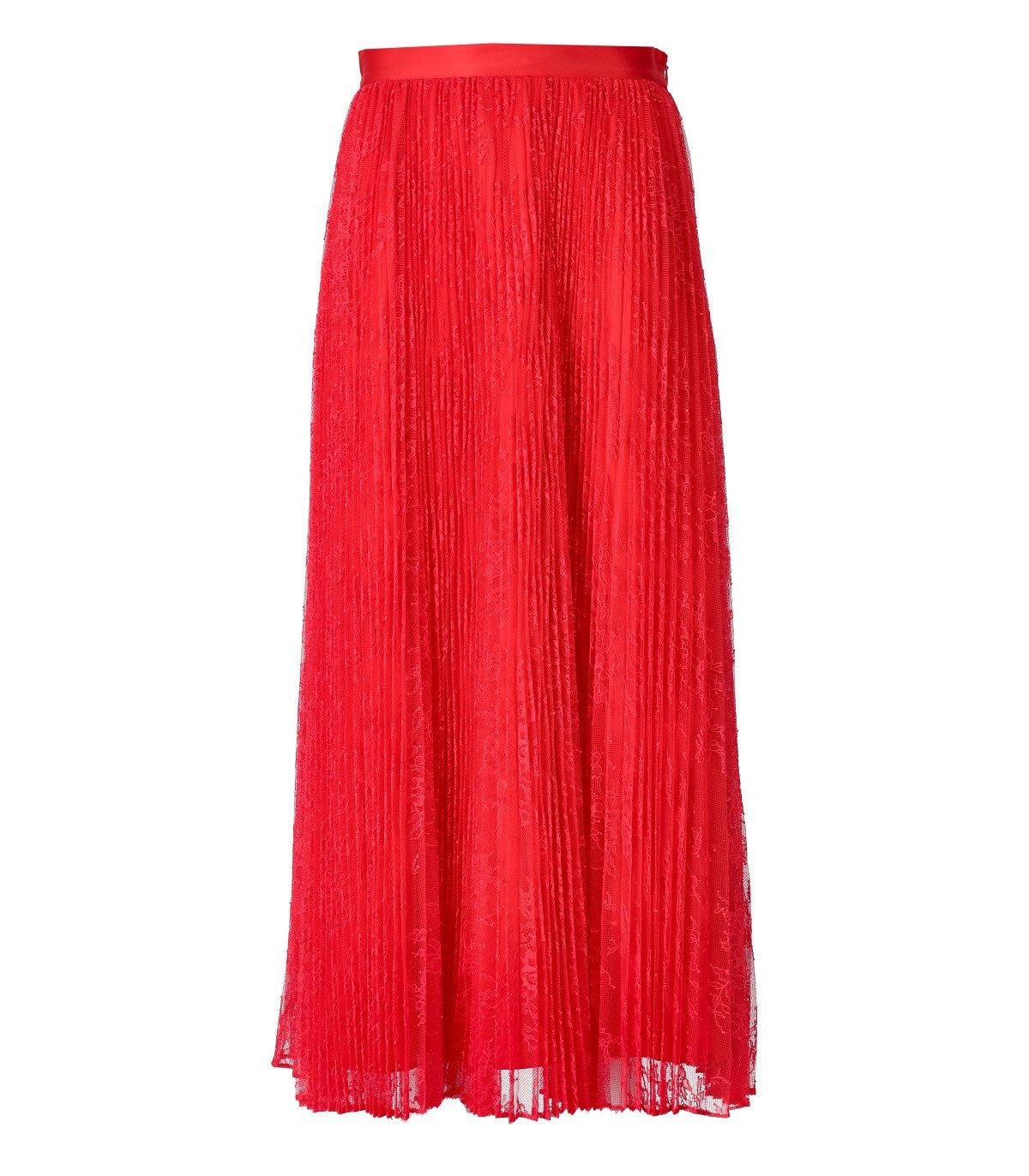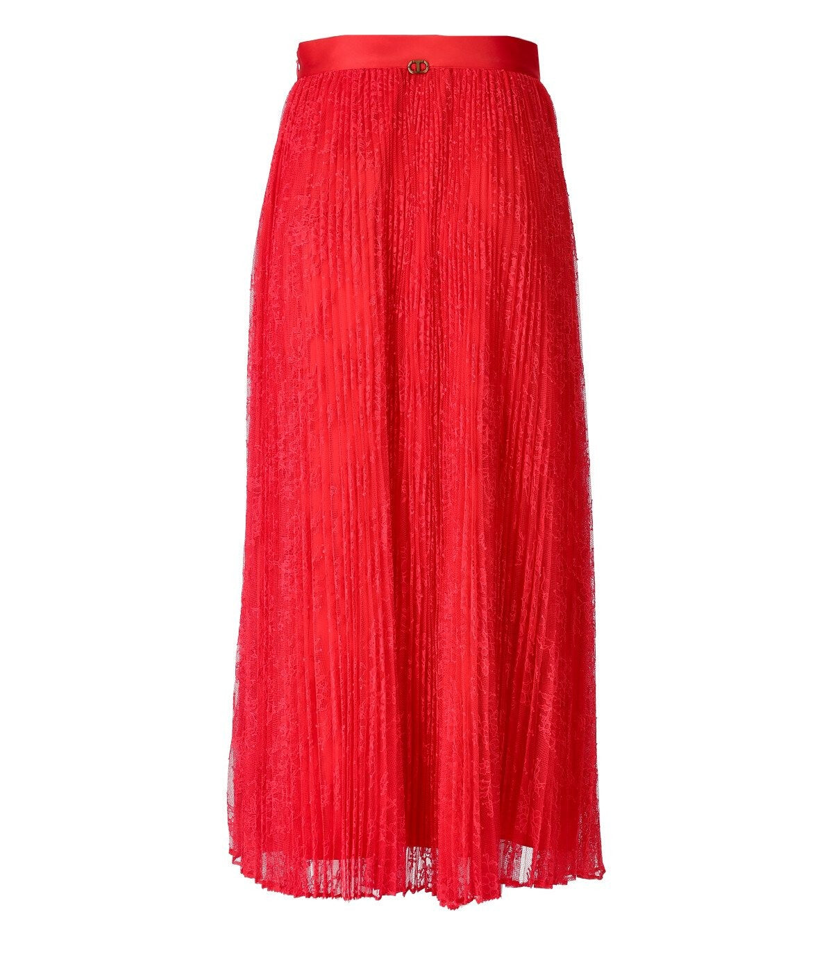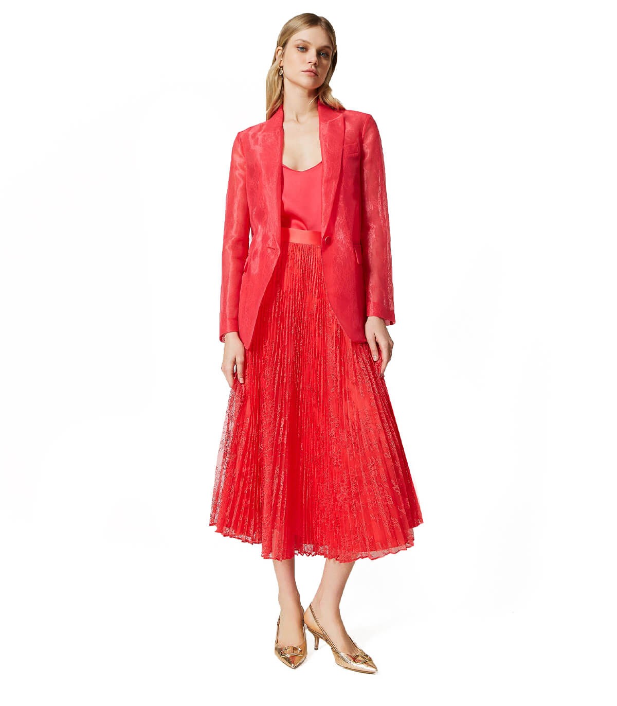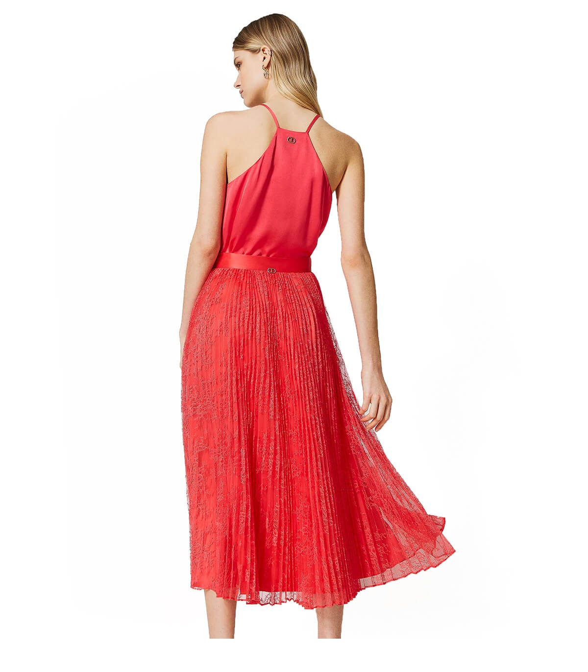 Jupe à deux binins en dentelle de couleur corail, décorée de motif floral. Crêpe de Chine Doublage, logo métallique à l'arrière et fermeture de fermeture éclair.