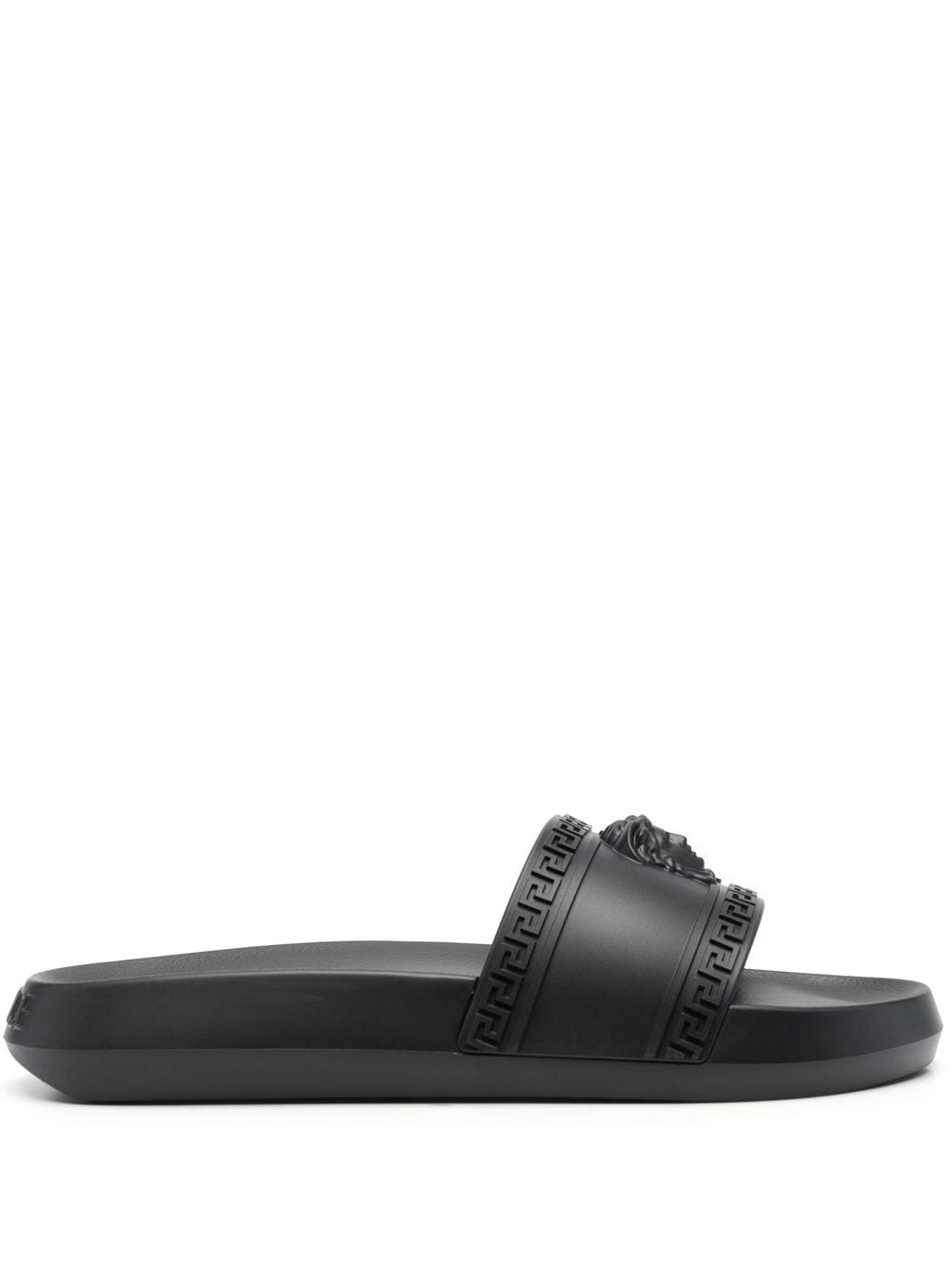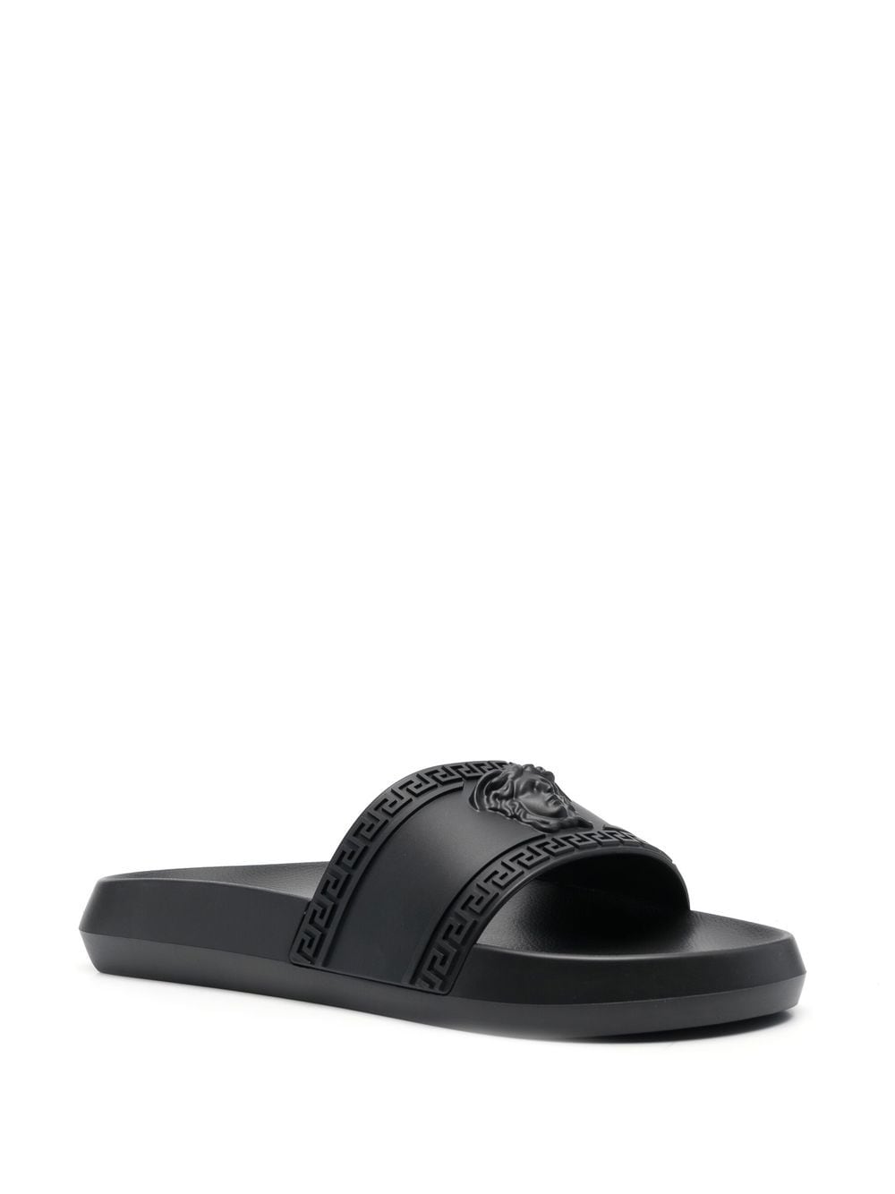 Détail de plaque noire, Medusa, orteil ouvert, conception à glissière et semelle en caoutchouc plat.