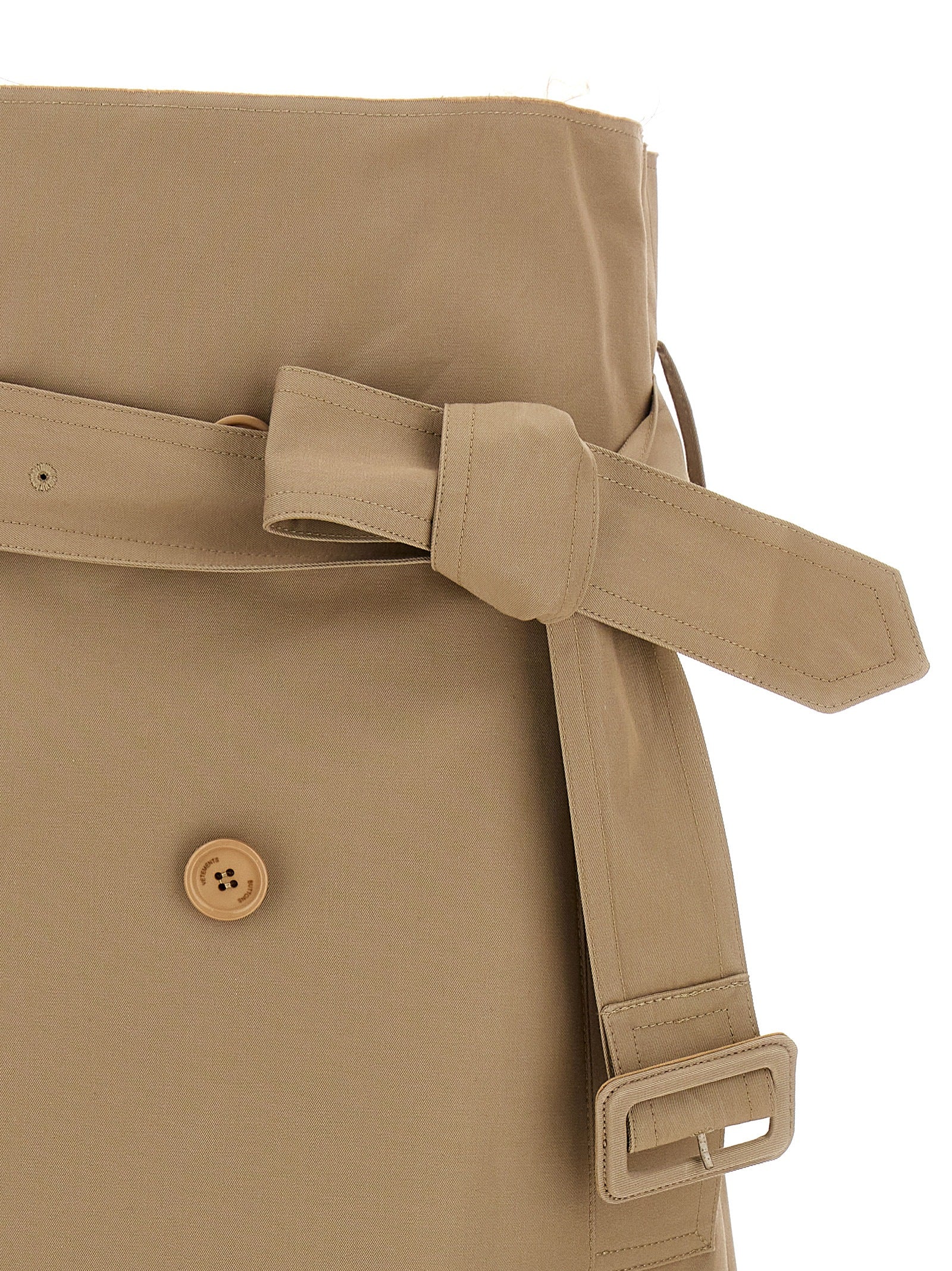 Jupe de portefeuille «déconstruite» en coton avec fermeture de bouton avant, poches, ceinture à la taille, dossier arrière.