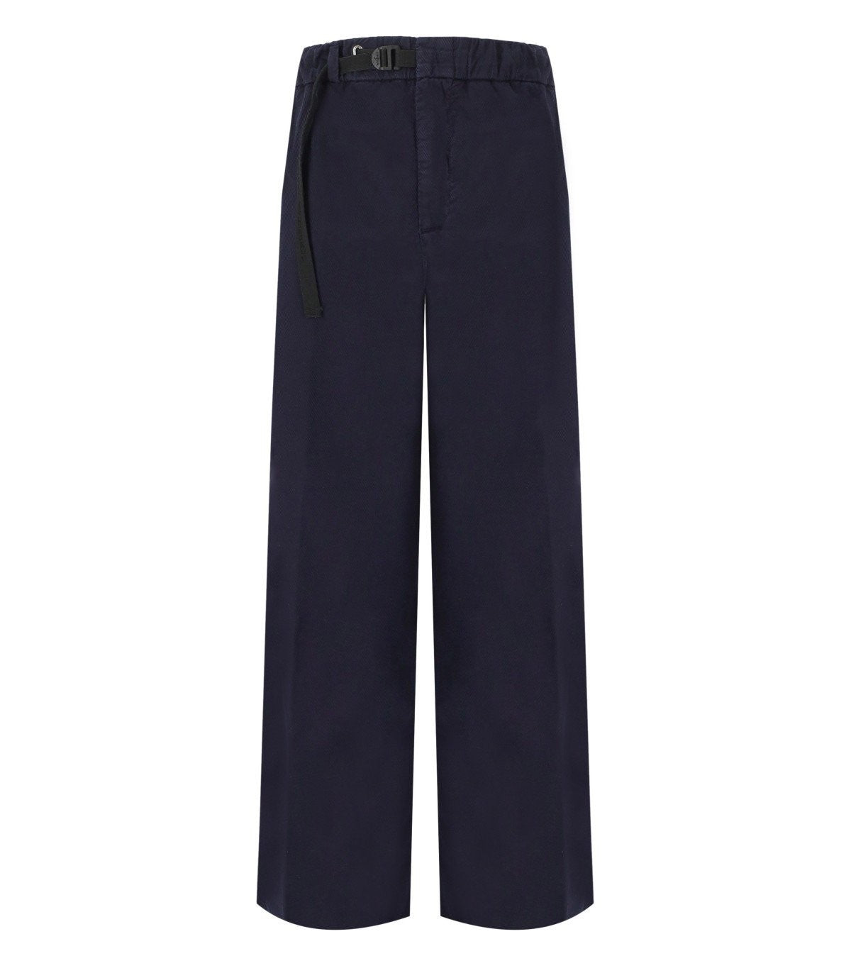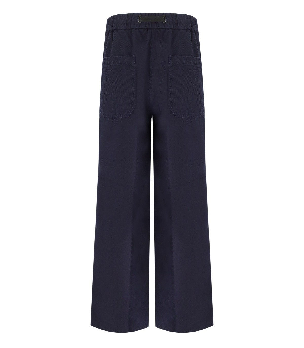 Pantalon Carol par sable blanc en coton et lin avec un motif de côtes obliques dans les tons de bleu. Taille élastique, fermeture de fermeture éclair, bouton et ceinture réglable avec boucle. Poches inclinées sur les hanches et les poches de patch à l'arrière, la jambe droite et large. Composition: 77% de coton, 23% de lin.