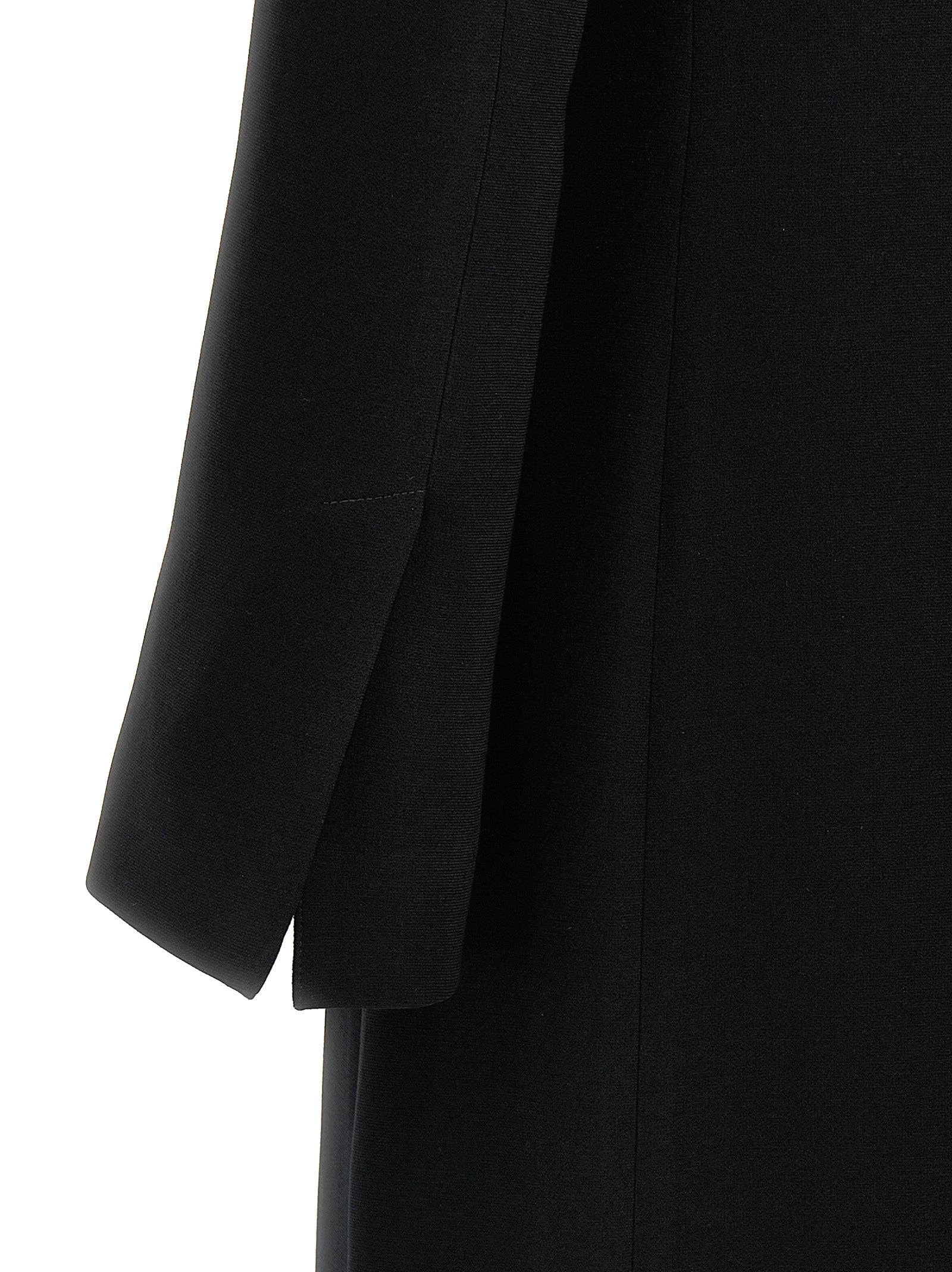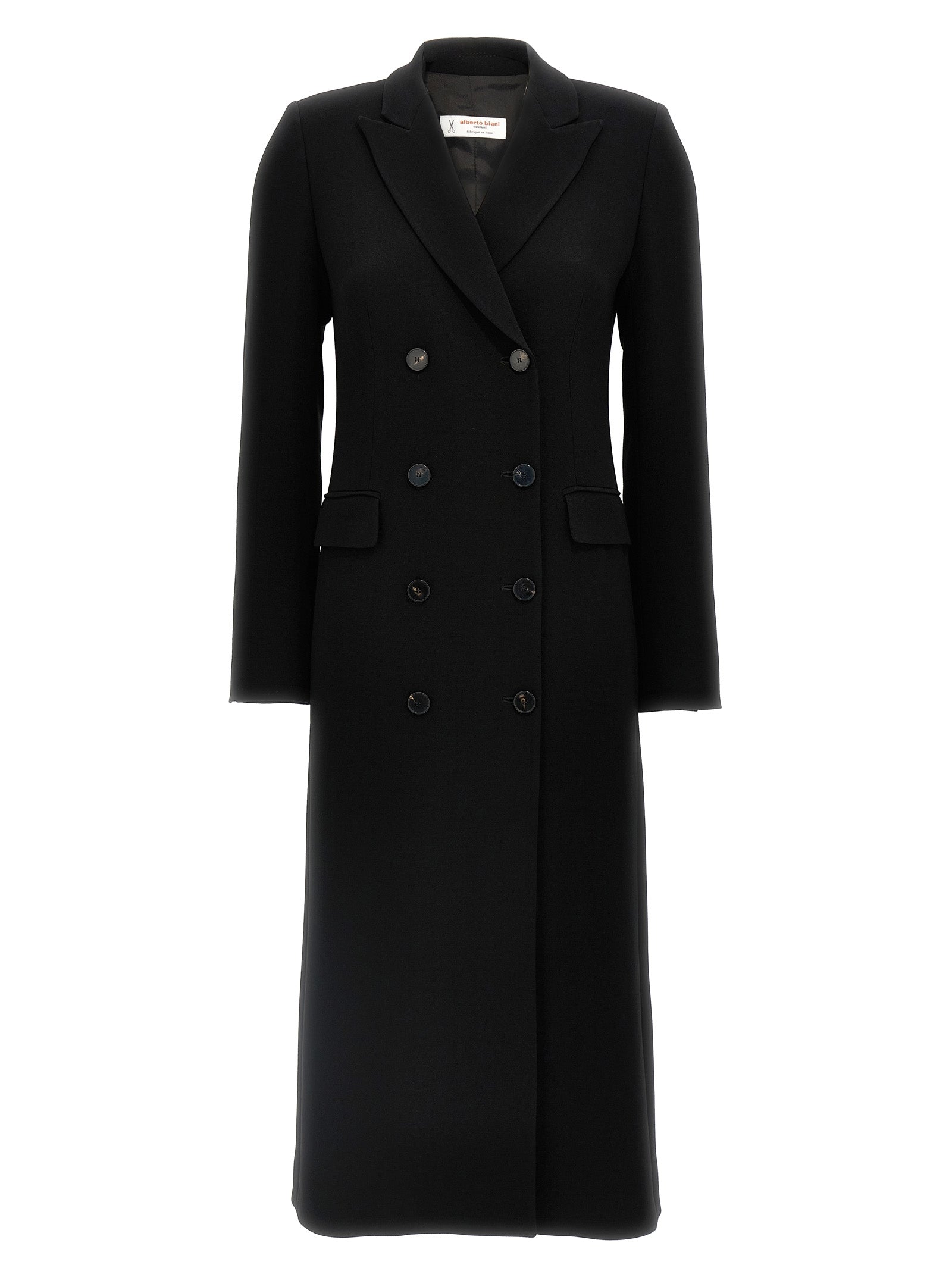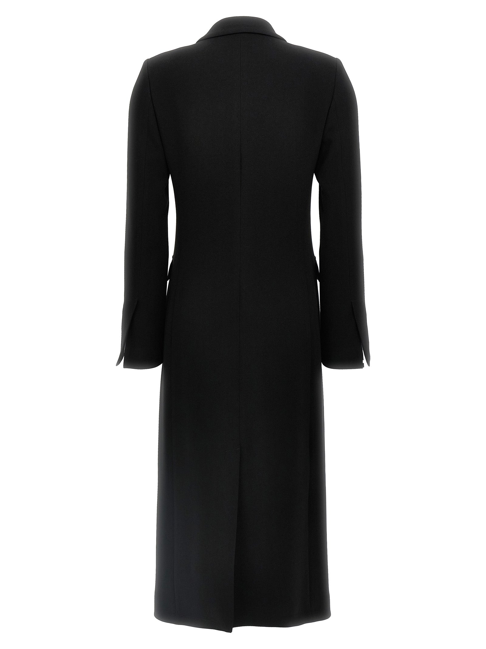 Robe de manteau à double poitrine avec fermeture du bouton avant, poches, manches longues, épaules légèrement rembourrées, dos à dos.