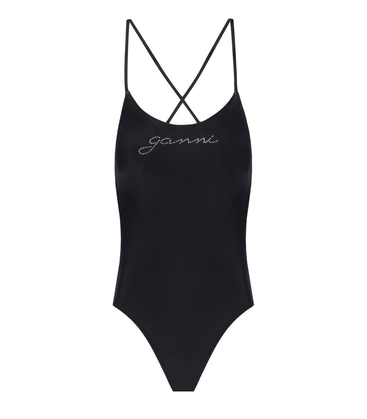 Ganni maillot de bain en tissu technique d'étirement noir, orné d'une application de logo avec strass à l'avant. Branstes traversées et réglables avec détail du logo papillon. Le modèle mesure 175 cm de haut et porte la taille S. Composition: 78% de polyamide recyclé, 22% élastique.