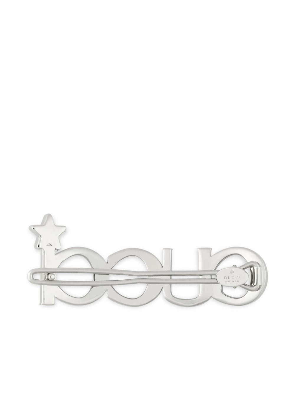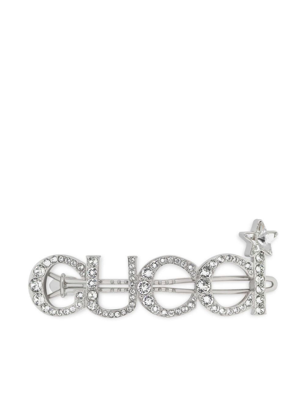 Gucci présente la Maison 's Nom au-dessus de cette pince à cheveux avec des détails cristallins étincelants.