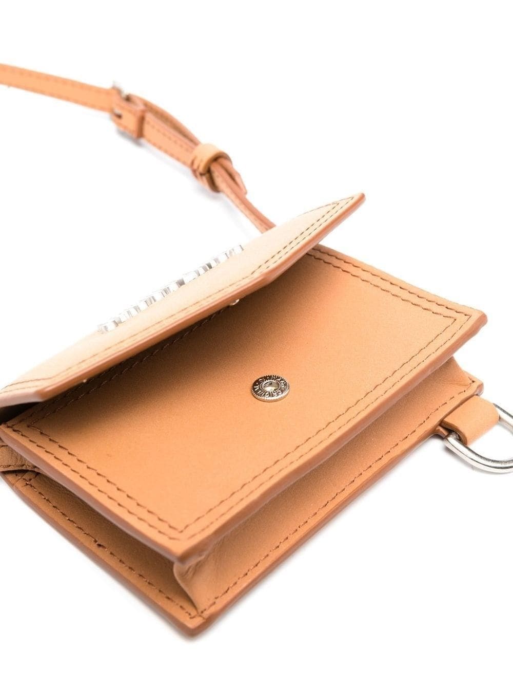 Portefeuille en cuir logo-plaque de Jacquemus avec brun clair, cuir veau, plaque de logo doré-tone-or, dessus de pliage avec attache de presse, bandoulière unique et compartiment principal.