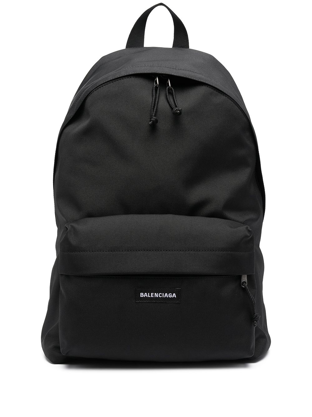 Black Explorer Logo Sac à dos de Balenciaga avec un patch de logo à l'avant, une poignée supérieure, des bretelles réglables, une fixation à fermeture éclair supérieure et un compartiment de jettement zippé avant.