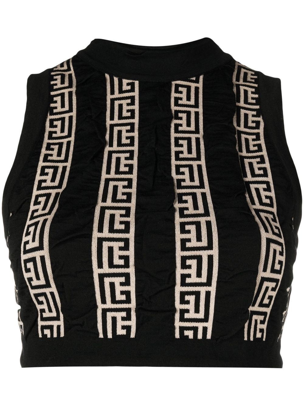 Crop-crop top de monogramme de Balmain avec noir, blanc ivoire, mélange en laine, motif de monogramme, design lambrissé, col haut, sans manches et recadré.