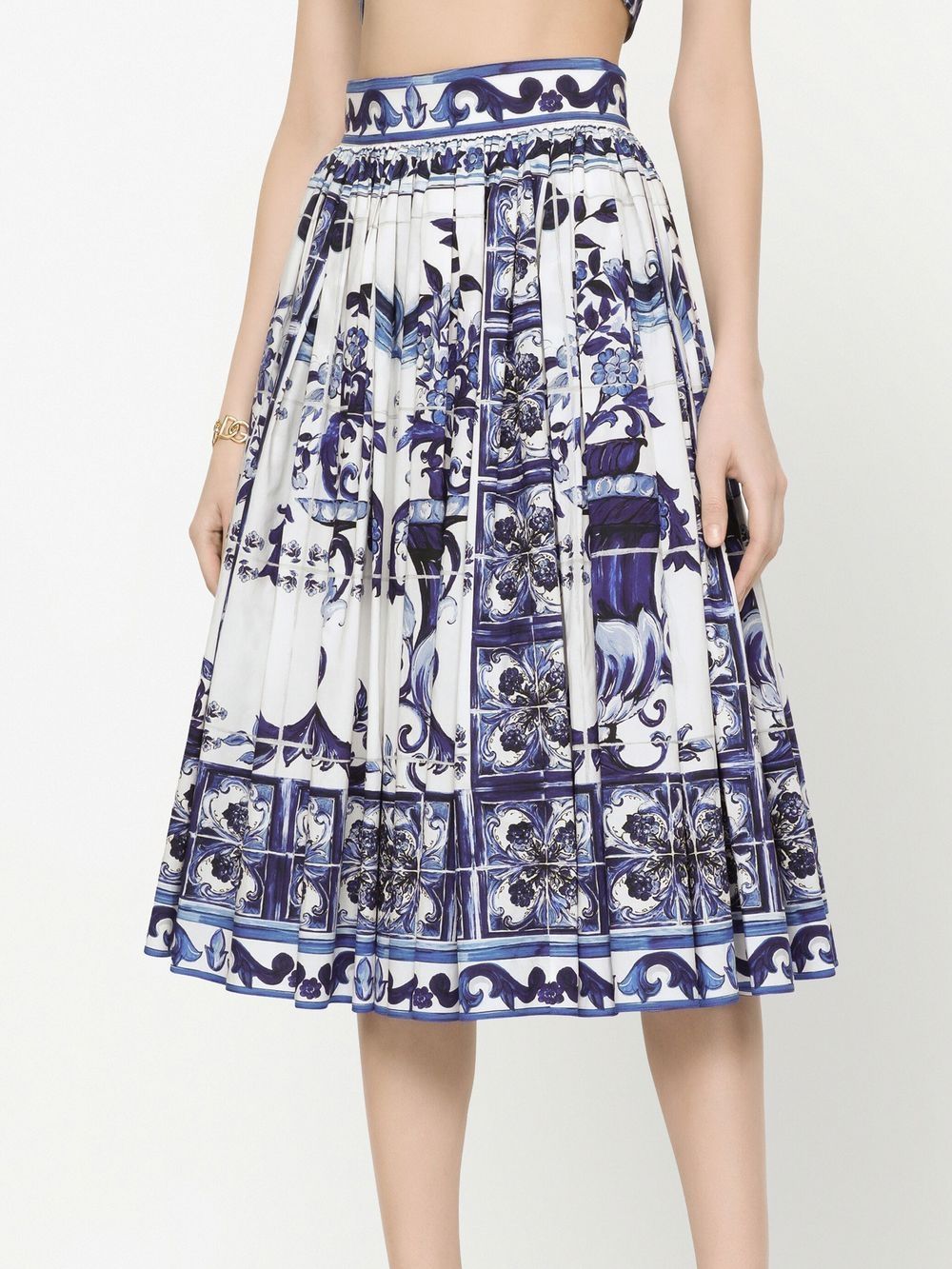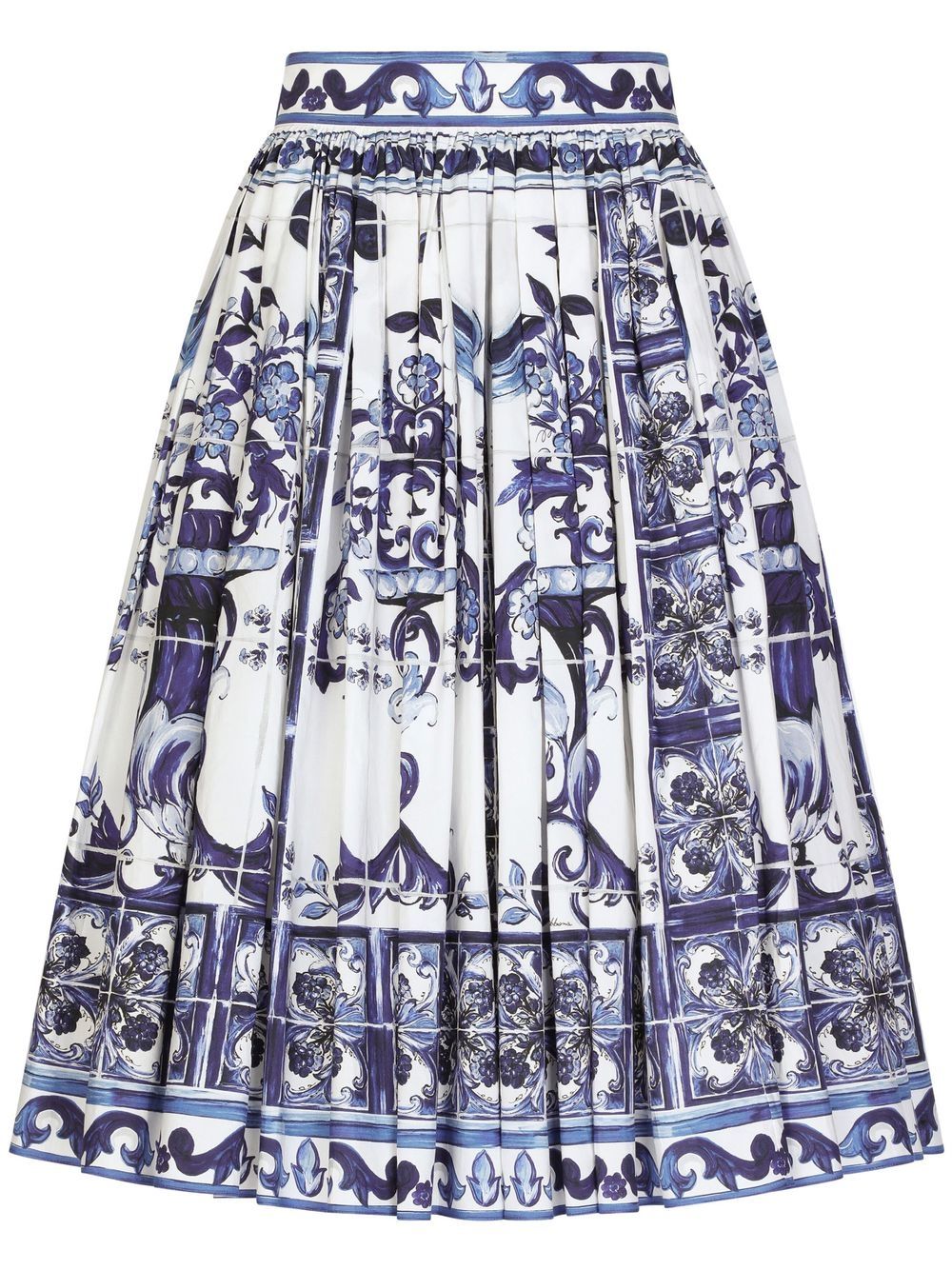 Jupe MIDI A-line plissée à imprimé Majolica de Dolce & Gabbana avec bleu marine, bleu, blanc, imprimé Majolica, entièrement plissé, taille haute, fixation à fermeture éclair arrière dissimulée, ourlet A-line et droit.