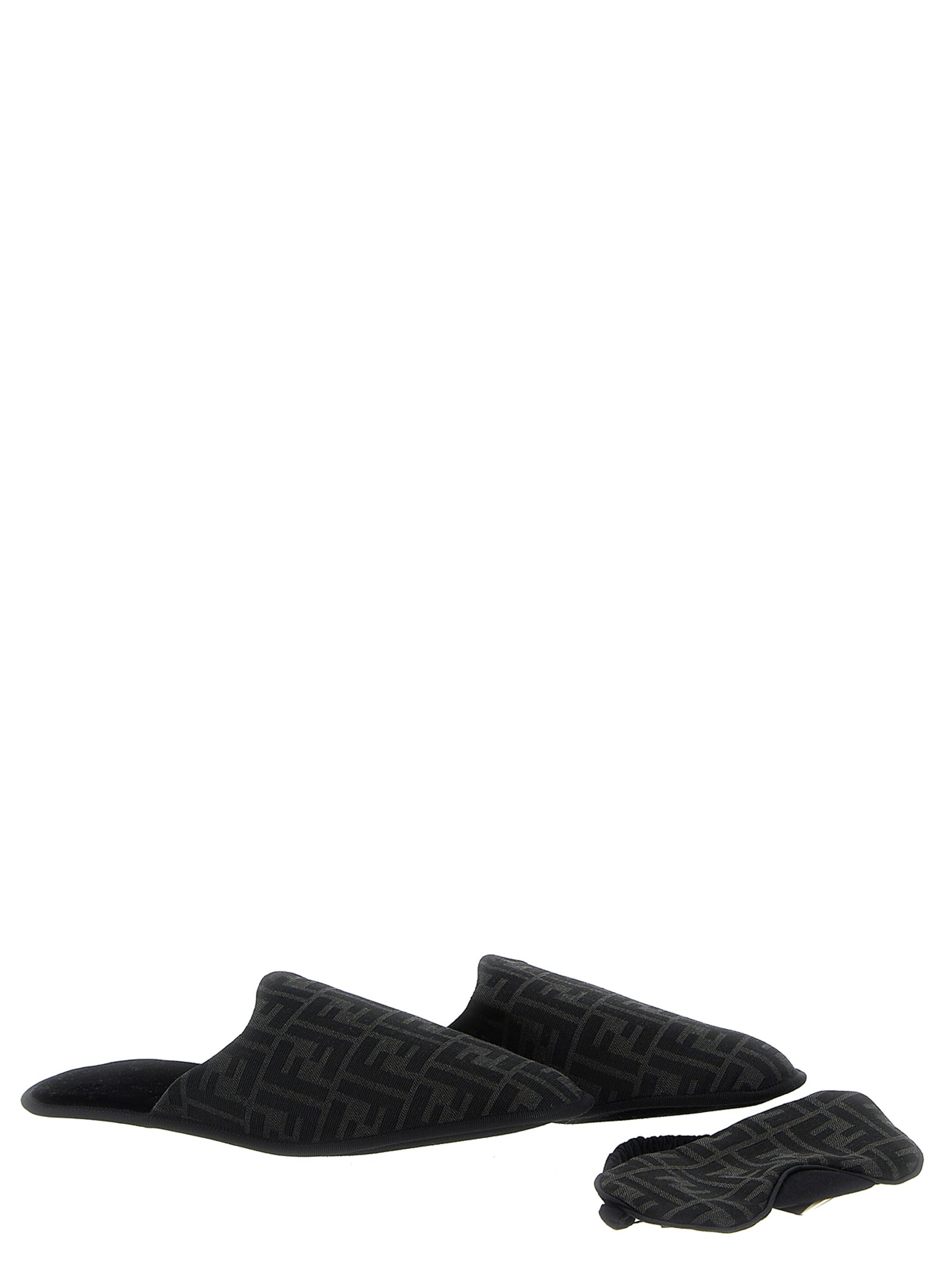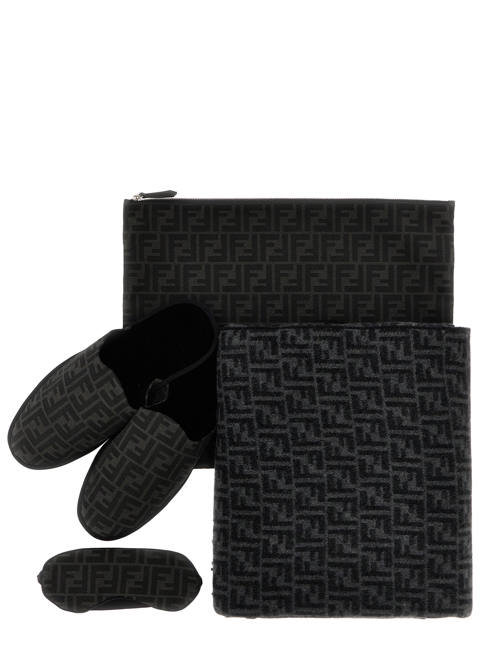 Ensemble de voyage composé d'un sac cosmétique, d'une couverture, de pantoufles et d'un masque nocturne. Fabriqué de Jersey Jacquard «FF».