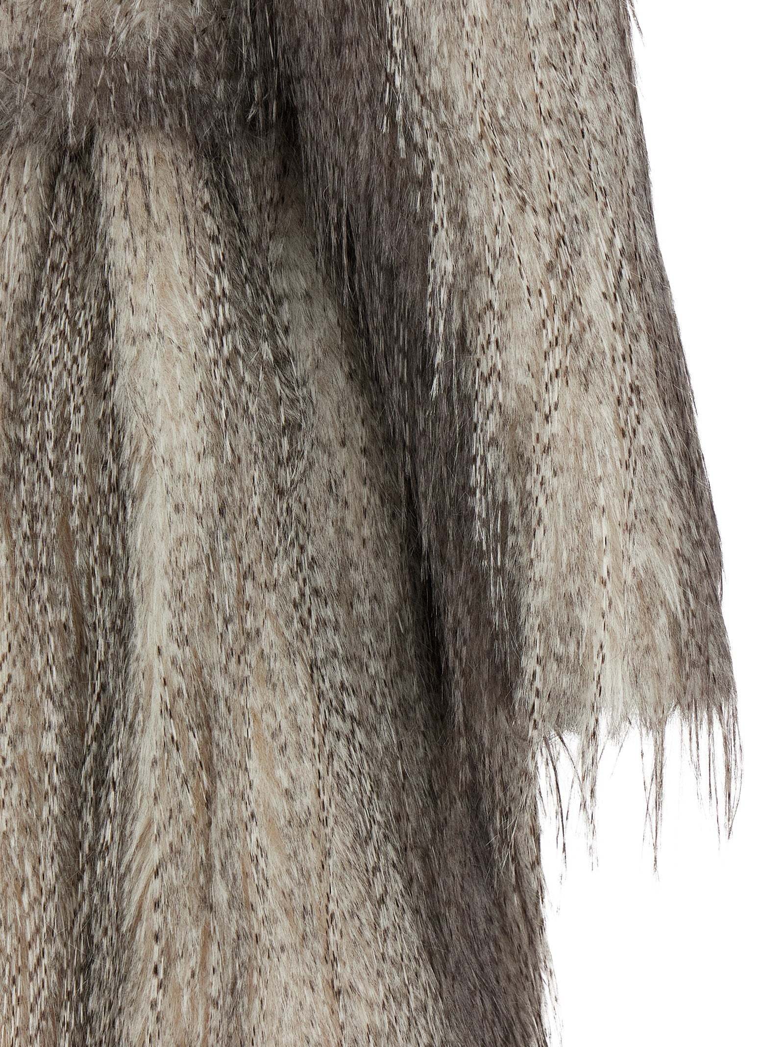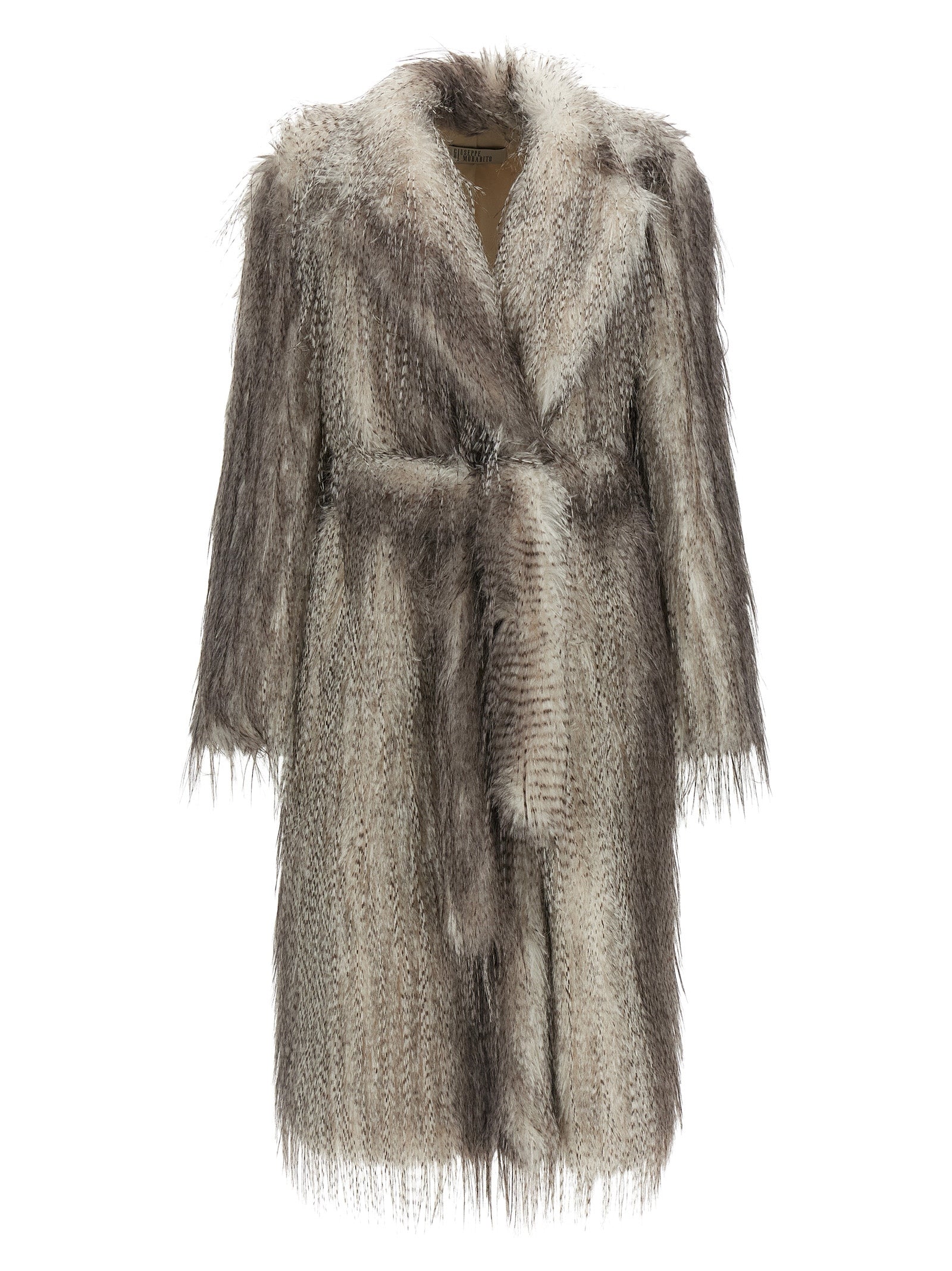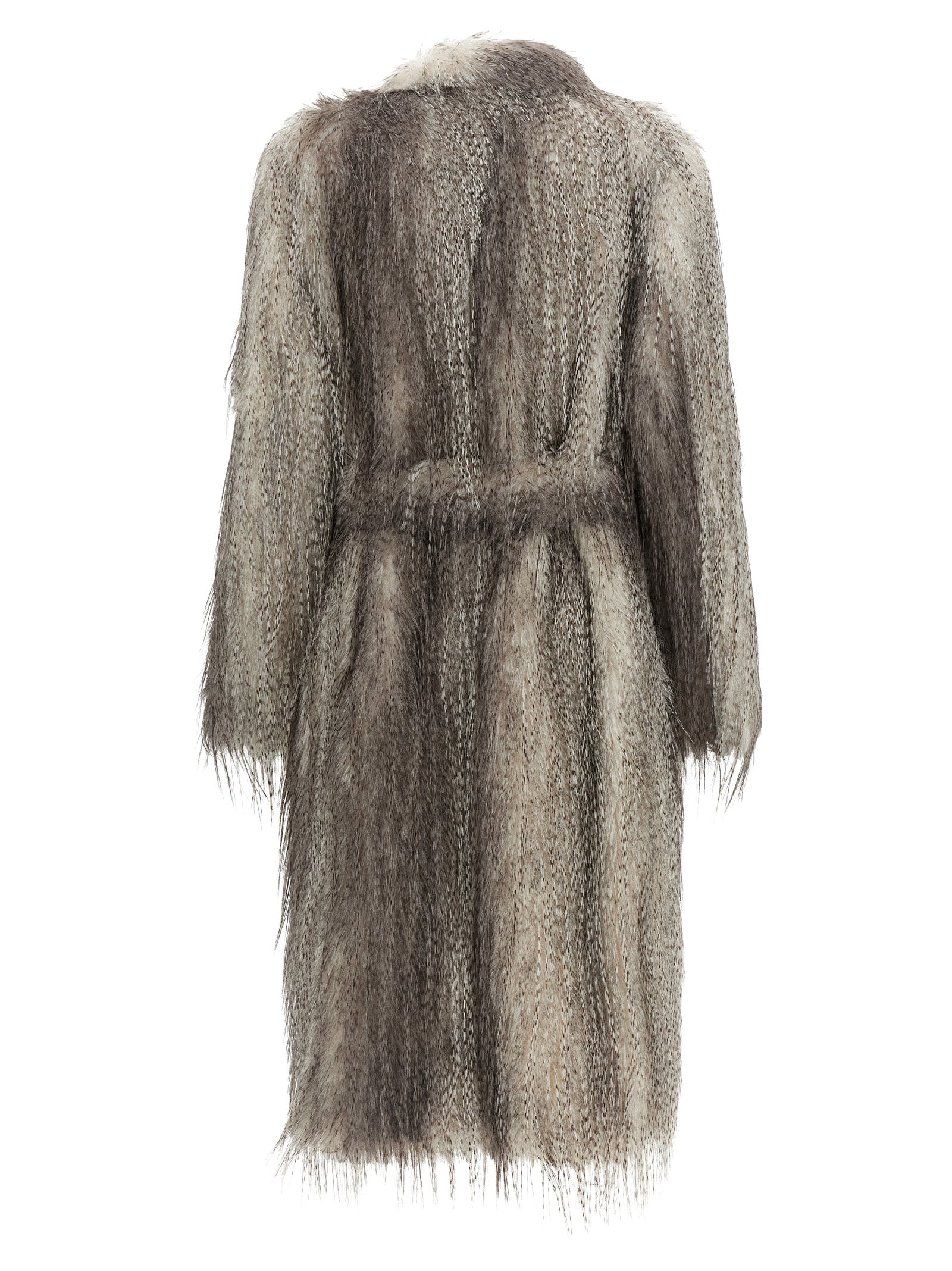 Long eco-fur coat with V-neck with lapels, side pockets, adjustable and removable waist belt.