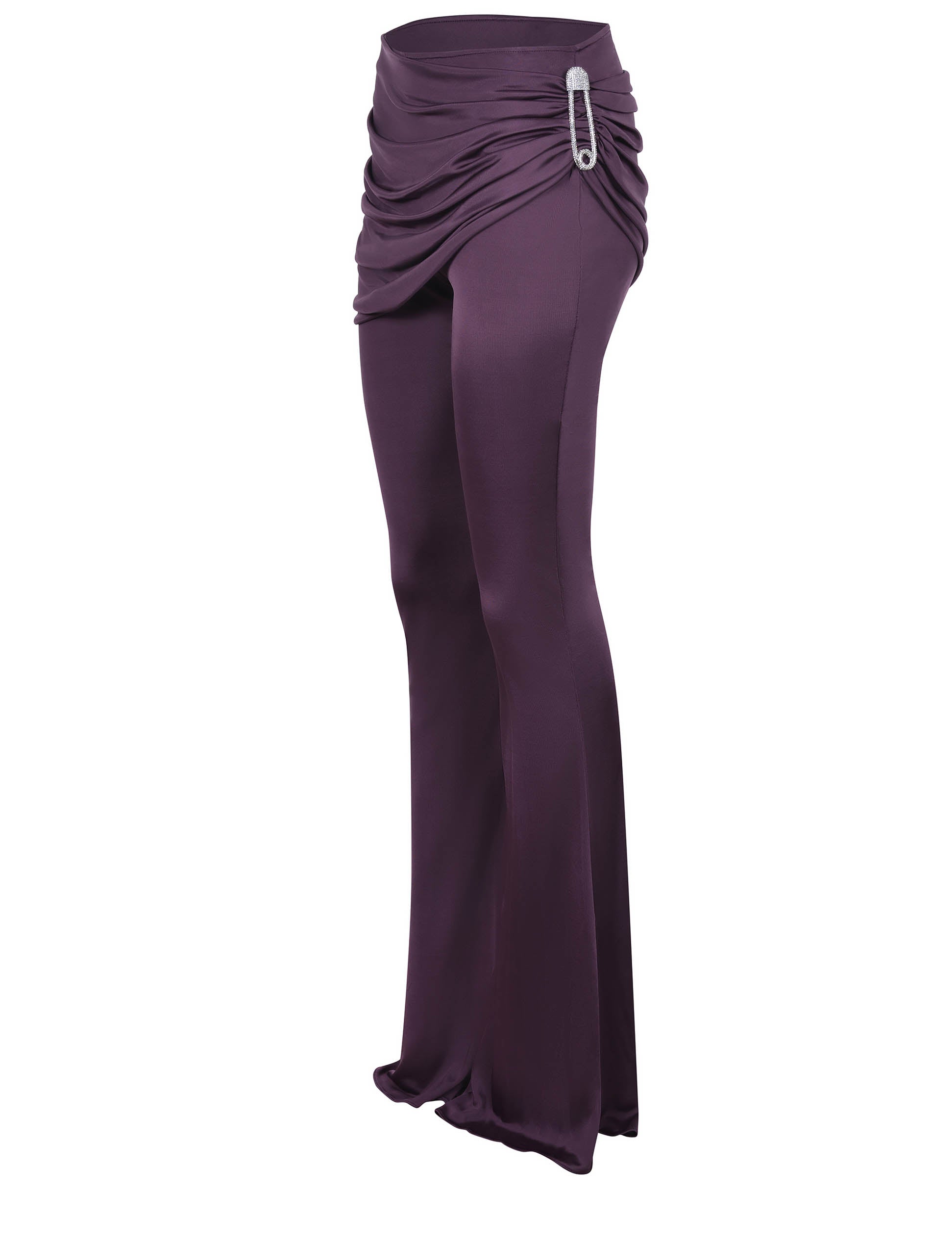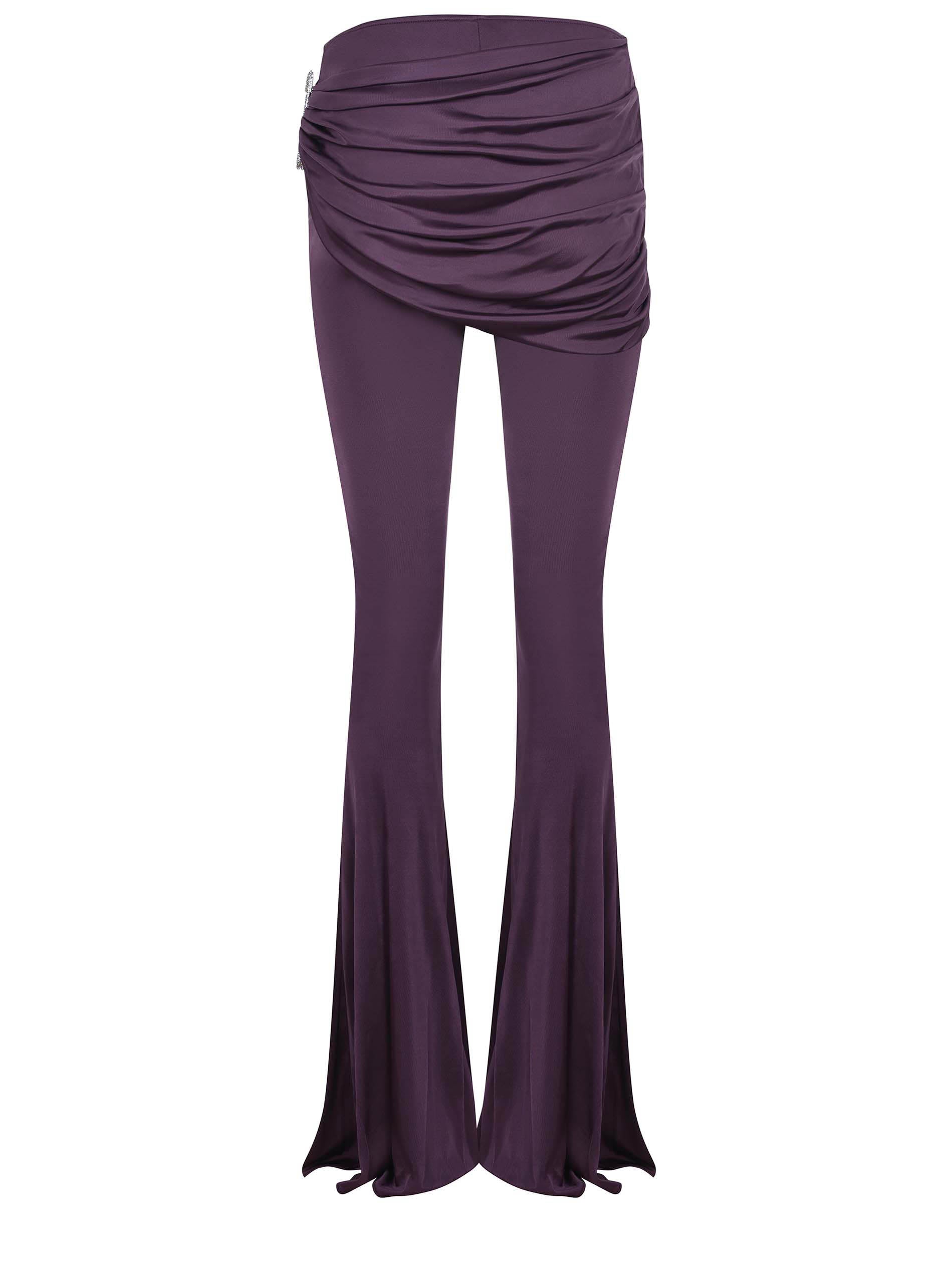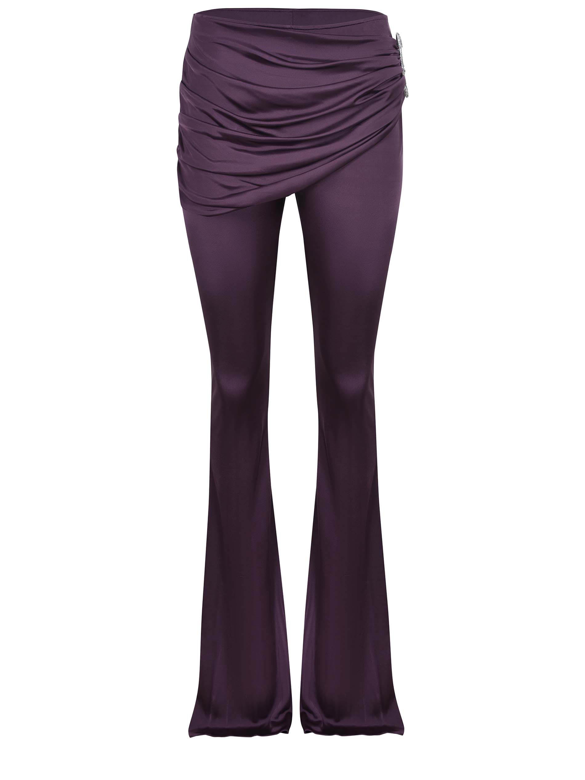 Giuseppe di Morabito pantalon en viscose violet. Détail d'une fausse jupe drapée à la taille. Broche métallique latérale recouverte de strass de couleur argentée. 100% visqueux fabriqué en Italie.