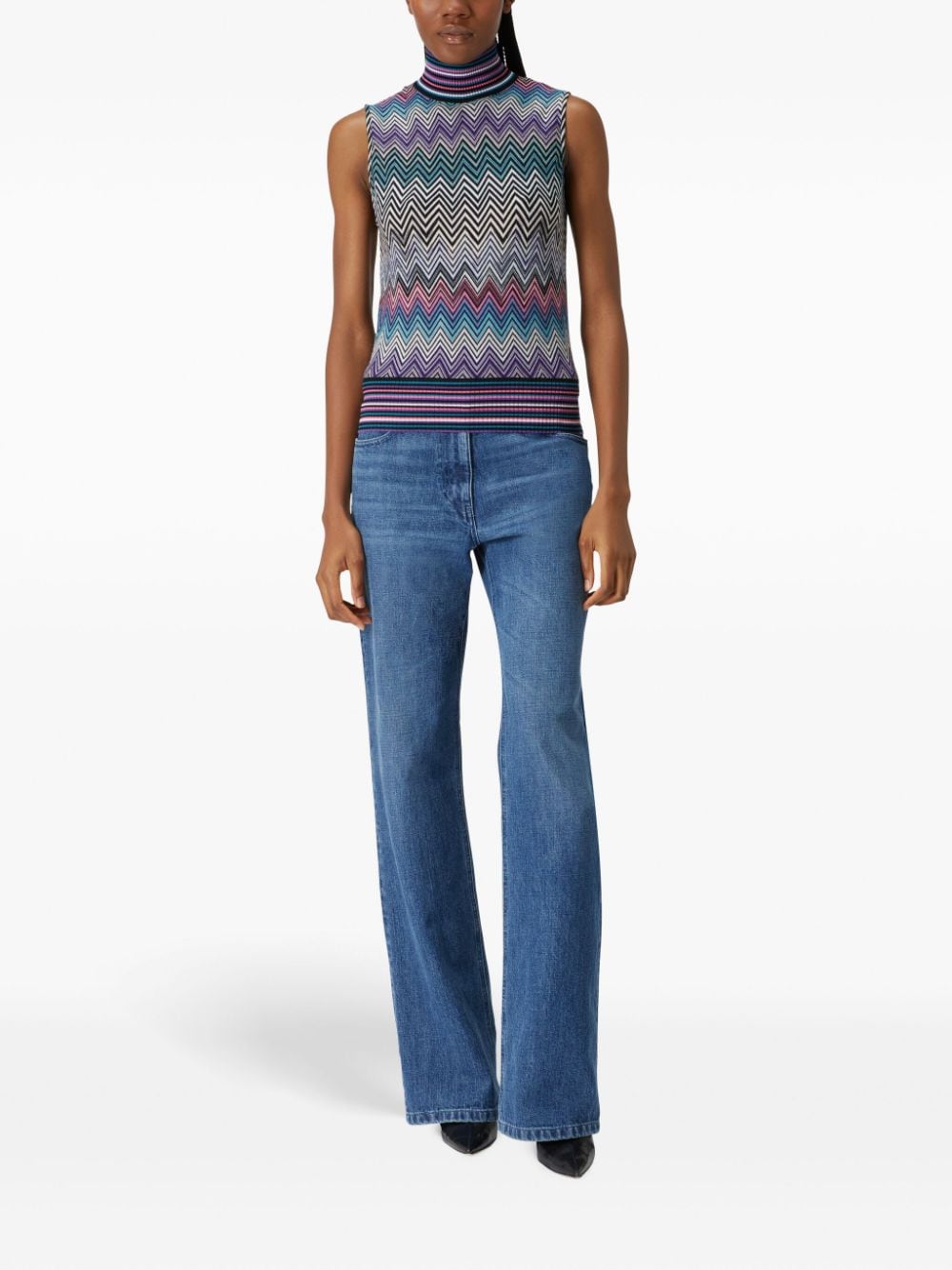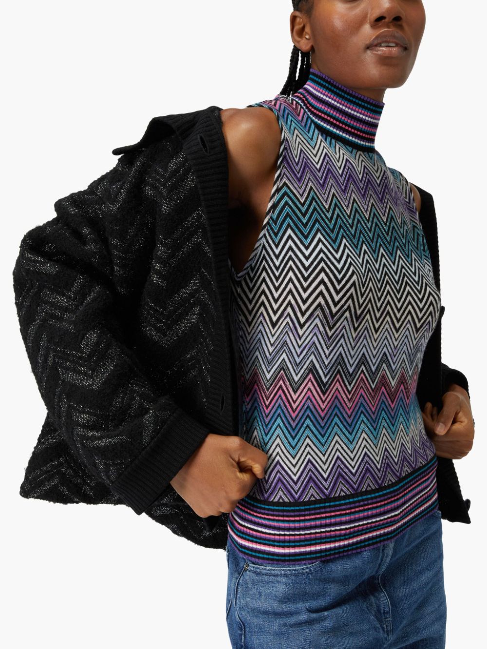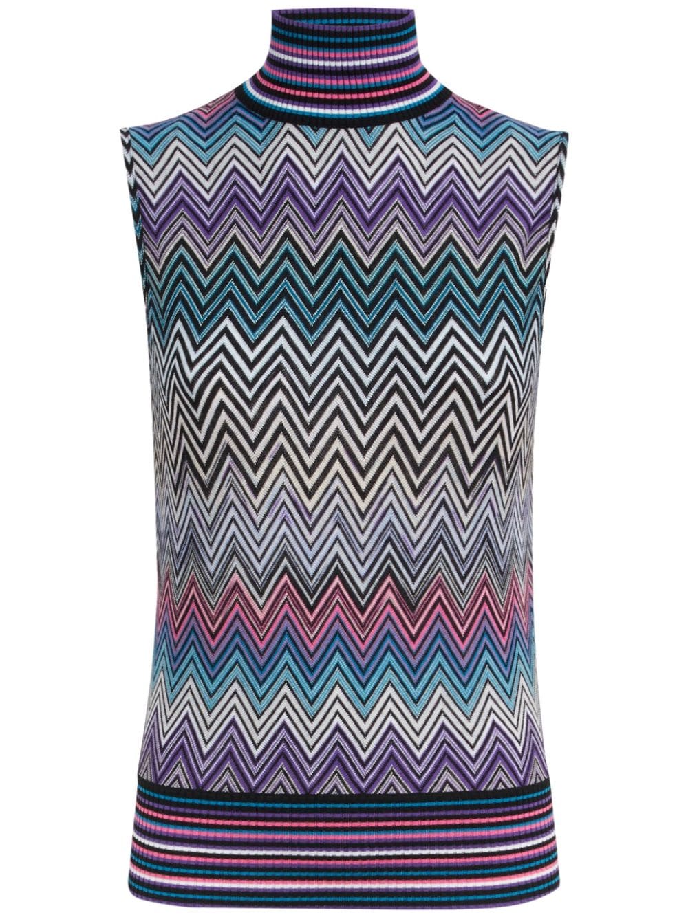 Purple Multicolour Tricoted Construction High Cou Signature Zigzag Le design tissé Sans manche ourlet Straitement l'objet L'article que vous recevez peut différer légèrement de l'article photographié. Cela est dû à la nature artisanale avec laquelle tous les produits missoni sont construits.