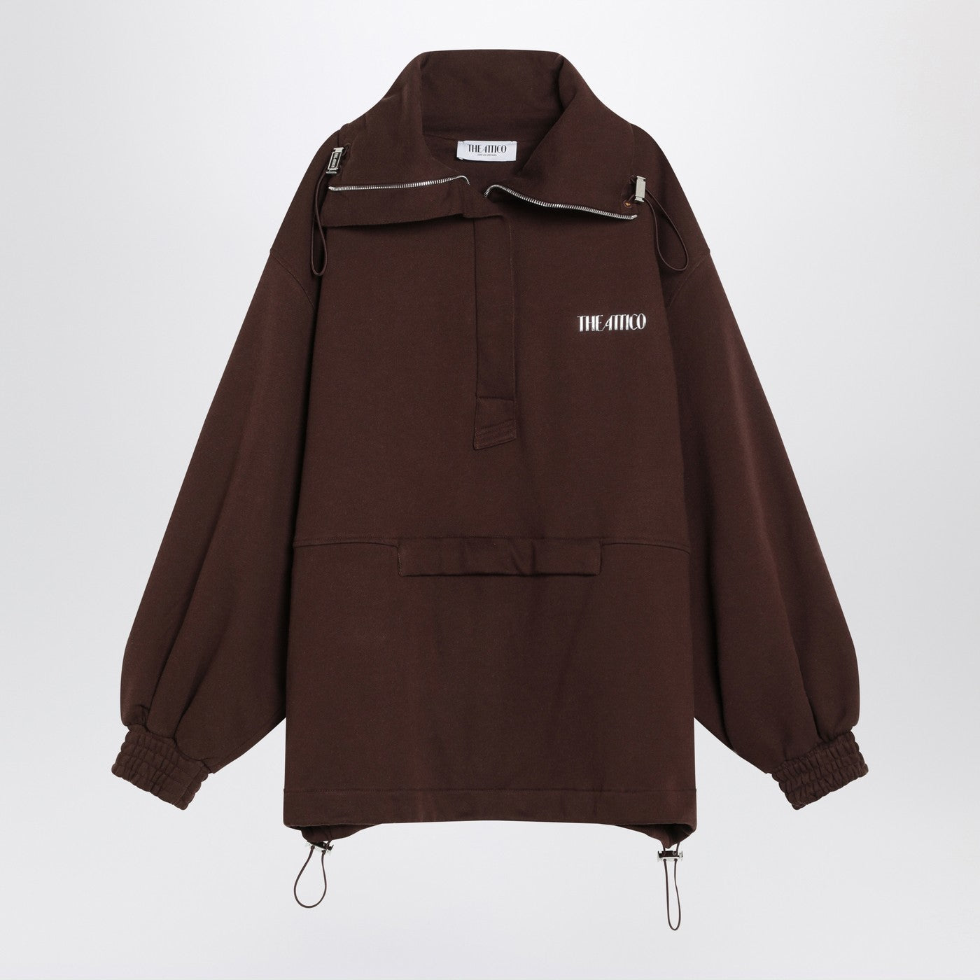 Brown cotton sweatshirt by The Attico, featuring logo lettering on the chest, drawstring neckline, long sleeves with elasticated cuffs, half zip closure at the front, and adjustable hem with drawstring.