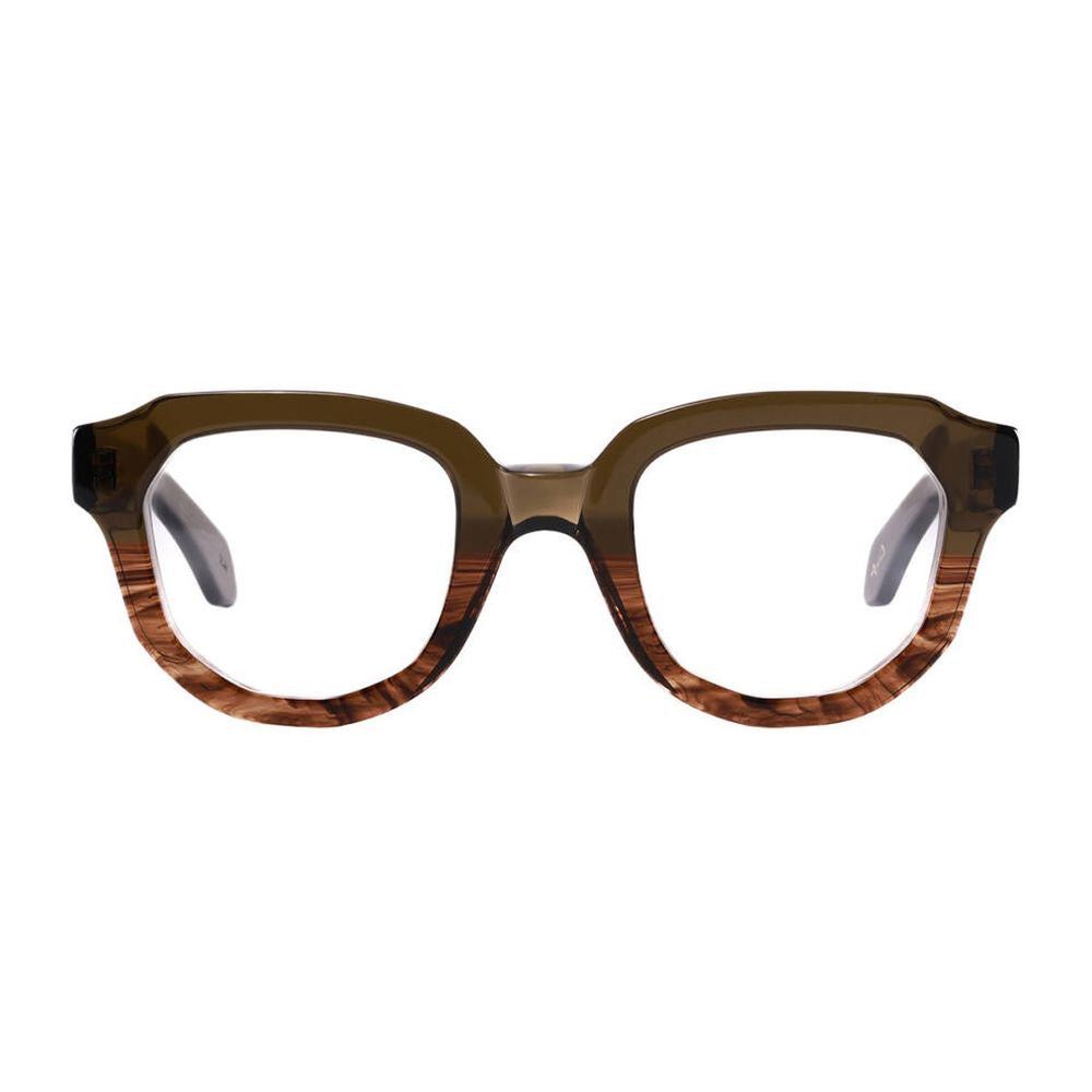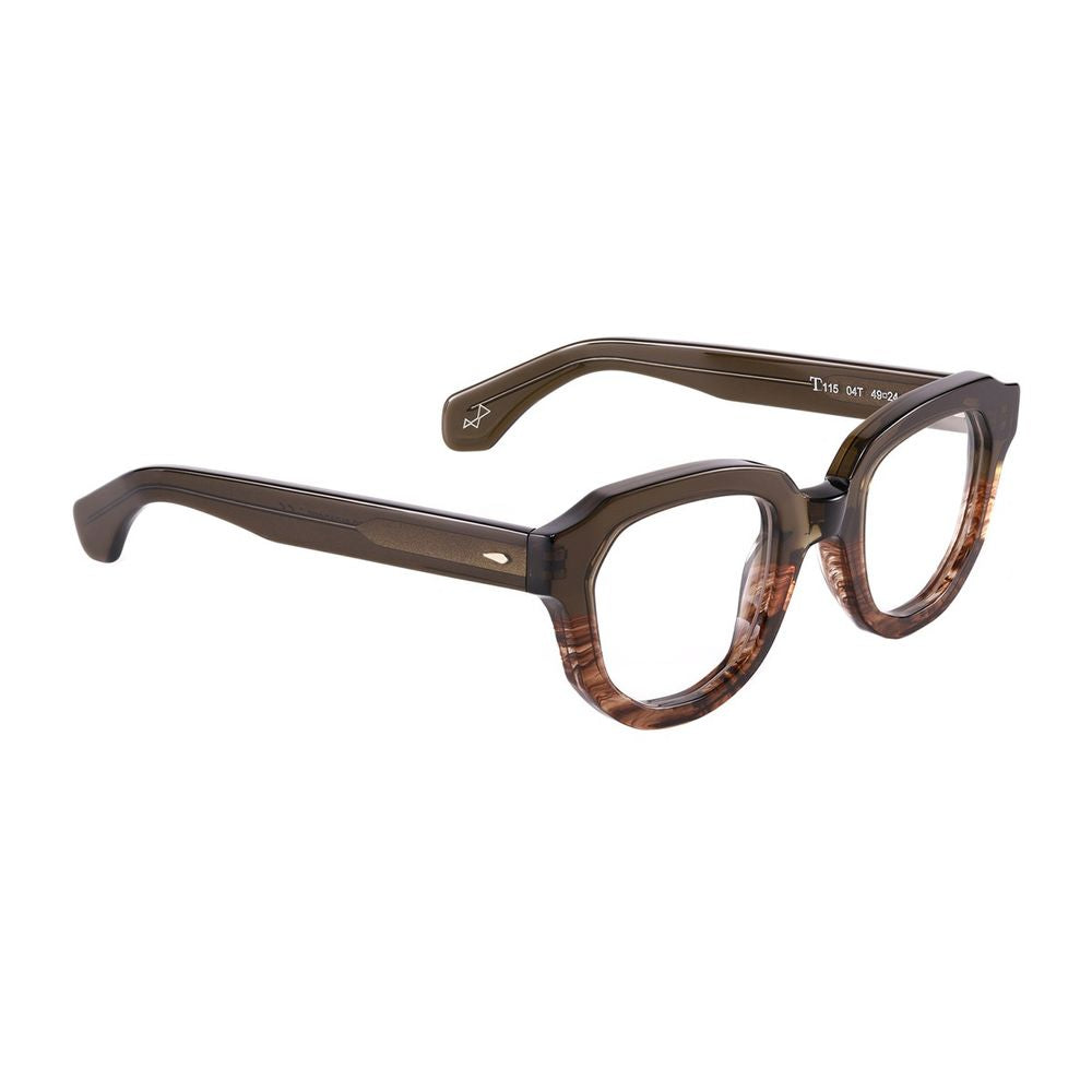 Costantino Toffoli est une entreprise italienne qui produit des lunettes artisanales en acétate de cellulose, alliant technologie de pointe et savoir-faire traditionnel. Fondée dans les années 1990 dans le quartier des lunettes Cadore, elle propose des collections allant des modèles classiques aux modèles vintage, caractérisés par un style distinctif et des détails raffinés. Le modèle T115 se distingue par sa forme carrée aux bords arrondis, équilibrant parfaitement modernité et style rétro. La monture en acétate bicolore associe une partie supérieure verte transparente à une partie inférieure marron effet bois, créant un contraste élégant et raffiné.