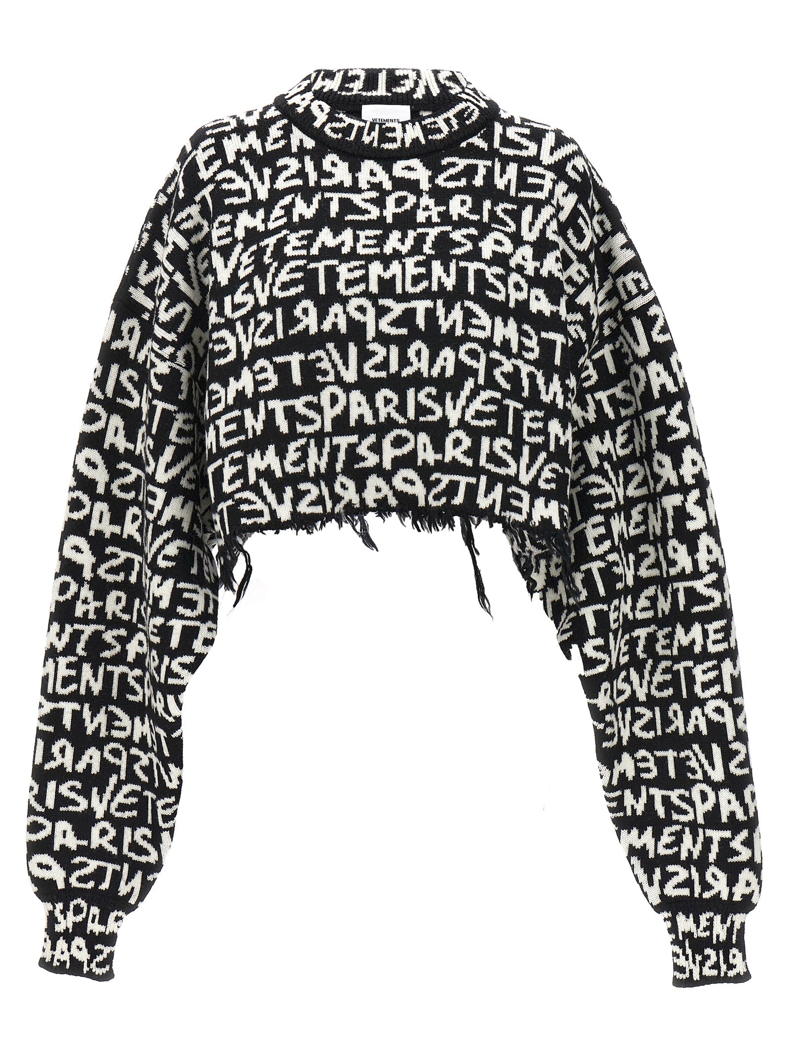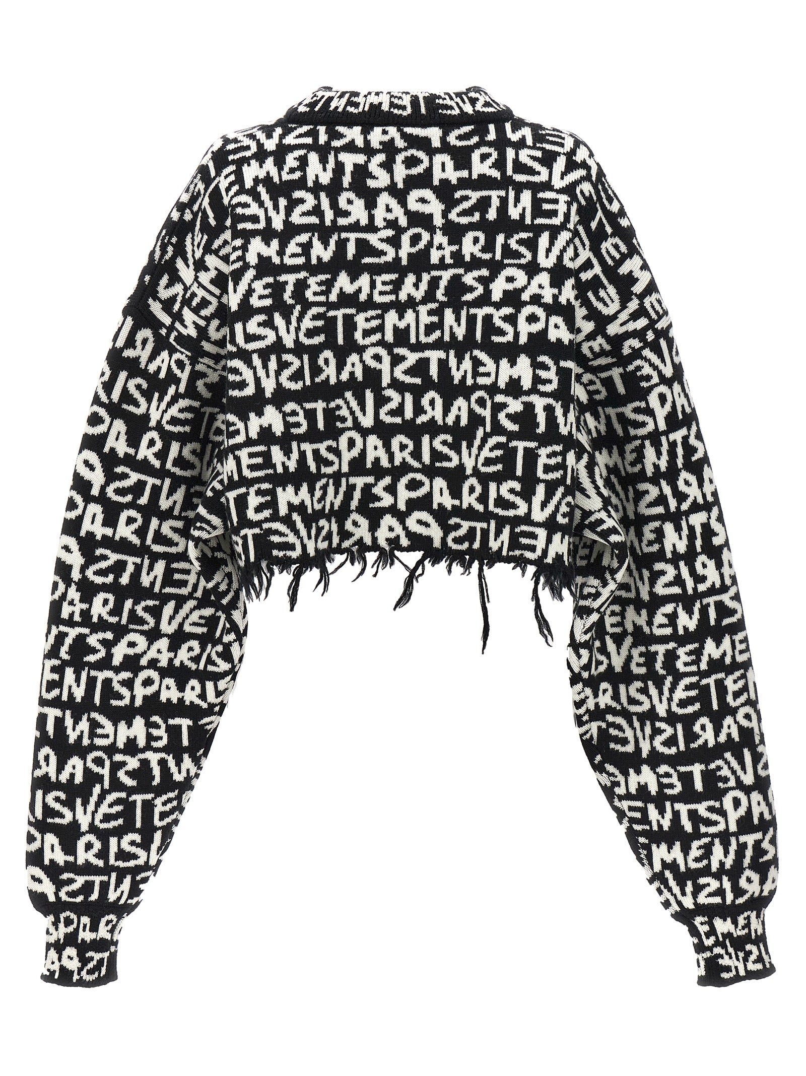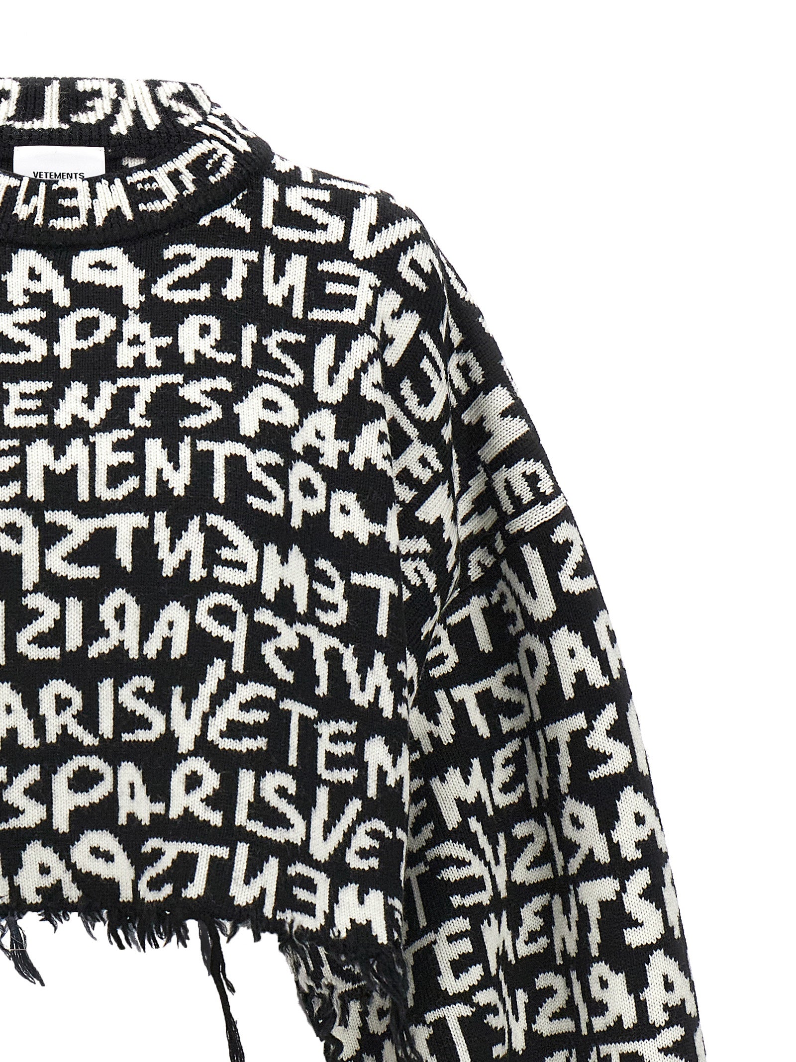 Pull en laine avec motif de logo «Graffiti Monogram», cou de l'équipage, manches à remise à long terme, longueur recadrée, ourlet effiloché.
