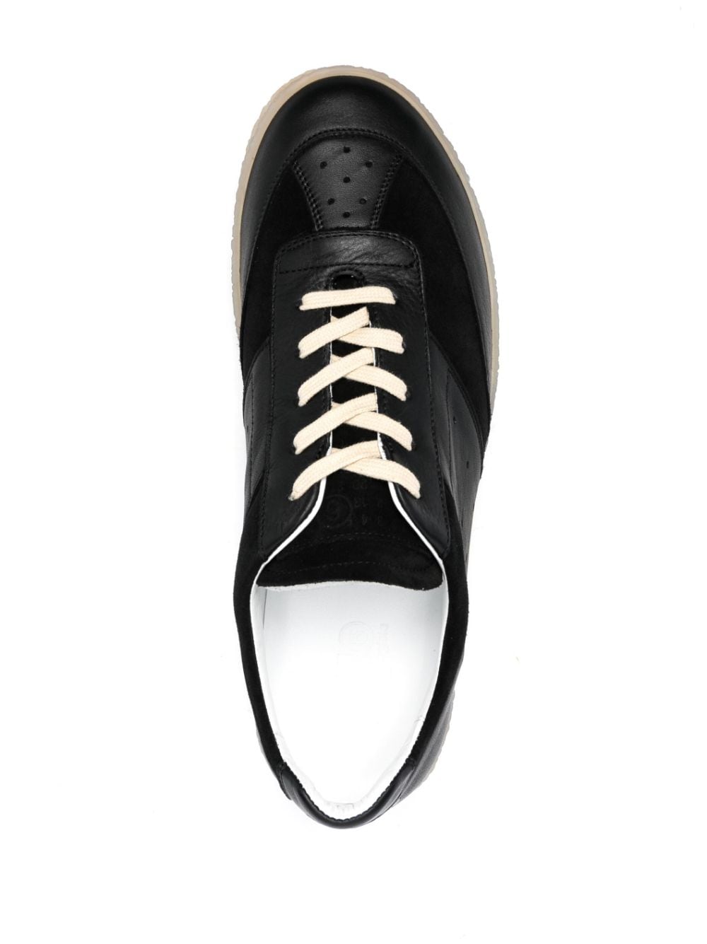 baskets à haut lambrissées de MM6 Maison Margiela avec noir, cuir de veau, design lambrissé, détaillants perforés, semelle intérieure de marque, orteil rond, attache à lacets avant et semelle en caoutchouc plat.