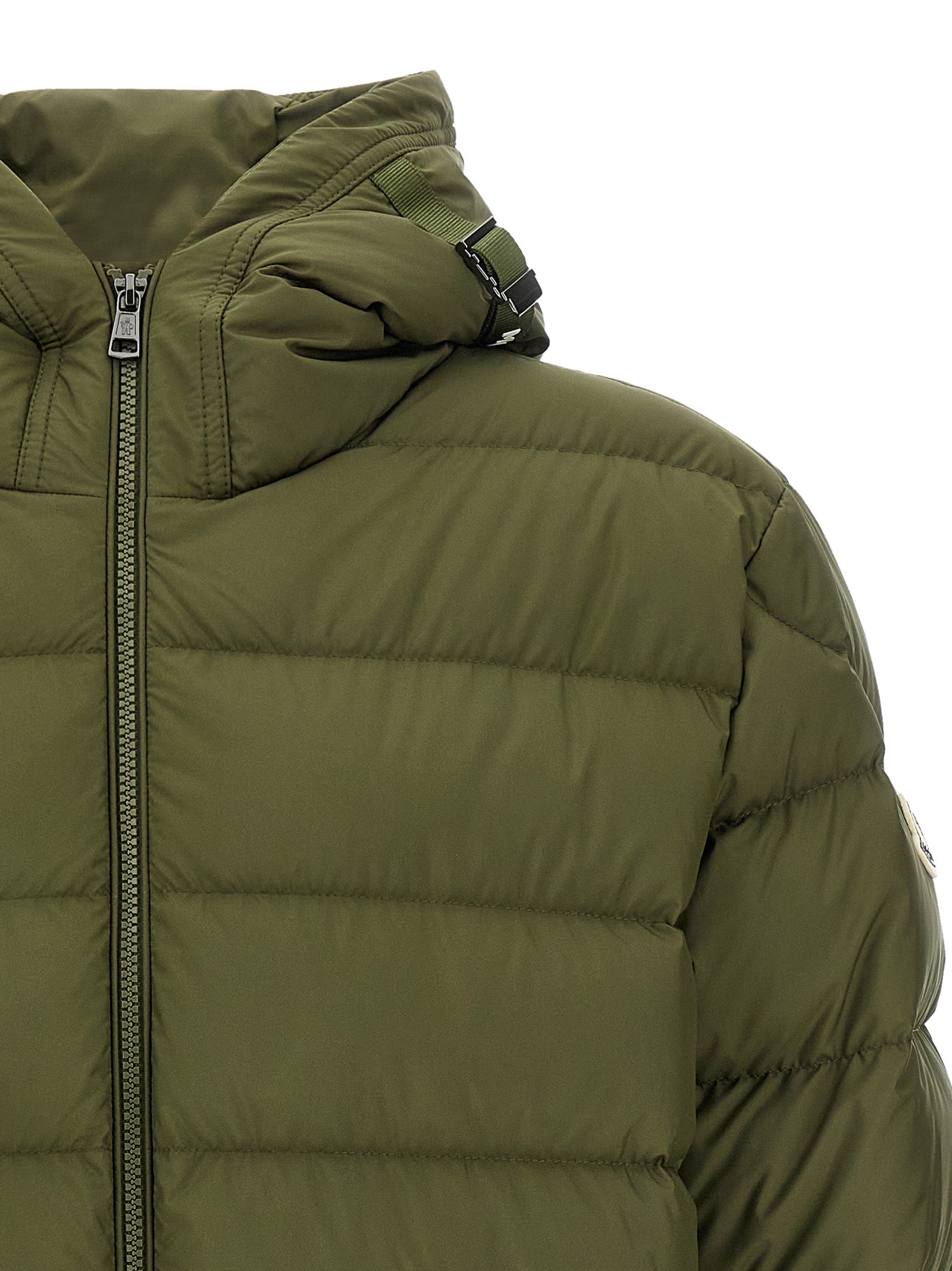Doudoune courte en polyester matelassée et rembourrée de plumes d'oie "Laveraet", capuche réglable avec bande logotypée, fermeture zippée sur le devant, poches, manches longues à revers et patch logo en feutre, cordon de serrage à la base.