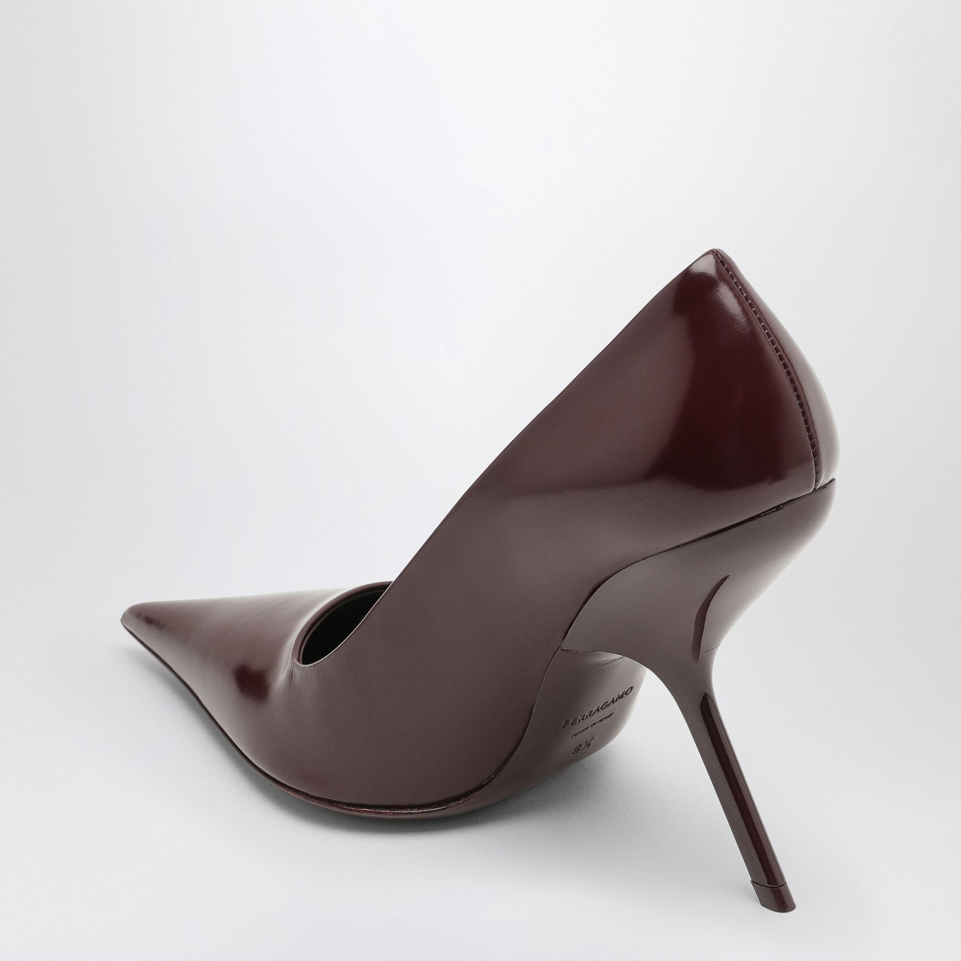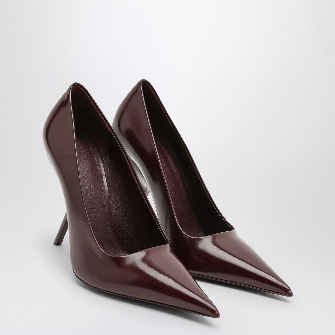 Pompes en cuir breveté bordeaux par Ferragamo avec un design à bout pointu, un talon haut profilé et une semelle en cuir.