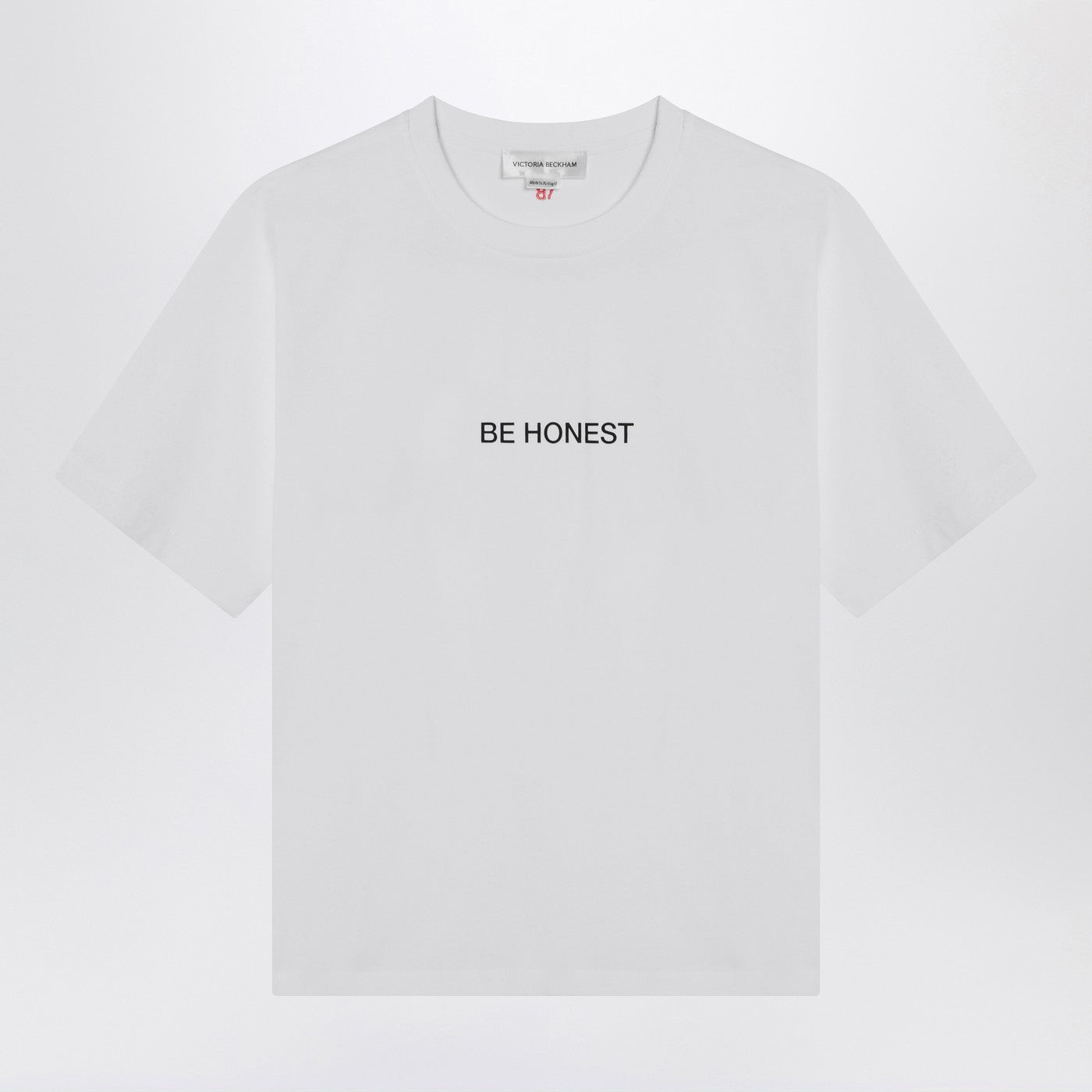 White cotton Victoria Beckham crewneck T-shirt featuring short sleeves, a contrasting Be Honest slogan on the front, a small logo on the back and a straight hem.
