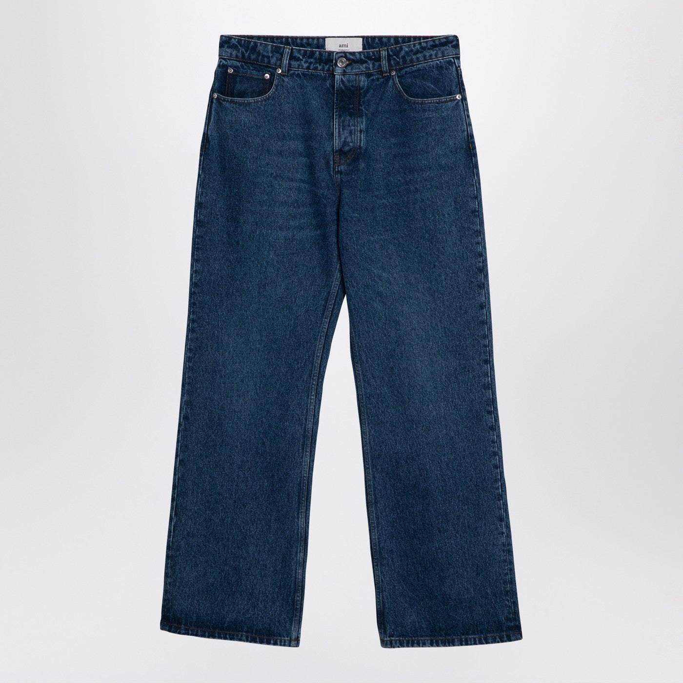 Les jeans en denim en coton bleu d'AMI Paris avec une fermeture à fermeture éclair et de bouton avant, des boucles de ceinture à la taille, cinq poches classiques et un patch de logo arrière.